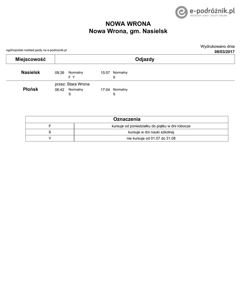 NOWA WRONA Nowa Wrona, gm. Nasielsk Wydrukowano dnia 08/03/2017 ogólnopolski rozkład jazdy na e-podroznik.pl Miejscowość Odjazdy Nasielsk 09:26 Normalny F Y 15:57 Normalny S przez: Stara Wrona Płońsk 06:42 Normalny S 17:04 Normalny S Oznaczenia F kursuje od poniedziałku do piątku w dni robocze S kursuje w dni nauki szkolnej Y nie kursuje od 01.07 do 31.08