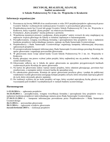 DECYDUJĘ, REALIZUJĘ, SZANUJĘ budżet uczniowski w Szkole Podstawowej Nr 2 im. św. Wojciecha w Krakowie Informacje organizacyjne 1. Przeznacza się kwotę 3000,00 zł na zrealizowanie w roku 2015 projektu/projektów zgłoszonych przez Uczniów Szkoły i wybranych do realizacji przez Uczniów w powszechnym głosowaniu. 2. Projektodawcą może być Uczeń lub grupa Uczniów Szkoły Podstawowej Nr 2 im. św. Wojciecha w Krakowie, który wypełnił „Kartę projekt” na właściwym formularzu. 3. Formularze „Karty projektu” można pobierać z portierni. 4. Wypełnioną starannym pismem i podpisaną „Kartę projektu” należy wrzucić do urny znajdującej się naprzeciw wejścia głównego do Szkoły w terminie zapisanym w harmonogramie. 5. Porządkowaniem, wstępną weryfikacją formalną i sporządzeniem listy projektów wraz z nadaniem każdemu projektowi indywidualnego numeru, zajmuje się Rada Samorządu Uczniowskiego. 6. Projektodawcy i Rada Samorządu Uczniowskiego organizują kampanię informacyjną dotyczącą zgłoszonych projektów. 7. Po przeprowadzeniu kampanii informacyjnej, Rada Samorządu Uczniowskiego powołuję Komisję do spraw głosowania i organizuje powszechne głosowanie. 8. W głosowaniu może wziąć udział każdy Uczeń Szkoły Podstawowej Nr 2 im. św. Wojciecha w Krakowie. 9. Każdy głosujący ma prawo wybrać jeden projekt, który najbardziej mu się podoba i chciałby, aby został zrealizowany. 10. Głosowanie odbywa się w lokalu do spraw głosowania na specjalnie przygotowanych kartkach wydawanych przez Komisję do spraw głosowania. 11. Na kartce do głosowania należy wpisać numer projektu, który zdaniem głosującego, powinien być zrealizowany, a następnie należy wrzucić kartkę do specjalnej urny. 12. Po zakończeniu głosowania, Komisja do spraw głosowania przelicza głosy i podaje do publicznej wiadomości wyniki głosowania szeregując kolejne projekty od tych, które otrzymały najwięcej głosów do tych, które otrzymały głosów najmniej. 13. Do realizacji wybiera się po kolei projekty od tego, który uzyskał największą liczbę głosów aż do wyczerpania puli środków wyodrębnionych w ramach budżetu uczniowskiego. Harmonogram 1-15.10.2014 r. – zgłaszanie projektów 16-24.10.2014 r. - porządkowanie, wstępna weryfikacja formalna i sporządzenie listy projektów wraz z nadaniem każdemu projektowi indywidualnego numeru przez Radę Samorządu Uczniowskiego 27.10-21.11.2014 r. – kampania informacyjna prowadzona przez Projektodawców i Radę Samorządu Uczniowskiego 26.11.2014 r. – powszechne głosowanie 28.11.2014 r. – ogłoszenie wyników głosowania styczeń-kwiecień 2015 r. – realizacja projektów …………………………………………… Numer projektu nadaje RSU KARTA PROJEKTU 1. Tytuł projektu (Nadaj nazwę temu, co chcesz/co chcecie zrobić): ………………………………………………………………………………………….…………………….. 2. Co chcę/chcemy zrobić? (Opisz/opiszcie krótko, co chcesz/co chcecie zrobić?): ………………………………………………………………………………………………………………… ………………………………………………………………………………………………………………… ………………………………………………………………………………………………………………… ………………………………………………………………………………………………………………… ………………………………………………………………………………………………………………… ………………………………………………………………………………………………………………… ………………………………………………………………………………………………………………… ………………………………………………………………………………………………………………… 3. Ile to będzie kosztować? (Napisz/napiszcie ile potrzeba pieniędzy, aby projekt zrealizować.): Wyliczyłam/em/Wyliczyliśmy, że aby zrealizować mój/nasz projekt, potrzebuję ………………………zł, słownie: ………………………………………………………………………….... 4. Uzasadnij/uzasadnijcie, skąd wzięła się taka kwota (Napisz/napiszcie szczegółowy kosztorys realizacji projektu.) Realizacja projektu będzie tyle kosztować, bo trzeba kupić: Lp. Co trzeba kupić? Ile tego trzeba kupić? Ile sztuk? Ile kosztuje sztuka? jedna zł zł zł zł zł zł zł RAZEM (Po zsumowaniu wszystkich pozycji, w polu obok powinna znaleźć się kwota, która zapisana została w punkcie 3) Ile kosztują wszystkie sztuki zł zł zł zł zł zł zł 5. Uzasadnij/uzasadnijcie, dlaczego Twój/Wasz projekt powinien być zrealizowany. (Napisz/napiszcie, jakich argumentów użyjecie, aby przekonać Kolegów, by zagłosowali za Twoim/Waszym projektem.) Uważam/Uważamy, że mój/nasz projekt powinien być zrealizowany, ponieważ ………………………………………………………………………………………………………………… ………………………………………………………………………………………………………………… ………………………………………………………………………………………………………………… ………………………………………………………………………………………………………………… ………………………………………………………………………………………………………………… ………………………………………………………………………………………………………………… ……