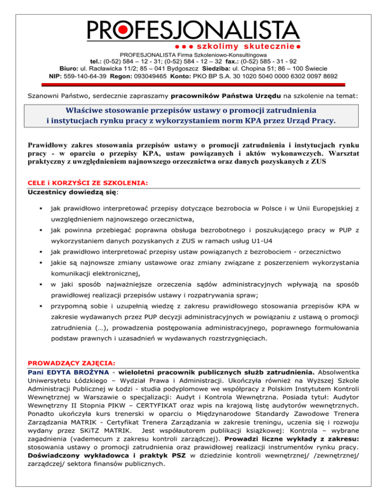 PROFESJONALISTA Firma Szkoleniowo-Konsultingowa tel.: (0-52) 584 – 12 - 31; (0-52) 584 - 12 – 32 fax.: (0-52) 585 - 31 - 92 Biuro: ul. Racławicka 11/2; 85 – 041 Bydgoszcz Siedziba: ul. Chopina 51; 86 – 100 Świecie NIP: 559-140-64-39 Regon: 093049465 Konto: PKO BP S.A. 30 1020 5040 0000 6302 0097 8692 Szanowni Państwo, serdecznie zapraszamy pracowników Państwa Urzędu na szkolenie na temat: Właściwe stosowanie przepisów ustawy o promocji zatrudnienia i instytucjach rynku pracy z wykorzystaniem norm KPA przez Urząd Pracy. Prawidłowy zakres stosowania przepisów ustawy o promocji zatrudnienia i instytucjach rynku pracy - w oparciu o przepisy KPA, ustaw powiązanych i aktów wykonawczych. Warsztat praktyczny z uwzględnieniem najnowszego orzecznictwa oraz danych pozyskanych z ZUS CELE i KORZYŚCI ZE SZKOLENIA: Uczestnicy dowiedzą się: jak prawidłowo interpretować przepisy dotyczące bezrobocia w Polsce i w Unii Europejskiej z uwzględnieniem najnowszego orzecznictwa, jak powinna przebiegać poprawna obsługa bezrobotnego i poszukującego pracy w PUP z wykorzystaniem danych pozyskanych z ZUS w ramach usług U1-U4 jak prawidłowo interpretować przepisy ustaw powiązanych z bezrobociem - orzecznictwo jakie są najnowsze zmiany ustawowe oraz zmiany związane z poszerzeniem wykorzystania komunikacji elektronicznej, w jaki sposób najważniejsze orzeczenia sądów administracyjnych wpływają na sposób prawidłowej realizacji przepisów ustawy i rozpatrywania spraw; przypomną sobie i uzupełnią wiedzę z zakresu prawidłowego stosowania przepisów KPA w zakresie wydawanych przez PUP decyzji administracyjnych w powiązaniu z ustawą o promocji zatrudnienia (…), prowadzenia postępowania administracyjnego, poprawnego formułowania podstaw prawnych i uzasadnień w wydawanych rozstrzygnięciach. PROWADZĄCY ZAJĘCIA: Pani EDYTA BROŻYNA - wieloletni pracownik publicznych służb zatrudnienia. Absolwentka Uniwersytetu Łódzkiego – Wydział Prawa i Administracji. Ukończyła również na Wyższej Szkole Administracji Publicznej w Łodzi - studia podyplomowe we współpracy z Polskim Instytutem Kontroli Wewnętrznej w Warszawie o specjalizacji: Audyt i Kontrola Wewnętrzna. Posiada tytuł: Audytor Wewnętrzny II Stopnia PIKW – CERTYFIKAT oraz wpis na krajową listę audytorów wewnętrznych. Ponadto ukończyła kurs trenerski w oparciu o Międzynarodowe Standardy Zawodowe Trenera Zarządzania MATRIK - Certyfikat Trenera Zarządzania w zakresie treningu, uczenia się i rozwoju wydany przez SKiTZ MATRIK. Jest współautorem publikacji książkowej: Kontrola – wybrane zagadnienia (vademecum z zakresu kontroli zarządczej). Prowadzi liczne wykłady z zakresu: stosowania ustawy o promocji zatrudnienia oraz prawidłowej realizacji instrumentów rynku pracy. Doświadczony wykładowca i praktyk PSZ w dziedzinie kontroli wewnętrznej/ /zewnętrznej/ zarządczej/ sektora finansów publicznych. FORMA SZKOLENIA: - szeroki wykład merytoryczny poparty ciekawą prezentacją multimedialną oraz licznymi praktycznymi ćwiczeniami warsztatowymi, a na zakończenie wspólna dyskusja podsumowującą efekty kształcenia. FORMA ZALICZENIA: - bez egzaminu; ankieta ewaluacyjna CZAS TRWANIA – 3 dni pobytu - 2 dni szkoleniowe/ 16 godzin lekcyjnych MIEJSCE SZKOLENIA – TORUŃ – hotel/pensjonat – standard*** Dzień I – 19/04/2017 Przyjazd i zakwaterowanie uczestników - do godz 15:00. Kolacja ok. godz. 20:00 Dzień II – III – 20-21/04/2017 GODZINOWY HARMONOGRAM ZAJĘĆ: Godzina 9:00 – 11:00 11:00 – 11:30 11:30 – 13:30 13:30 – 14:30 14:30 – 16:30 20:00 Suma 20/04/2017 Zajęcia Przerwa kawowa Zajęcia Lunch Zajęcia Kolacja 8 godz lekcyjnych - 360 min 21/04/2017 Zajęcia Przerwa kawowa Zajęcia Lunch Zajęcia X 8 godz lekcyjnych - 360 min Plan nauczania i treść nauczania DZIEŃ I - Zadania powiatowych urzędów pracy w zakresie stosowania ustawy o promocji zatrudnienia i instytucjach rynku pracyz uwzględnieniem orzecznictwa sądów administracyjnych 1. Ustawa o promocji zatrudnienia i instytucjach rynku pracy w 2017r. – istotne zmiany, wyjaśnienia ministerialne, interpretacje; 2. Status osoby bezrobotnej – ustalenie statusu, badanie zdolności i gotowości do podjęcia zatrudnienia, gospodarstwo rolne, wpis do ewidencji działalności gospodarczej, podleganie ubezpieczeniu społecznemu na podstawie odrębnych przepisów – najnowsze orzecznictwo WSA 3. Status bezrobotnego, a prawidłowa weryfikacja danych w SI SYRIUSZ z wykorzystaniem usługi ZUS – U1-U2-U3. 4. Zdania Powiatowego Urzędu Pracy w zakresie wydawania decyzji administracyjnych. 5. Wyznaczanie wizyt, profilowanie, IPD, stawiennictwo – obowiązek, skierowania do aktywnych form – orzeczenia sądów administracyjnych. 6. Badanie zdolności i gotowości do podjęcia pracy (m.in. rejestracja po porodzie, szczególne przypadki mające wpływ na utrzymanie statusu) – najnowsze orzecznictwo 7. Formy aktywizacji osób bezrobotnych i poszukujących pracy zgodnie z ustawą o promocji zatrudnienia i aktami wykonawczymi – prawidłowa realizacja, problemy, wyjaśnienia MRPiPS, UOKIK, najnowsze orzecznictwo. 8. Podstawy utraty statusu osoby bezrobotnej i osoby poszukującej pracy (m.in. niestawiennictwo, odmowa przyjęcia propozycji pracy, niepodjęcie pracy po skierowaniu, przerwanie formy pomocy, utrata statusu na wniosek, zbiegi tytułów ubezpieczenia). 9. Rozstrzygnięcia merytoryczne czyli zasady przyznawania świadczeń wynikające z ustawy o promocji zatrudnienia i instytucjach rynku pracy oraz rozporządzeń wykonawczych, pytania i problemy 10. Okresy zaliczane do okresu uprawniającego do zasiłku w świetle najnowszego orzecznictwa 11. Kontynuacja zasiłku na podstawie art. 73 ust. 5 i 7 ustawy o promocji zatrudnienia. 12. Nienależnie pobrane świadczenia, stosowanie art. 76 ustawy z dnia 20 kwietnia 2004 r. o promocji zatrudnienia i instytucjach rynku pracy w praktyce oraz windykacja nienależnie p