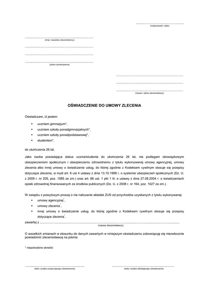 ....................................................... (miejscowość i data) .............................................................................. (imię i nazwisko zleceniobiorcy) .............................................................................. .............................................................................. .............................................................................. (adres zamieszkania) ............................................................................ ............................................................................ ............................................................................ (nazwa i adres zleceniodawcy) OŚWIADCZENIE DO UMOWY ZLECENIA Oświadczam, iż jestem: uczniem gimnazjum*, uczniem szkoły ponadgimnazjalnych*, uczniem szkoły ponadpodstawowej*, studentem*, do ukończenia 26 lat. Jako osoba posiadająca status ucznia/studenta do ukończenia 26 lat, nie podlegam obowiązkowym ubezpieczeniom społecznym i ubezpieczeniu zdrowotnemu z tytułu wykonywanej umowy agencyjnej, umowy zlecenia albo innej umowy o świadczenie usług, do której zgodnie z Kodeksem cywilnym stosuje się przepisy dotyczące zlecenia, w myśl art. 6 ust 4 ustawy z dnia 13.10.1998 r. o systemie ubezpieczeń społecznych (Dz. U. z 2009 r. nr 205, poz. 1585 ze zm.) oraz art. 66 ust. 1 pkt 1 lit. e ustawy z dnia 27.08.2004 r. o świadczeniach opieki zdrowotnej finansowanych ze środków publicznych (Dz. U. z 2008 r. nr 164, poz. 1027 ze zm.). W związku z powyższym proszę o nie naliczanie składek ZUS od przychodów uzyskanych z tytułu wykonywanej: * umowy agencyjnej , umowy zlecenia , innej umowy o świadczenie usług, do której zgodnie z Kodeksem cywilnym stosuje się przepisy * * dotyczące zlecenia , zawartej z ............................................................................................................................................................... (nazwa zleceniodawcy) O wszelkich zmianach w stosunku do danych zawartych w niniejszym oświadczeniu zobowiązuję się niezwłocznie powiadomić zleceniodawcę na piśmie. * niepotrzebne skreślić .................................................................... (data i podpis przyjmującego oświadczenie) ....................................................................... (data i podpis składającego oświadczenie)