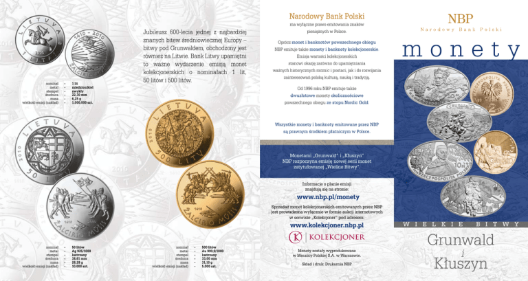 Narodowy Bank Polski nominał metal stempel średnica masa wielkość emisji (nakład) – – – – – – 1 lit miedzionikiel zwykły 22,30 mm 6,25 g 1.000.000 szt. Jubileusz 600-lecia jednej z najbardziej znanych bitew średniowiecznej Europy – bitwy pod Grunwaldem, obchodzony jest również na Litwie. Bank Litwy upamiętni to ważne wydarzenie emisją monet kolekcjonerskich o nominałach 1 lit, 50 litów i 500 litów. ma wyłączne prawo emitowania znaków pieniężnych w Polsce. Oprócz monet i banknotów powszechnego obiegu NBP emituje także monety i banknoty kolekcjonerskie. Emisja wartości kolekcjonerskich stanowi okazję zarówno do upamiętniania ważnych historycznych rocznic i postaci, jak i do rozwijania zainteresowań polską kulturą, nauką i tradycją. monety Od 1996 roku NBP emituje także dwuzłotowe monety okolicznościowe powszechnego obiegu ze stopu Nordic Gold. Wszystkie monety i banknoty emitowane przez NBP są prawnym środkiem płatniczym w Polsce. Monetami „Grunwald” i „Kłuszyn” NBP rozpoczyna emisję nowej serii monet zatytułowanej „Wielkie Bitwy”. Informacje o planie emisji znajdują się na stronie: www.nbp.pl/monety Sprzedaż monet kolekcjonerskich emitowanych przez NBP jest prowadzona wyłącznie w formie aukcji internetowych w serwisie „Kolekcjoner” pod adresem: www.kolekcjoner.nbp.pl nominał metal stempel średnica masa wielkość emisji (nakład) – – – – – – 50 litów Ag 925/1000 lustrzany 38,61 mm 28,28 g 10.000 szt. nominał metal stempel średnica masa wielkość emisji (nakład) – – – – – – 500 litów Au 999,9/1000 lustrzany 33,00 mm 31,10 g 5.000 szt. Monety zostały wyprodukowane w Mennicy Polskiej S.A. w Warszawie. Skład i druk: Drukarnia NBP W i e l k i e B i t w y Grunwald i Kłuszyn W i e l k i e Bitwa pod Grunwaldem 1410 ● Jedną z największych bitew w średniowiecznej Europie była bitwa pod Grunwaldem stoczona 15 lipca 1410 r. Polsko-litewskie siły dowodzone przez króla Władysława Jagiełłę liczyły około 45 tysięcy zbrojnych, głównie jazdy. Krzyżacy pod wodzą wielkiego mistrza Ulryka von Jungingena wystawili około 16 tysięcy jazdy i 5 tysięcy piechoty. Moment rozpoczęcia bitwy został wybrany przez króla, który opóźniając rozpoczęcie boju, doprowadził do zmęczenia Krzyżaków rozstawionych od rana w szykach bojowych. Około południa bitwa rozpoczęła się dwukrotnym wystrzałem z krzyżackich armat. W tym momencie do boju ruszyły oddziały litewsko-ruskie, które po wybiciu artylerzystów starły się z ciężkozbrojną jazdą zakonną. Po godzinnej walce Litwini rzucili się do ucieczki – prawdopodobnie był to celowy manewr, który miał za zadanie wciągnąć w pułapkę lewe skrzydło armii krzyżackiej. Wskazuje na to późniejszy powrót na pole bitwy wojsk litewskich, które wybiły rozsypanych w bezładnym pościgu nieprzyjaciół. ● Główne siły wojsk koronnych weszły do bitwy z pewnym opóźnieniem. Zgodnie z ówczesną taktyką poszczególne oddziały i chorągwie były uformowane w głębokie kolumny poprzedzane klinem złożonym z najlepszych rycerzy. Taki szyk zapewniał dużą manewrowość i umożliwiał wycofanie się chorągwi po nieudanej B i t w y : G r u n w a l d szarży, a także dawał możliwość zaopatrzenia się w nowe kopie w miejsce skruszonych. ● Po sześciogodzinnym boju Polacy, wsparci przez powracające oddziały litewskie księcia Witolda, otoczyli wojska zakonne. W walce poległ Ulryk von Jungingen i wielu dostojników zakonnych, a szeregi krzyżackie rzuciły się do panicznej ucieczki. Szturmem zdobyto otoczony wozami obóz krzyżacki. ● Po bitwie wyruszono pod Malbork, wówczas będący twierdzą nie do zdobycia. Po krótkim i bezskutecznym oblężeniu wojska Jagiełły powróciły do Polski. ● Rezultatem bitwy pod Grunwaldem był pokój zawarty w Toruniu w 1411 r. Choć warunki pokoju były niewspółmierne do skali zwycięstwa, to jednak satysfakcjonował on Polskę i Litwę, gdyż dawał im terytoria, o które toczyła się wojna. Bitwa pod Kłuszynem 1610 ● Bitwa pod Kłuszynem stanowiła apogeum trwającego 9 lat konfliktu polsko-moskiewskiego. Polska, realizując dynastyczne plany króla Zygmunta III Wazy, zaangażowała się w otwarty konflikt ze wschodnim sąsiadem. Wsparcie udzielone carowi przez króla Szwecji Karola IX skłoniło króla Zygmunta III do i rozpoczęcia we wrześniu 1609 r. działań wojennych w państwie moskiewskim. Pierwszym celem miało być zdobycie Smoleńska. W maju 1610 r. car rozpoczął przygotowania do odsieczy miasta – zgromadził ponad 30 tysięcy żołnierzy dowodzonych przez jego brata Dymitra Szujskiego i około 8 tysięcy cudzoziemskich sojuszników pod wodzą Jakuba de la Gardie, którzy po przejściu pod Kłuszyn stanęli w warownym obozie. W ich kierunku wyruszyło siedmiotysięczne polskie wojsko pod dowództwem hetmana Stanisława Żółkiewskiego. W większości była to jazda – husaria i lżej zbrojni kozacy. Po całonocnym marszu, 4 lipca przybyli pod Kłuszyn. ● O świcie husaria zaatakowała lewe skrzydło wojsk moskiewskich. Ataki następowały jeden po drugim, oddziały po starciu wycofywały się, by umożliwić szarżę kolejnym chorągwiom. Mijały godziny krwawego boju, a ciągłe ataki jazdy nie przynosiły rozstrzygnięcia. Wtedy zaatakowano prawe skrzydło moskiewskie złożone z wojsk cudzoziemskich, które stawiły twardy opór. ● Falowe ataki, w które hetman Żółkiewski zaangażował wszystkie dostępne siły, dały w końcu rezultat: Dymitr Szujski skierował do boju odwody – rajtarię stosującą tak zwany karakol. Taktyka ta polegała na tym, że oddział podjeżdżał jak najbliżej przeciwnika, po czym jego pierwszy szereg oddawał strzały K ł u s z y n z pistoletów i wycofywał się w tył formacji, aby dać możliwość oddania strzału kolejnemu szeregowi. Moment ten wykorzystały polskie wojska – jedynie pierwszy szer