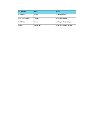 Oznaczenie Miasto Adres C.H. Malta Poznań ul. Maltańska 1 C.H. Stary Browar Poznań ul. Półwiejska 42 C.H. Plaza Poznań ul. Kaspra Drużbickiego 2 Outlet Komorniki ul. Krzysztofa Kolumba 8