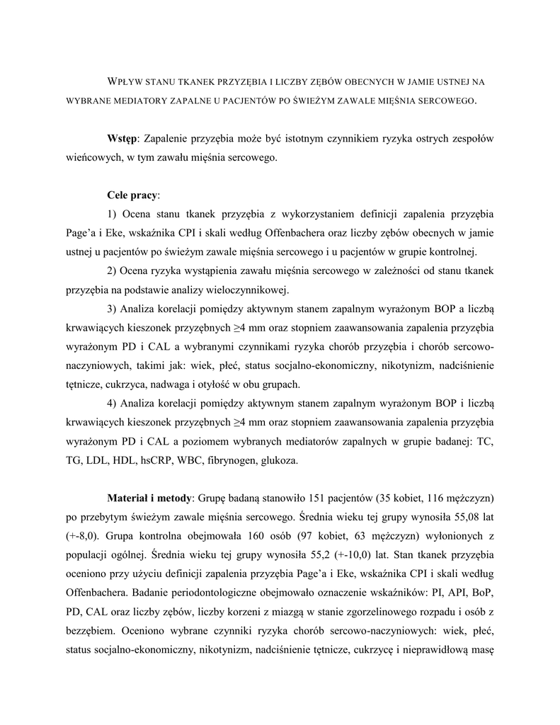 WPŁYW STANU TKANEK PRZYZĘBIA I LICZBY ZĘBÓW OBECNYCH W JAMIE USTNEJ NA WYBRANE MEDIATORY ZAPALNE U PACJENTÓW PO ŚWIEŻYM ZAWALE MIĘŚNIA SERCOWEGO . Wstęp: Zapalenie przyzębia może być istotnym czynnikiem ryzyka ostrych zespołów wieńcowych, w tym zawału mięśnia sercowego. Cele pracy: 1) Ocena stanu tkanek przyzębia z wykorzystaniem definicji zapalenia przyzębia Page’a i Eke, wskaźnika CPI i skali według Offenbachera oraz liczby zębów obecnych w jamie ustnej u pacjentów po świeżym zawale mięśnia sercowego i u pacjentów w grupie kontrolnej. 2) Ocena ryzyka wystąpienia zawału mięśnia sercowego w zależności od stanu tkanek przyzębia na podstawie analizy wieloczynnikowej. 3) Analiza korelacji pomiędzy aktywnym stanem zapalnym wyrażonym BOP a liczbą krwawiących kieszonek przyzębnych ≥4 mm oraz stopniem zaawansowania zapalenia przyzębia wyrażonym PD i CAL a wybranymi czynnikami ryzyka chorób przyzębia i chorób sercowonaczyniowych, takimi jak: wiek, płeć, status socjalno-ekonomiczny, nikotynizm, nadciśnienie tętnicze, cukrzyca, nadwaga i otyłość w obu grupach. 4) Analiza korelacji pomiędzy aktywnym stanem zapalnym wyrażonym BOP i liczbą krwawiących kieszonek przyzębnych ≥4 mm oraz stopniem zaawansowania zapalenia przyzębia wyrażonym PD i CAL a poziomem wybranych mediatorów zapalnych w grupie badanej: TC, TG, LDL, HDL, hsCRP, WBC, fibrynogen, glukoza. Materiał i metody: Grupę badaną stanowiło 151 pacjentów (35 kobiet, 116 mężczyzn) po przebytym świeżym zawale mięśnia sercowego. Średnia wieku tej grupy wynosiła 55,08 lat (+-8,0). Grupa kontrolna obejmowała 160 osób (97 kobiet, 63 mężczyzn) wyłonionych z populacji ogólnej. Średnia wieku tej grupy wynosiła 55,2 (+-10,0) lat. Stan tkanek przyzębia oceniono przy użyciu definicji zapalenia przyzębia Page’a i Eke, wskaźnika CPI i skali według Offenbachera. Badanie periodontologiczne obejmowało oznaczenie wskaźników: PI, API, BoP, PD, CAL oraz liczby zębów, liczby korzeni z miazgą w stanie zgorzelinowego rozpadu i osób z bezzębiem. Oceniono wybrane czynniki ryzyka chorób sercowo-naczyniowych: wiek, płeć, status socjalno-ekonomiczny, nikotynizm, nadciśnienie tętnicze, cukrzycę i nieprawidłową masę ciała (wskaźniki BMI i WHR). W grupie badanej wykonano oznaczenia laboratoryjne stężenia we krwi: cholesterolu całkowitego (TC), frakcji cholesterolu HDL, frakcji cholesterolu LDL, triglicerydów (TG), białka ostrej fazy hsCRP, fibrynogenu, glukozy na czczo oraz oceniono liczbę leukocytów (WBC). Wyniki: Stan tkanek przyzębia był wyraźnie gorszy wśród pacjentów po zawale mięśnia sercowego - brak zapalenia przyzębia według definicji Page’a i Eke rozpoznano u 4,6% pacjentów w grupie badanej i 24,4% osób w grupie kontrolnej, a zaawansowane zapalenie przyzębia odpowiednio u 11,3% i 2,5% osób. CPI-1 stwierdzono u 2,6%, a CPI-4 u 46,4% pacjentów w grupie badanej i odpowiednio u 11,2% i 27,5% osób w grupie kontrolnej, a zapalenie przyzębia P3 w skali według Offenbachera analogicznie u 47,4% i 26,9%. Liczba zębów w grupie badanej wyniosła 17, a w grupie kontrolnej 24. Wskaźnik bezzębia w grupie badanej wyniósł 11,3%, a w grupie kontrolnej 2,5%. Odsetek osób posiadających korzenie z miazgą w stanie zgorzelinowego rozpadu wyniósł w grupie badanej 35,1%, a w grupie kontrolnej 6,25%. Stwierdzono znamienne statystycznie różnice pomiędzy grupami w odniesieniu do statusu socjalno-ekonomicznego: wykształcenie wyższe w grupie badanej deklarowało 18,7% i 51,9% osób w grupie kontrolnej, a dochód przekraczający 1500 PLN odpowiednio 31,3% i 61,2%. Częstość występowania pozostałych czynników ryzyka chorób układu sercowo-naczyniowego była znamiennie statystycznie większa wśród pacjentów po świeżym zawale mięśnia sercowego: palenie tytoniu (64,0% vs. 18,1%), nadciśnienie tętnicze (77,3% vs. 32,5%), ciśnienie skurczowe krwi (137,2 +-21,7 mmHg vs. 124,6+-9,6 mmHg), cukrzyca (22,0% vs. 6,2%), nadwaga (42,2% vs. 39,9%), otyłość (37,4% vs. 20,9%). U 90,6% pacjentów w grupie badanej zostały spełnione kryteria pozwalające rozpoznać zespół metaboliczny. Występowanie zaawansowanego zapalenia przyzębia definiowanego na podstawie procenta miejsc z CAL ≥ 3mm zwiększało istotnie ryzyko zawału mięśnia sercowego z uwzględnieniem korekcji o wiek, płeć, palenie tytoniu, nadciśnienie tętnicze, cukrzycę, BMI, wykształcenie i dochód (OR 2.4; 95% CI 1.1-5.2). Obliczony OR dla liczby utraconych zębów jako czynnika ryzyka zawału mięśnia sercowego wyniósł 2.1 (95% CI 1.2-5.9) z uwzględnieniem korekcji o wiek, płeć, palenie tytoniu, nadciśnienie tętnicze, cukrzycę i BMI. Zaobserwowano statystycznie znamienne zależności pomiędzy aktywnym stanem zapalnym tkanek przyzębia wyrażonym wskaźnikiem BoP oraz liczbą i/lub odsetkiem krwawiących kieszonek przyzębnych o głębokości równej i większej 4 mm a nikotynizmem w grupie badanej (p = 0,0140; p = 0,0205), oraz nadciśnieniem tętniczym (p = 0,0579; p = 0,0711), wskaźnikiem BMI (p = 0,0973) i wskaźnikiem WHR (p = 0,0332; p = 0,0200) w grupie kontrolnej. W grupie badanej wystąpiły zależności pomiędzy stopniem zaawansowania zapalenia przyzębia wyrażonym PD i CAL a występowaniem cukrzycy (p = 0,0526) i nikotynizmu (p = 0,0134; p = 0,0923). Znamienne statystycznie korelacje stwierdzono pomiędzy aktywnym stanem zapalnym wyrażonym wskaźnikiem BoP a stężeniem glukozy (p = 0,0313) i stężeniem fibrynogenu (p = 0,0349). Stwierdzono istnienie korelacji pomiędzy liczbą krwawiących kieszonek przyzębnych o głębokości równej i większej 4 mm a stężeniem TC (p = 0,0193), LDL (p = 0,0020), HDL (p = 0,0156) i liczbą leukocytów (WBC) (p = 0,0498). Stopień zaawansowania zapalenia przyzębia wyrażony PD korelował ze stężeniem LDL (p = 0,0100). Podsumowanie: Stan zdrowia jamy ustnej i stan tkanek przyzębia pacjentów po świe