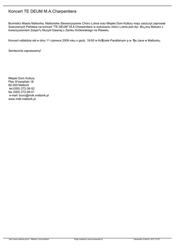 Koncert TE DEUM M.A.Charpentiera Burmistrz Miasta Malborka, Malborskie Stowarzyszenie Chóru Lutnia oraz Miejski Dom Kultury maj± zaszczyt zaprosiæ Szanownych Pañstwa na koncert "TE DEUM" M.A.Charpentiera w wykonaniu chóru Lutnia pod dyr. Bo¿eny Belcarz z towarzyszeniem Zespo³u Muzyki Dawnej z Zamku Królewskiego na Wawelu. Koncert odbêdzie siê w dniu 11 czerwca 2009 roku o godz. 19:00 w Ko¶ciele Parafialnym p.w. ¶w.Jana w Malborku. Serdecznie zapraszamy! Miejski Dom Kultury Plac S³owiañski 18 82-200 Malbork tel.(055) 272-38-52 fax (055) 272-46-01 e-mail: [email protected] www.mdk.malbork.pl http://www.malbork.pl/um/ - Malbork, Urz±d Miasta Page created by www.kraszewski.pl Generated: 8 March, 2017, 07:27