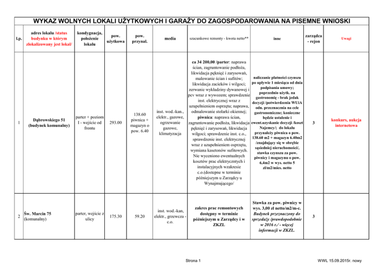 WYKAZ WOLNYCH LOKALI UśYTKOWYCH I GARAśY DO ZAGOSPODAROWANIA NA PISEMNE WNIOSKI l.p. 1 2 adres lokalu /status budynku w którym zlokalizowany jest lokal/ Dąbrowskiego 51 (budynek komunalny) Św. Marcin 75 (komunalny) kondygnacja, połoźenie lokalu parter + poziom I - wejście od frontu parter, wejście z ulicy pow. uŜytkowa 293.00 175.30 pow. przynal. 138.60 piwnica + magazyn o pow. 6.40 59.20 media szacunkowe remonty - kwota netto** ca 34 200,00 /parter: naprawa ścian, zagruntowanie podłoŜa, likwidacja pęknięć i zarysowań, malowanie ścian i sufitów; likwidacja zacieków i wilgoci; zerwanie wykładziny dywanowej i pcv wraz z wywozem; sprawdzenie inst. elektrycznej wraz z uzupełnieniem osprzętu; naprawa, inst. wod.-kan., odmalowanie stolarki okiennej; elektr., gazowe, piwnica: naprawa ścian, ogrzewanie zagruntowanie podłoŜa, likwidacja gazowe, pęknięć i zarysowań, likwidacja klimatyzacja wilgoci; sprawdzenie inst. c.o., sprawdzenie inst. elektrycznej wraz z uzupełnieniem osprzętu, wymiana kasetonów sufitowych. Nie wyceniono ewentualnych kosztów prac elektryczntych i instalacyjnych wzakresie c.o.(dostepne w terminie późniejszym u Zarządcy u Wynajmującego/ inst. wod.-kan, elektr., grzewcza c.o. zakres prac remontowych dostępny w terminie późniejszym u Zarządcy i w ZKZL Strona 1 inne zarządca - rejon Uwagi naliczanie płatności czynszu po upływie 1 miesiąca od dnia podpisania umowy; poprzednio uŜytk. na gastronomię - brak jedak decyzji /potwierdzenia WUiA odn. przeznacznia na cele gastronomiczne; konieczne będzie ustalenie i ewent.uzyskanie decyzji /koszt Najemcy/; do lokalu przynaleŜy piwnica o pow. 138.60 m2 + magazyn 6.40m2 /znajdujący się w obrębie sąsiedniej nieruchomości/, stawka czynszu za pow. piwnicy i magazynu o pow. 6,4m2 w wys. netto 5 zł/m2/mies. netto 3 konkurs, aukcja internetowa Stawka za pow. piwnicy w wys. 3,00 zł netto/m2/m-c. Budynek przeznaczony do sprzedaŜy /prawdopodobnie w 2016 r./ - więcej informacji w ZKZL. 3 WWL 15.09.2015r. nowy 3 Woźna 13 l.u. nr 2 (komunalny) partej wejście z ulicy 139.80 48.90 ca 17 000,00 /malowanie wraz z zagruntowaniem podłoŜa, uzupełnieniem ubytków oraz likwidacją wilgoci - parter i piwnica; sprawdzenie inst. elektrycznej; wyczyszczzenie płytek na posadzkach; naprawa termin rozpoczęcia naliczania tynków pod parapetami; wymiana i czynszu do negocjacji; uzupełnienie elementów poprzednio uŜytk. na sanitarnych z naprawą inst. wod.gastronomię - brak jedak kan.; wymiana wykładziny pcv z decyzji /potwierdzenia WUiA inst. wod.-kan., wyrównaniem - naprawą posadzek; odn. przeznacznia na cele elektr. - brak inf. gastronomiczne; konieczne demontaŜ rur wentylacyjnych; o liczniku będzie ustalenie i demontaŜ zabudowy drewnianej ewent.uzyskanie decyzji oraz siedzisk - opcjonalnie; /koszt Najemcy/; stawka naprawa tynku w pomieszczeniach czynszu za pow. piwnicy w zaplecza po zerwaniu ze ścian wys. netto 3 zł/m2/mies. netto wykładziny pcv; naprawa drzwi do pomieszczeń sanitarnych; sprawdzenie wentylacji w lokalu + koszt ewentualnych zaleceń pokontrolnych - zlecenie wykonania przeglądu kominiarskiego/ 28 Czerwca 1956r. nr 140 4 l.u. nr 1 (komunalny) parter w podwórzu 51.70 inst. wod.-kan., elektr. 28 Czerwca 1956r. nr 269 5 l.u. nr 2 (wspólnota mieszkaniowa) parter, wejście z ulicy 40.80 inst. wod.-kan., elektr., piec akumulacyjny zakres prac remontowych dostępny w terminie późniejszym u Zarządcy i w ZKZL ca 270 (nałoŜenie tynku /struktury/ w ościeŜach drzwi do lokalu, uzupełnienie ścianki gipsowokartonowej) Strona 2 3 aukcja internetowa 4 konkurs 4 konkurs WWL 15.09.2015r. nowy Al. Marcinkowskiego 26 6 l.u. nr 5 (wspólnota mieszkaniowa) 7 Bukowa 2A (wspólnota mieszkaniowa) Chłapowskiego 3 8 (wspólnota mieszkaniowa) parter, oficyna 267.60 parter, wejście z ulicy 104.50 suterena, wejście z ulicy wspólne 22.90 51.70 ca 26 100 (malowanie pomieszczeń, wymiana stolarki drzwiowej w piwnicy, wykonanie posadzki w piwnicy, wymiana wykładzin, demontaŜ boazerii naliczanie płatności inst. wod.-kan., PCV w piwnicy elektr., gazowa, czynszu po upływie i tynkowanie ścian, demontaŜ centralne 6 miesięcy od dnia urządzeń kanałów wentylacyjnych, ogrzewanie-piec podpisania umowy, stawka sprawdzenie stanu technicznego gazowy za pow. piwnicy w wys. inst. wod.-kan. i elektrycznej oraz uszkodzony 5,00zł/m2/mies. netto. przegląd kominiarski)+ koszt wykonania ewentualnych zaleceń pokontrolnych instalacji + koszt naprawy pieca gazowego c.o. /nieoszacowany/ 2 konkurs, Rada Osiedla inst. wod.-kan., elektr., gazowa, c.o., klimatyzacja nie wymaga remontu ewentualnie wymiana stolarki okiennej lokal po sklepie mięsnym-w lokalu chłodnia, 4 zarezerwowany 5 200 termin rozpoczęcia naliczania czynszu do negocjacji. MPGM S.A. wydało warunki techniczne zwiększenia mocy przyłączeniowej i zbudowania układu pomiarowego elektrycznego. 4 konkurs ca 6 100 (malowanie lokalu, montaŜ listew przypodłogowych, sprawdzenie inst. elektr.) + wykonanie zaleceń pokontrolnych instalacji naliczanie płatności czynszu po upływie 2 miesięcy od dnia podpisania umowy 5 konkurs, aukcja internetowa termin rozpoczęcia naliczania czynszu do negocjacji 4 konkurs 4 konkurs, Rada Osiedla, aukcja internetowa inst. elektr. (nie podłączona, tylko wewnętrzna), wod.kan., grzewcza (c.o.) Chociszewskiego 45 9 (wspólnota mieszkaniowa) parter, front budynku, wejście z ulicy 101.30 inst. wod.-kan., elektr., rolety zewnętrzne Chwiałkowskiego 12 (wspólnota mieszkaniowa) piwnica, wejście z ulicy 35.90 inst. elektr., wod.kan. 15 650 Chwiałkowskiego 12a l.u. 11 nr 1 (wspólnota mieszkaniowa) suterena, wejście z ulicy 39.80 inst. wod.-kan., elektr., gazowa, c.o. - piec gazowy zakres prac remontowych dostępny w terminie późniejszym u Zarządcy i w ZKZL 10 Strona 3 WWL 15.09.2015r. nowy Chwiałkowskiego 17 12 lok. uŜyt. nr 1 (wspólnota mieszkaniowa) suterena, wejście z klatki schodowej 28.20 Garbary 28/