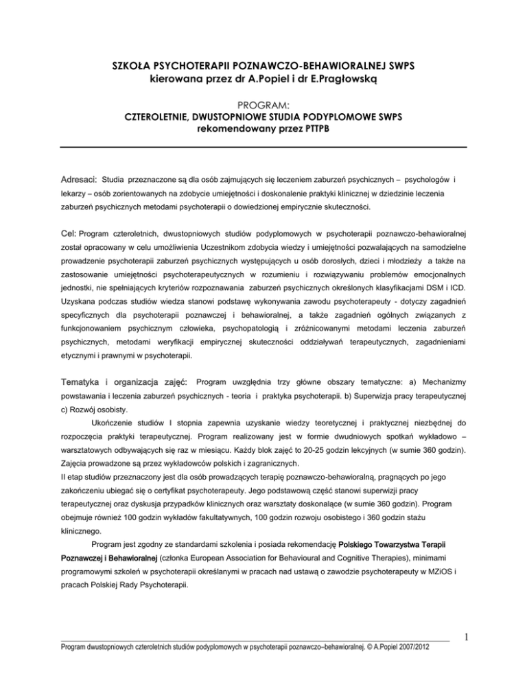 SZKOŁA PSYCHOTERAPII POZNAWCZO-BEHAWIORALNEJ SWPS kierowana przez dr A.Popiel i dr E.Pragłowską PROGRAM: CZTEROLETNIE, DWUSTOPNIOWE STUDIA PODYPLOMOWE SWPS rekomendowany przez PTTPB Adresaci: Studia przeznaczone są dla osób zajmujących się leczeniem zaburzeń psychicznych – psychologów i lekarzy – osób zorientowanych na zdobycie umiejętności i doskonalenie praktyki klinicznej w dziedzinie leczenia zaburzeń psychicznych metodami psychoterapii o dowiedzionej empirycznie skuteczności. Cel: Program czteroletnich, dwustopniowych studiów podyplomowych w psychoterapii poznawczo-behawioralnej został opracowany w celu umożliwienia Uczestnikom zdobycia wiedzy i umiejętności pozwalających na samodzielne prowadzenie psychoterapii zaburzeń psychicznych występujących u osób dorosłych, dzieci i młodzieży a także na zastosowanie umiejętności psychoterapeutycznych w rozumieniu i rozwiązywaniu problemów emocjonalnych jednostki, nie spełniających kryteriów rozpoznawania zaburzeń psychicznych określonych klasyfikacjami DSM i ICD. Uzyskana podczas studiów wiedza stanowi podstawę wykonywania zawodu psychoterapeuty - dotyczy zagadnień specyficznych dla psychoterapii poznawczej i behawioralnej, a także zagadnień ogólnych związanych z funkcjonowaniem psychicznym człowieka, psychopatologią i zróżnicowanymi metodami leczenia zaburzeń psychicznych, metodami weryfikacji empirycznej skuteczności oddziaływań terapeutycznych, zagadnieniami etycznymi i prawnymi w psychoterapii. Tematyka i organizacja zajęć: Program uwzględnia trzy główne obszary tematyczne: a) Mechanizmy powstawania i leczenia zaburzeń psychicznych - teoria i praktyka psychoterapii. b) Superwizja pracy terapeutycznej c) Rozwój osobisty. Ukończenie studiów I stopnia zapewnia uzyskanie wiedzy teoretycznej i praktycznej niezbędnej do rozpoczęcia praktyki terapeutycznej. Program realizowany jest w formie dwudniowych spotkań wykładowo – warsztatowych odbywających się raz w miesiącu. Każdy blok zajęć to 20-25 godzin lekcyjnych (w sumie 360 godzin). Zajęcia prowadzone są przez wykładowców polskich i zagranicznych. II etap studiów przeznaczony jest dla osób prowadzących terapię poznawczo-behawioralną, pragnących po jego zakończeniu ubiegać się o certyfikat psychoterapeuty. Jego podstawową część stanowi superwizji pracy terapeutycznej oraz dyskusja przypadków klinicznych oraz warsztaty doskonalące (w sumie 360 godzin). Program obejmuje również 100 godzin wykładów fakultatywnych, 100 godzin rozwoju osobistego i 360 godzin stażu klinicznego. Program jest zgodny ze standardami szkolenia i posiada rekomendację Polskiego Towarzystwa Terapii Poznawczej i Behawioralnej (członka European Association for Behavioural and Cognitive Therapies), minimami programowymi szkoleń w psychoterapii określanymi w pracach nad ustawą o zawodzie psychoterapeuty w MZiOS i pracach Polskiej Rady Psychoterapii. ___________________________________________________________________________________________________ Program dwustopniowych czteroletnich studiów podyplomowych w psychoterapii poznawczo–behawioralnej. © A.Popiel 2007/2012 1 SZKOŁA PSYCHOTERAPII POZNAWCZO-BEHAWIORALNEJ SWPS kierowana przez dr A.Popiel i dr E.Pragłowską PROGRAM: CZTEROLETNIE, DWUSTOPNIOWE STUDIA PODYPLOMOWE SWPS rekomendowany przez PTTPB Warunki zaliczenia: Po I etapie - egzamin pisemny - sprawdzian wiedzy teoretycznej. Po II etapie – egzamin zgodny ze standardami PTTPB (www.pttpb.pl) podsumowujący dysponowanie umiejętnościami praktycznymi, postawą osobistą umożliwiającą prowadzenie psychoterapii poznawczo-behawioralnej osób z zaburzeniami psychicznymi Czas trwania:I stopień – cztery semestry, II stopień – cztery semestry, razem osiem semestrów, ponad 1200 godzin z czego 720 wykładów, warsztatów i superwizji. Dokument ukończenia studiów: Po I etapie Absolwenci otrzymują zaświadczenie o ukończeniu I Etapu studiów w psychoterapii poznawczobehawioralnej. Po II etapie Absolwenci otrzymują, przewidziane ustawą, świadectwo ukończenia Studiów Podyplomowych w Szkole Wyższej Psychologii Społecznej. Ukończenie II etapu studiów uprawnia także do ubiegania się o Certyfikat Psychoterapeuty PoznawczoBehawioralnego Polskiego Towarzystwa Terapii Poznawczej i Behawioralnej (PTTPB), Certyfikat EABCT Program realizowany w wydziałach SWPS: SOPOT, WARSZAWA, POZNAŃ, KATOWICE SWPS SOPOT – kierownik merytoryczny mgr Ida Derezińska SWPS KATOWICE – kierownik merytoryczny mgr, lek med. Magdalena Skotnicka-Chaberek SWPS POZNAŃ – kierownik merytoryczny dr n med. Artur Wiśniewski ___________________________________________________________________________________________________ Program dwustopniowych czteroletnich studiów podyplomowych w psychoterapii poznawczo–behawioralnej. © A.Popiel 2007/2012 2 SZKOŁA PSYCHOTERAPII POZNAWCZO-BEHAWIORALNEJ SWPS kierowana przez dr A.Popiel i dr E.Pragłowską PROGRAM: CZTEROLETNIE, DWUSTOPNIOWE STUDIA PODYPLOMOWE SWPS rekomendowany przez PTTPB PROGRAM SZCZEGÓŁOWY: Program czteroletnich, dwustopniowych studiów podyplomowych w psychoterapii poznawczo-behawioralnej został opracowany w celu umożliwienia Uczestnikom zdobycia wiedzy i umiejętności pozwalających na samodzielne prowadzenie psychoterapii zaburzeń psychicznych występujących u osób dorosłych, dzieci i młodzieży a także na zastosowanie umiejętności psychoterapeutycznych w rozumieniu i rozwiązywaniu problemów emocjonalnych jednostki, nie spełniających kryteriów rozpoznawania zaburzeń psychicznych określonych klasyfikacjami DSM i ICD. Uczestnikami studiów są osoby z wykształceniem wyższym psychologicznym lub medycznym, zorientowane na zdobycie umiejętności i doskonalenie praktyki klinicznej. Uzyskana podczas studiów wiedza stanowi podstawę wykonywania zawodu psychoterapeuty - dotyczy zagadnień specyficznych dla psychoterapii poznawczej i behawioralnej a także zaga