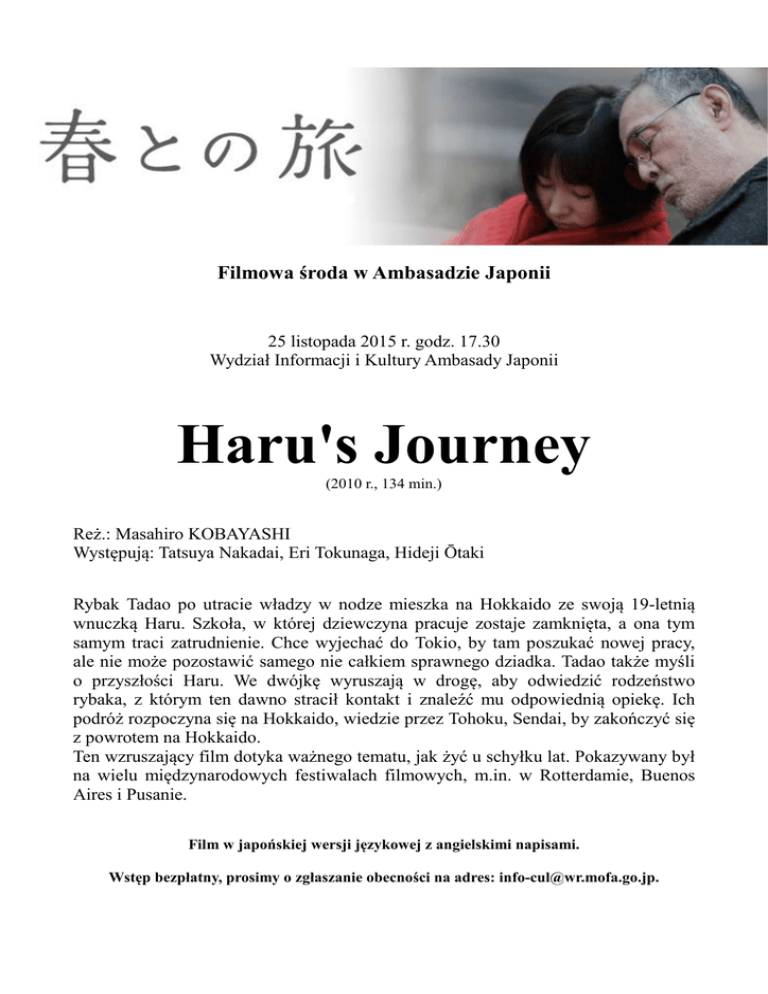 Filmowa środa w Ambasadzie Japonii 25 listopada 2015 r. godz. 17.30 Wydział Informacji i Kultury Ambasady Japonii Haru's Journey (2010 r., 134 min.) Reż.: Masahiro KOBAYASHI Występują: Tatsuya Nakadai, Eri Tokunaga, Hideji Ōtaki Rybak Tadao po utracie władzy w nodze mieszka na Hokkaido ze swoją 19-letnią wnuczką Haru. Szkoła, w której dziewczyna pracuje zostaje zamknięta, a ona tym samym traci zatrudnienie. Chce wyjechać do Tokio, by tam poszukać nowej pracy, ale nie może pozostawić samego nie całkiem sprawnego dziadka. Tadao także myśli o przyszłości Haru. We dwójkę wyruszają w drogę, aby odwiedzić rodzeństwo rybaka, z którym ten dawno stracił kontakt i znaleźć mu odpowiednią opiekę. Ich podróż rozpoczyna się na Hokkaido, wiedzie przez Tohoku, Sendai, by zakończyć się z powrotem na Hokkaido. Ten wzruszający film dotyka ważnego tematu, jak żyć u schyłku lat. Pokazywany był na wielu międzynarodowych festiwalach filmowych, m.in. w Rotterdamie, Buenos Aires i Pusanie. Film w japońskiej wersji językowej z angielskimi napisami. Wstęp bezpłatny, prosimy o zgłaszanie obecności na adres: [email protected].