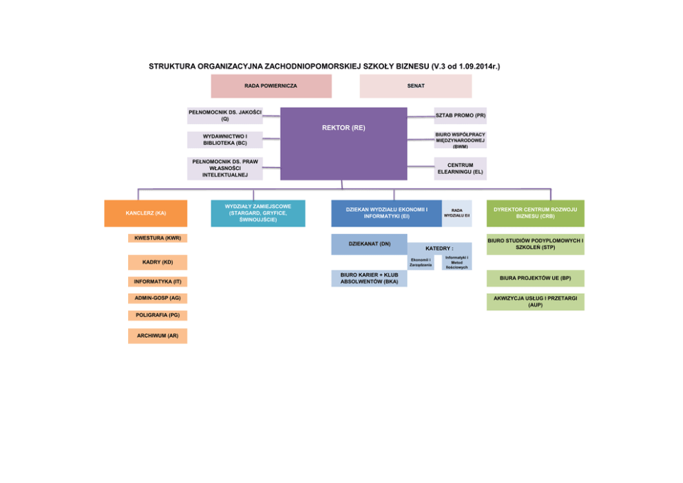 STRUKTURA ORGANIZACYJNA ZACHODNIOPOMORSKIEJ SZKOŁY BIZNESU (V.3 od 1.09.2014r.) RADA POWIERNICZA SENAT PEŁNOMOCNIK DS. JAKOŚCI (Q) SZTAB PROMO (PR) REKTOR (RE) KANCLERZ (KA) WYDAWNICTWO I BIBLIOTEKA (BC) BIURO WSPÓŁPRACY MIĘDZYNARODOWEJ (BWM) PEŁNOMOCNIK DS. PRAW WŁASNOŚCI INTELEKTUALNEJ CENTRUM ELEARNINGU (EL) WYDZIAŁY ZAMIEJSCOWE (STARGARD, GRYFICE, ŚWINOUJŚCIE) DZIEKAN WYDZIAŁU EKONOMII I INFORMATYKI (EI) RADA WYDZIAŁU EiI KWESTURA (KWR) DZIEKANAT (DN) Ekonomii i Zarządzania KADRY (KD) INFORMATYKA (IT) ADMIN-GOSP (AG) POLIGRAFIA (PG) ARCHIWUM (AR) KATEDRY : BIURO KARIER + KLUB ABSOLWENTÓW (BKA) DYREKTOR CENTRUM ROZWOJU BIZNESU (CRB) BIURO STUDIÓW PODYPLOMOWYCH I SZKOLEŃ (STP) Informatyki i Metod Ilościowych BIURA PROJEKTÓW UE (BP) AKWIZYCJA USŁUG I PRZETARGI (AUP)