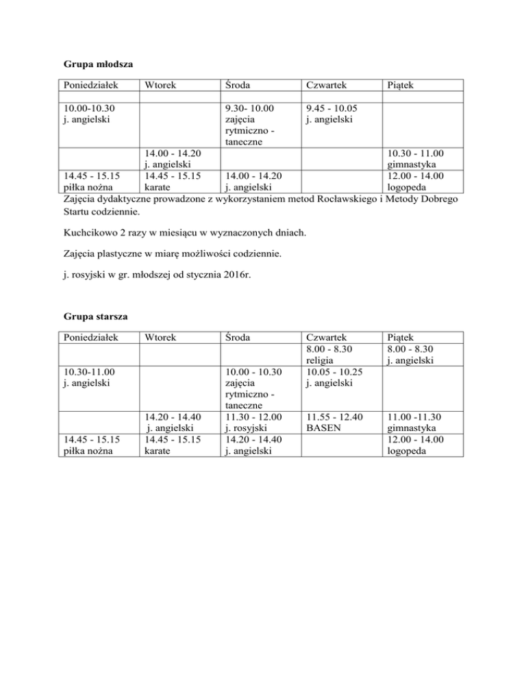 Grupa młodsza Poniedziałek Wtorek 10.00-10.30 j. angielski Środa Czwartek 9.30- 10.00 zajęcia rytmiczno taneczne 9.45 - 10.05 j. angielski Piątek 14.00 - 14.20 10.30 - 11.00 j. angielski gimnastyka 14.45 - 15.15 14.45 - 15.15 14.00 - 14.20 12.00 - 14.00 piłka nożna karate j. angielski logopeda Zajęcia dydaktyczne prowadzone z wykorzystaniem metod Rocławskiego i Metody Dobrego Startu codziennie. Kuchcikowo 2 razy w miesiącu w wyznaczonych dniach. Zajęcia plastyczne w miarę możliwości codziennie. j. rosyjski w gr. młodszej od stycznia 2016r. Grupa starsza Poniedziałek Wtorek Środa 14.20 - 14.40 j. angielski 14.45 - 15.15 karate 10.00 - 10.30 zajęcia rytmiczno taneczne 11.30 - 12.00 j. rosyjski 14.20 - 14.40 j. angielski 10.30-11.00 j. angielski 14.45 - 15.15 piłka nożna Czwartek 8.00 - 8.30 religia 10.05 - 10.25 j. angielski Piątek 8.00 - 8.30 j. angielski 11.55 - 12.40 BASEN 11.00 -11.30 gimnastyka 12.00 - 14.00 logopeda