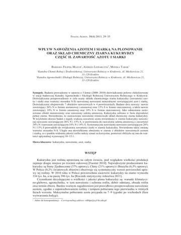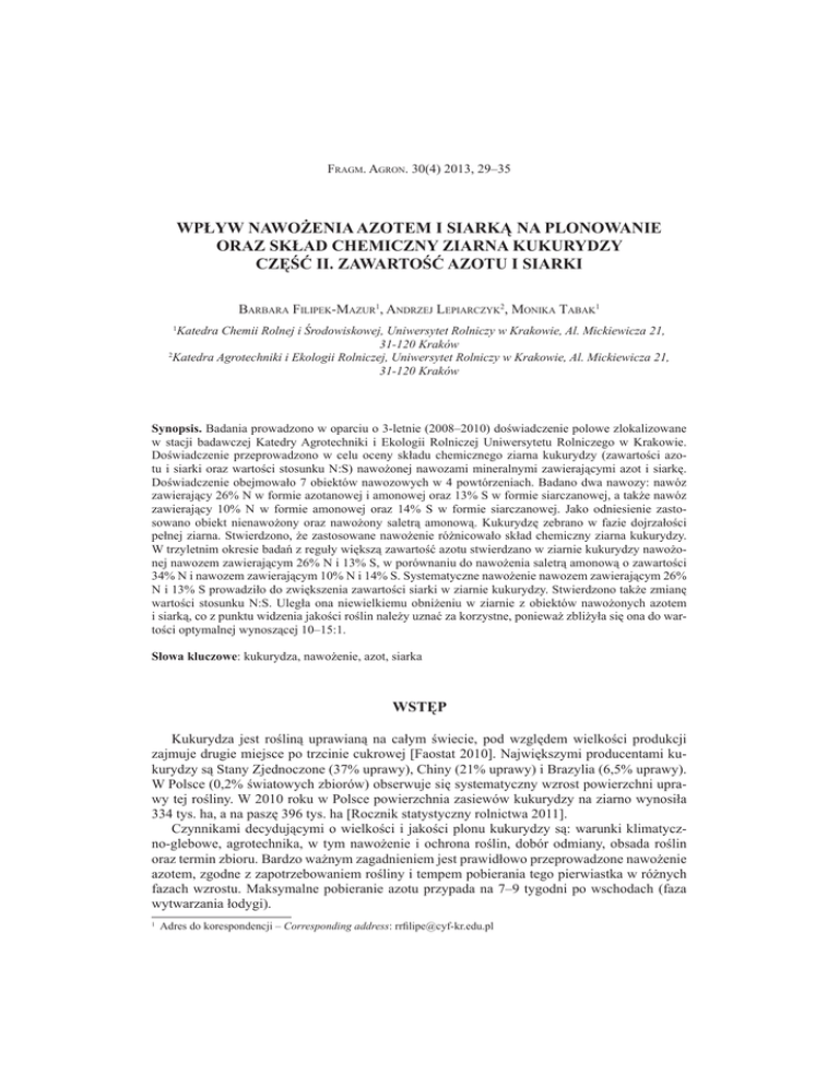Fragm. Agron. 30(4) 2013, 29–35 WPŁYW NAWOŻENIA AZOTEM I SIARKĄ NA PLONOWANIE ORAZ SKŁAD CHEMICZNY ZIARNA KUKURYDZY CZĘŚĆ II. ZAWARTOŚĆ AZOTU I SIARKI Barbara Filipek-Mazur, Andrzej Lepiarczyk2, Monika Tabak1 Katedra Chemii Rolnej i Środowiskowej, Uniwersytet Rolniczy w Krakowie, Al. Mickiewicza 21, 31-120 Kraków 2 Katedra Agrotechniki i Ekologii Rolniczej, Uniwersytet Rolniczy w Krakowie, Al. Mickiewicza 21, 31-120 Kraków 1 Synopsis. Badania prowadzono w oparciu o 3-letnie (2008–2010) doświadczenie polowe zlokalizowane w stacji badawczej Katedry Agrotechniki i Ekologii Rolniczej Uniwersytetu Rolniczego w Krakowie. Doświadczenie przeprowadzono w celu oceny składu chemicznego ziarna kukurydzy (zawartości azotu i siarki oraz wartości stosunku N:S) nawożonej nawozami mineralnymi zawierającymi azot i siarkę. Doświadczenie obejmowało 7 obiektów nawozowych w 4 powtórzeniach. Badano dwa nawozy: nawóz zawierający 26% N w formie azotanowej i amonowej oraz 13% S w formie siarczanowej, a także nawóz zawierający 10% N w formie amonowej oraz 14% S w formie siarczanowej. Jako odniesienie zastosowano obiekt nienawożony oraz nawożony saletrą amonową. Kukurydzę zebrano w fazie dojrzałości pełnej ziarna. Stwierdzono, że zastosowane nawożenie różnicowało skład chemiczny ziarna kukurydzy. W trzyletnim okresie badań z reguły większą zawartość azotu stwierdzano w ziarnie kukurydzy nawożonej nawozem zawierającym 26% N i 13% S, w porównaniu do nawożenia saletrą amonową o zawartości 34% N i nawozem zawierającym 10% N i 14% S. Systematyczne nawożenie nawozem zawierającym 26% N i 13% S prowadziło do zwiększenia zawartości siarki w ziarnie kukurydzy. Stwierdzono także zmianę wartości stosunku N:S. Uległa ona niewielkiemu obniżeniu w ziarnie z obiektów nawożonych azotem i siarką, co z punktu widzenia jakości roślin należy uznać za korzystne, ponieważ zbliżyła się ona do wartości optymalnej wynoszącej 10–15:1. Słowa kluczowe: kukurydza, nawożenie, azot, siarka WSTĘP Kukurydza jest rośliną uprawianą na całym świecie, pod względem wielkości produkcji zajmuje drugie miejsce po trzcinie cukrowej [Faostat 2010]. Największymi producentami kukurydzy są Stany Zjednoczone (37% uprawy), Chiny (21% uprawy) i Brazylia (6,5% uprawy). W Polsce (0,2% światowych zbiorów) obserwuje się systematyczny wzrost powierzchni uprawy tej rośliny. W 2010 roku w Polsce powierzchnia zasiewów kukurydzy na ziarno wynosiła 334 tys. ha, a na paszę 396 tys. ha [Rocznik statystyczny rolnictwa 2011]. Czynnikami decydującymi o wielkości i jakości plonu kukurydzy są: warunki klimatyczno-glebowe, agrotechnika, w tym nawożenie i ochrona roślin, dobór odmiany, obsada roślin oraz termin zbioru. Bardzo ważnym zagadnieniem jest prawidłowo przeprowadzone nawożenie azotem, zgodne z zapotrzebowaniem rośliny i tempem pobierania tego pierwiastka w różnych fazach wzrostu. Maksymalne pobieranie azotu przypada na 7–9 tygodni po wschodach (faza wytwarzania łodygi). Adres do korespondencji – Corresponding address: [email protected] 30 B. Filipek-Mazur, A. Lepiarczyk, M. Tabak Zwiększanie efektywności zastosowanego azotu można uzyskać, stosując racjonalne dawki P, K, Mg, S i Zn [Boligłowa i in. 2011, Fotyma 2003, Szulc 2010,]. Barczak i in. [2011] stwierdzili zwiększenie zawartości azotu i siarki w ziarnie kukurydzy w wyniku nawożenia siarką. Kulczycki [2003] również wykazał zwiększenie zawartości siarki w roślinach (a także pobrania siarki) w rezultacie nawożenia ich tym składnikiem, nie wiązało się to jednak ze zwiększeniem zawartości azotu w roślinach (ani ze zwiększeniem pobrania tego składnika). Szulc i Waligóra [2010] nie stwierdzili zmian zawartości azotu w kukurydzy w fazie 5–6 liści w wyniku nawożenia jej siarką i azotem, wraz ze zwiększaniem dawki azotu większa jednak była ilość azotu pobranego przez rośliny. Jak zaznaczają Barczak i in. [2011], stwierdzany przez niektórych autorów brak zmian zawartości azotu w roślinach w wyniku nawożenia ich siarką może wynikać z uprawy tych roślin na glebach o przynajmniej średniej zawartości siarki przyswajalnej (rezultatem jest brak reakcji roślin na nawożenie siarką). Nie potwierdzają tego wyniki badań Kulczyckiego [2003]. Celem badań była ocena składu chemicznego ziarna kukurydzy nawożonej nawozami mineralnymi zawierającymi w swoim składzie azot i siarkę. W doświadczeniu analizowano zawartość azotu i siarki w ziarnie oraz wartość stosunku N:S. MATERIAŁ I METODY Badania prowadzono w oparciu o 3-letnie (2008–2010) doświadczenie polowe zlokalizowane w stacji badawczej Katedry Agrotechniki i Ekologii Rolniczej Uniwersytetu Rolniczego w Krakowie-Mydlnikach (50°08′ N, 19°85′ E). Doświadczenie obejmowało 7 obiektów nawozowych w 4 powtórzeniach: I. kontrola „0”, II. 160 kg N∙ha-1 (saletra amonowa zawierająca 34% N), III. 120 kg N∙ha-1 (saletra amonowa zawierająca 34% N), IV. 160 kg N∙ha-1 (nawóz A zawierający 26% N w formie azotanowej i amonowej oraz 13% S w formie siarczanowej), V. 120 kg N∙ha-1 (nawóz A zawierający 26% N w formie azotanowej i amonowej oraz 13% S w formie siarczanowej), VI. 160 kg N∙ha-1 (nawóz B zawierający 10% N w formie amonowej oraz 14% S w formie siarczanowej), VII.120 kg N∙ha-1 (nawóz B zawierający 10% N w postaci amonowej oraz 14% S w postaci siarczanowej). Dokładny opis prowadzenia doświadczenia oraz warunki glebowo-klimatyczne przestawiono w części I tej publikacji [Lepiarczyk i in. 2013]. Kukurydzę zebrano w fazie dojrzałości pełnej ziarna. Po zbiorze ziarna, wysuszeniu w temperaturze 70oC w suszarce z przepływem powietrza i zmieleniu, oznaczono w nim zawartość azotu ogólnego metodą Kjeldahla, na aparacie Kjeltec 2300 (FOSS). Siarkę ogólną w ziarnie kukurydzy oznaczono po mineralizacji na mokro w stężonym kwasie azotowym(V), a po odparowaniu HNO3 próbki 