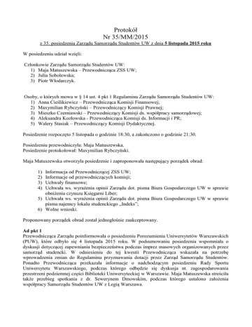 Protokół Nr 35/MM/2015 z 35. posiedzenia Zarządu Samorządu Studentów UW z dnia 5 listopada 2015 roku W posiedzeniu udział wzięli: Członkowie Zarządu Samorządu Studentów UW: 1) Maja Matuszewska – Przewodnicząca ZSS UW; 2) Julia Sobolewska; 3) Piotr Włodarczyk. Osoby, o których mowa w § 14 ust. 4 pkt 1 Regulaminu Zarządu Samorządu Studentów UW: 1) Anna Cieślikiewicz – Przewodnicząca Komisji Finansowej; 2) Maxymilian Rybczyński – Przewodniczący Komisji Prawnej; 3) Mieszko Czerniawski – Przewodniczący Komisji ds. współpracy samorządowej; 4) Aleksandra Kozłowska - Przewodnicząca Komisji ds. Informacji i PR; 5) Walery Stasiak – Przewodniczący Komisji Dydaktycznej. Posiedzenie rozpoczęto 5 listopada o godzinie 18:30, a zakończono o godzinie 21:30. Posiedzeniu przewodniczyła: Maja Matuszewska. Posiedzenie protokołował: Maxymilian Rybczyński. Maja Matuszewska otworzyła posiedzenie i zaproponowała następujący porządek obrad: Informacja od Przewodniczącej ZSS UW; Informacje od przewodniczących komisji; Uchwały finansowe; Uchwała ws. wyrażenia opinii Zarządu dot. pisma Biura Gospodarczego UW w sprawie obniżenia czynszu Księgarni Liber; 5) Uchwała ws. wyrażenia opinii Zarządu dot. pisma Biura Gospodarczego UW w sprawie pisma najemcy lokalu studenckiego „Indeks”; 6) Wolne wnioski. 1) 2) 3) 4) Proponowany porządek obrad został jednogłośnie zaakceptowany. Ad pkt 1 Przewodnicząca Zarządu poinformowała o posiedzeniu Porozumienia Uniwersytetów Warszawskich (PUW), które odbyło się 4 listopada 2015 roku. W podsumowaniu posiedzenia wspomniała o dyskusji dotyczącej zapewniania bezpieczeństwa podczas imprez masowych organizowanych przez samorząd studencki. W odniesieniu do tej kwestii Przewodnicząca wskazała na potrzebę wprowadzenia zmian do Regulaminu przyznawania dotacji przez Zarząd Samorządu Studentów. Ponadto Przewodnicząca przekazała informacje o nadchodzącym posiedzeniu Rady Sportu Uniwersytetu Warszawskiego, podczas którego odbędzie się dyskusja nt. zagospodarowania przestrzeni podziemnej części Biblioteki Uniwersyteckiej w Warszawie. Maja Matuszewska streściła także przebieg spotkania z dr. Sewerynem Dmowskim, podczas którego ustalono założenia współpracy Samorządu Studentów UW z Legią Warszawa. Ad pkt 2 Informacje od przewodniczących komisji: 1. Przewodniczący Komisji Dydaktycznej poinformował, że 31 października 2015 r. Komisja Dydaktyczna opublikowała tegoroczną edycję Raportu Studenckiego na stronie internetowej samorządu. Przypomniał, że treść raportu obejmuje takie zagadnienia jak: dydaktyka i jakość kształcenia, sytuacja socjalno-bytowa studentów, mobilność studencka, sprawy informacyjno-techniczne, a także funkcjonowanie organizacji studenckich (kół naukowych, komisji stypendialnych oraz samorządów jednostkowych). W dalszej części swojej wypowiedzi streścił przeprowadzone spotkanie szkoleniowe ws. zmian w programach kształcenia, które odbyło się 4 listopada 2015 r. Szczególną uwagę zwrócił na harmonogram prac nad zmianami w programach kształcenia i na konieczność wysokiej aktywizacji przedstawicieli samorządów jednostkowych w tym temacie. 2. Przewodnicząca Komisji ds. Informacji i PR poinformowała o przebiegu dystrybucji kalendarzy. 26 jednostek utworzyło punkty dystrybucji na swoich wydziałach oraz instytutach. 10 listopada jest planowane zakończenie wydawania kalendarzy w siedzibie Samorządu Studentów UW. 3. Przewodnicząca Komisji Koordynacji Projektów poinformowała o przewidywanym zakończeniu akcji "Witaj na UW!" - w ramach tego cyklu wydarzeń powstał projekt "Halloween UW". Dnia 5 listopada odbędzie się impreza Halloweenowa w Hybrydach, a dnia 6 listopada noc horrorów w Kinie Atlantic z którym udało się dzięki UW Here nawiązać współpracę. Ponadto Przewodnicząca przypomniała o zbliżającym się kolejnym pokazie z cyklu National Theatre Live. 4. Przewodniczący Komisji ds. Współpracy Zewnętrznej poinformował o rozpoczęciu prac nad folderem informacyjnym dla partnerów biznesowych oraz o działaniach mających na celu rozszerzenie sieci kontaktów z instytucjami kultury. Ad pkt 3 Zarząd wyasygnował zawnioskowane środki finansowe z budżetu samorządu, co stwierdzają uchwały o nr od I-II/1300/35/MM/2015 do nr III/1306/35/MM/2015. Ad pkt 4 Przewodnicząca przedstawiła pismo Biura Gospodarczego UW z dnia 27.10.2015, w którym Biuro zwraca się z prośbą o wyrażenie opinii Zarządu dot. pisma Księgarni Liber z dnia 20.10.2015 roku. Zarząd, po zapoznaniu się z ww. pismem, wyraził opinię, co stwierdza uchwała nr M/38/35/MM/2015. Ad pkt 5 Przewodnicząca przedstawiła pismo Biura Gospodarczego UW z dnia 27.10.2015, w którym Biuro zwraca się z prośbą o wyrażenie opinii Zarządu dot. pisma najemcy lokalu „INDEKS” z dnia 20.10.2015 roku. Zarząd, po zapoznaniu się z ww. pismem, wyraził opinię, co stwierdza uchwała nr M/39/35/MM/2015. Ad pkt 6 Wolne wnioski Nie zgłoszono wolnych wniosków. Na tym posiedzenie zakończono. Przewodniczący Komisji Prawnej ZSS UW Przewodnicząca Zarządu Samorządu Studentów UW Maxymilian Rybczyński Maja Matuszewska Członkowie Zarządu Samorządu Studentów Uniwersytetu Warszawskiego: 1) Julia Sobolewska ........................................................ 2) Piotr Włodarczyk ........................................................