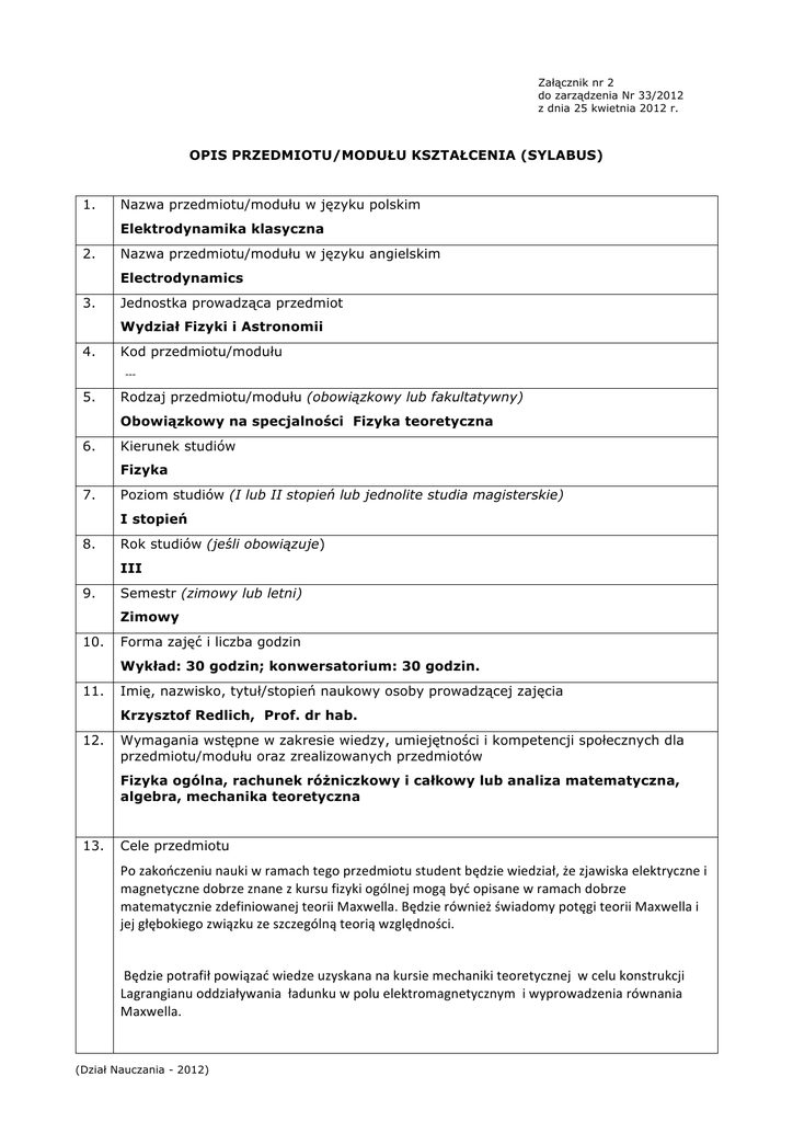 Załącznik nr 2 do zarządzenia Nr 33/2012 z dnia 25 kwietnia 2012 r. OPIS PRZEDMIOTU/MODUŁU KSZTAŁCENIA (SYLABUS) 1. Nazwa przedmiotu/modułu w języku polskim Elektrodynamika klasyczna 2. Nazwa przedmiotu/modułu w języku angielskim Electrodynamics 3. Jednostka prowadząca przedmiot Wydział Fizyki i Astronomii 4. Kod przedmiotu/modułu --- 5. Rodzaj przedmiotu/modułu (obowiązkowy lub fakultatywny) Obowiązkowy na specjalności Fizyka teoretyczna 6. Kierunek studiów Fizyka 7. Poziom studiów (I lub II stopień lub jednolite studia magisterskie) I stopień 8. Rok studiów (jeśli obowiązuje) III 9. Semestr (zimowy lub letni) Zimowy 10. Forma zajęć i liczba godzin Wykład: 30 godzin; konwersatorium: 30 godzin. 11. Imię, nazwisko, tytuł/stopień naukowy osoby prowadzącej zajęcia Krzysztof Redlich, Prof. dr hab. 12. Wymagania wstępne w zakresie wiedzy, umiejętności i kompetencji społecznych dla przedmiotu/modułu oraz zrealizowanych przedmiotów Fizyka ogólna, rachunek różniczkowy i całkowy lub analiza matematyczna, algebra, mechanika teoretyczna 13. Cele przedmiotu Po zakończeniu nauki w ramach tego przedmiotu student będzie wiedział, że zjawiska elektryczne i magnetyczne dobrze znane z kursu fizyki ogólnej mogą być opisane w ramach dobrze matematycznie zdefiniowanej teorii Maxwella. Będzie również świadomy potęgi teorii Maxwella i jej głębokiego związku ze szczególną teorią względności. Będzie potrafił powiązać wiedze uzyskana na kursie mechaniki teoretycznej w celu konstrukcji Lagrangianu oddziaływania ładunku w polu elektromagnetycznym i wyprowadzenia równania Maxwella. (Dział Nauczania - 2012) 14. Zakładane efekty kształcenia Symbole kierunkowych Przyswojenie podstawowych koncepcji teoretycznych i ich roli w rozwoju współczesnej fizyki. K_W04 Zrozumienie istoty modelu matematycznego i roli symetrii w opisie mechanicznych układów fizycznych. 15. K_W05; X1A_W01 Ugruntowanie umiejętności posługiwania się narzędziami rachunku różniczkowego i całkowego w rozwiązywaniu problemów fizycznych. K_U04 Uświadomienie relacji między umiejętnościami matematycznymi i rozumieniem pojęć fizyki teoretycznej a możliwością głębszego rozumienia zjawisk fizycznych K_K01 Treści programowe Wprowadzenie do podstawowych zasady względności oraz mechaniki relatywistycznej. Ładunek w polu elektromagnetycznym. Równania pola elektromagnetycznego. Stale pole elektromagnetyczne. Fale elektromagnetyczne. Pole poruszających się ładunków. 16. Zalecana literatura (podręczniki) 1. L. D. Landau, E. M. Lifszyc, Teoria Pola 2. D. J. Griffiths Podstawy elektrodynamiki, PWN. 3. Feynmana wykłady z fizyki. 4. J. D. Jackson „Elektrodynamika klasyczna”. 17. 18. Forma zaliczenia poszczególnych komponentów przedmiotu/modułu, sposób sprawdzenia osiągnięcia zamierzonych efektów kształcenia: wykład: obecność na wykładzie, egzamin pisemny końcowy seminarium: -laboratorium: -konwersatorium: obecność i aktywny udział w rozwiązywaniu zadań, dwa pisemne sprawdziany okresowe inne: -Język wykładowy polski 19. Obciążenie pracą studenta Forma aktywności studenta Średnia liczba godzin na zrealizowanie aktywności Godziny zajęć (wg planu studiów) z nauczycielem: - wykład: ćwiczenia: laboratorium: inne: (Dział Nauczania – 2012) 30 30 2 Praca własna studenta np.: - przygotowanie do zajęć: - opracowanie wyników: - czytanie wskazanej literatury: - napisanie raportu z zajęć: - przygotowanie do egzaminu: 60 Suma godzin 150 Liczba punktów ECTS 5 30 *objaśnienie symboli: K (przed podkreśleniem) - kierunkowe efekty kształcenia W - kategoria wiedzy U - kategoria umiejętności K (po podkreśleniu) - kategoria kompetencji społecznych 01, 02, 03 i kolejne - numer efektu kształcenia (Dział Nauczania – 2012) 3