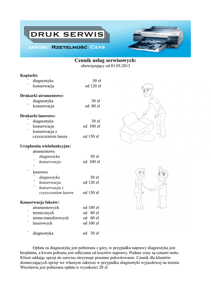 Cennik usług serwisowych: obowiązujący od 01.05.2013 Kopiarki: diagnostyka konserwacja 50 zł od 120 zł Drukarki atramentowe: diagnostyka konserwacja 30 zł od 80 zł Drukarki laserowe: diagnostyka konserwacja konserwacja z czyszczeniem lasera Urządzenia wielofunkcyjne: atramentowe diagnostyka konserwacja laserowe diagnostyka konserwacja konserwacja z czyszczeniem lasera Konserwacja faksów: atramentowych termicznych termo-transferowych laserowych diagnostyka 30 zł od 100 zł od 150 zł 50 zł od 100 zł 50 zł od 120 zł od 150 zł od 100 zł od 80 zł od 80 zł od 100 zł od 30 zł Opłata za diagnostykę jest pobierana z góry, w przypadku naprawy diagnostyka jest bezpłatna, a kwota pobrana jest odliczana od kosztów naprawy. Podane ceny są cenami netto. Klient oddając sprzęt do serwisu otrzymuje pisemne pokwitowanie. Cennik dla klientów dostarczających sprzęt we własnym zakresie w przypadku diagnostyki wyjazdowej na terenie Wrocławia jest pobierana opłata w wysokości 20 zł.