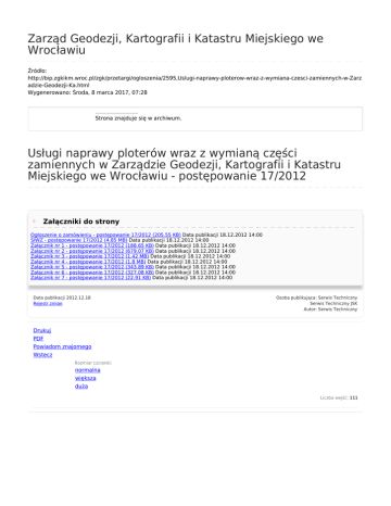 Zarząd Geodezji, Kartografii i Katastru Miejskiego we Wrocławiu Źródło: http://bip.zgkikm.wroc.pl/zgk/przetargi/ogloszenia/2595,Uslugi-naprawy-ploterow-wraz-z-wymiana-czesci-zamiennych-w-Zarz adzie-Geodezji-Ka.html Wygenerowano: Środa, 8 marca 2017, 07:28 Strona znajduje się w archiwum. Usługi naprawy ploterów wraz z wymianą części zamiennych w Zarządzie Geodezji, Kartografii i Katastru Miejskiego we Wrocławiu - postępowanie 17/2012 Załączniki do strony Ogłoszenie o zamówieniu - postępowanie 17/2012 (205.55 KB) Data publikacji 18.12.2012 14:00 SIWZ - postępowanie 17/2012 (4.85 MB) Data publikacji 18.12.2012 14:00 Załącznik nr 1 - postępowanie 17/2012 (188.65 KB) Data publikacji 18.12.2012 14:00 Załącznik nr 2 - postępowanie 17/2012 (679.07 KB) Data publikacji 18.12.2012 14:00 Załącznik nr 3 - postępowanie 17/2012 (1.42 MB) Data publikacji 18.12.2012 14:00 Załącznik nr 4 - postępowanie 17/2012 (1.8 MB) Data publikacji 18.12.2012 14:00 Załącznik nr 5 - postępowanie 17/2012 (343.89 KB) Data publikacji 18.12.2012 14:00 Załącznik nr 6 - postępowanie 17/2012 (327.08 KB) Data publikacji 18.12.2012 14:00 Załącznik nr 7 - postępowanie 17/2012 (22.91 KB) Data publikacji 18.12.2012 14:00 Data publikacji 2012.12.18 Rejestr zmian Osoba publikująca: Serwis Techniczny Serwis Techniczny JSK Autor: Serwis Techniczny Drukuj PDF Powiadom znajomego Wstecz Rozmiar czcionki: normalna większa duża Liczba wejść: 111