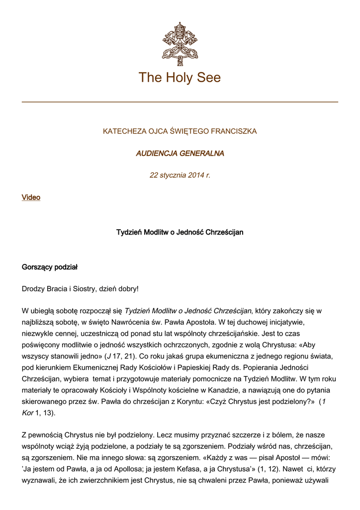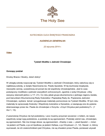 The Holy See KATECHEZA OJCA ŚWIĘTEGO FRANCISZKA AUDIENCJA GENERALNA 22 stycznia 2014 r. Video Tydzień Modlitw o Jedność Chrześcijan Gorszący podział Drodzy Bracia i Siostry, dzień dobry! W ubiegłą sobotę rozpoczął się Tydzień Modlitw o Jedność Chrześcijan, który zakończy się w najbliższą sobotę, w święto Nawrócenia św. Pawła Apostoła. W tej duchowej inicjatywie, niezwykle cennej, uczestniczą od ponad stu lat wspólnoty chrześcijańskie. Jest to czas poświęcony modlitwie o jedność wszystkich ochrzczonych, zgodnie z wolą Chrystusa: «Aby wszyscy stanowili jedno» (J 17, 21). Co roku jakaś grupa ekumeniczna z jednego regionu świata, pod kierunkiem Ekumenicznej Rady Kościołów i Papieskiej Rady ds. Popierania Jedności Chrześcijan, wybiera temat i przygotowuje materiały pomocnicze na Tydzień Modlitw. W tym roku materiały te opracowały Kościoły i Wspólnoty kościelne w Kanadzie, a nawiązują one do pytania skierowanego przez św. Pawła do chrześcijan z Koryntu: «Czyż Chrystus jest podzielony?» (1 Kor 1, 13). Z pewnością Chrystus nie był podzielony. Lecz musimy przyznać szczerze i z bólem, że nasze wspólnoty wciąż żyją podzielone, a podziały te są zgorszeniem. Podziały wśród nas, chrześcijan, są zgorszeniem. Nie ma innego słowa: są zgorszeniem. «Każdy z was — pisał Apostoł — mówi: ’Ja jestem od Pawła, a ja od Apollosa; ja jestem Kefasa, a ja Chrystusa’» (1, 12). Nawet ci, którzy wyznawali, że ich zwierzchnikiem jest Chrystus, nie są chwaleni przez Pawła, ponieważ używali 2 imienia Chrystusa, by oddzielić się od innych w łonie wspólnoty chrześcijańskiej. Lecz imię Chrystusa tworzy wspólnotę i jedność, nie podział! On przyszedł, by tworzyć jedność wśród nas, nie po to, by nas dzielić. Chrzest i krzyż są głównymi elementami, które łączą uczniów Chrystusa. Podziały natomiast osłabiają wiarygodność i skuteczność naszego zaangażowania ewangelizacyjnego i mogą zniweczyć moc krzyża (por. 1, 17). Św. Paweł gani Koryntian za ich spory, lecz dziękuje również Panu «za łaskę daną wam w Chrystusie Jezusie. W Nim to bowiem zostaliście wzbogaceni we wszystko, we wszelkie słowo i wszelkie poznanie» (1, 4-5). Te słowa Pawła nie są zwykłą formalnością, lecz znakiem, że on widzi przede wszystkim — i szczerze go to cieszy — dary uczynione przez Boga wspólnocie. Ta postawa Apostoła jest dla nas i dla każdej wspólnoty chrześcijańskiej zachętą do uznawania z radością darów Boga, obecnych w innych wspólnotach. Mimo cierpienia, jakim są podziały, które niestety wciąż się utrzymują, przyjmijmy słowa Pawła jako zachętę do szczerej radości z łask udzielonych przez Boga innym chrześcijanom. Mamy ten sam chrzest, tego samego Ducha Świętego, który dał nam łaskę: uznajmy to i cieszmy się z tego. Pięknie jest uznać łaskę, którą Bóg nas błogosławi, a jeszcze piękniej — znaleźć w innych chrześcijanach coś, czego potrzebujemy, co moglibyśmy przyjąć jako dar od naszych braci i naszych sióstr. Grupa kanadyjska, która przygotowała materiały na ten Tydzień Modlitw, nie zachęcała wspólnot do myślenia o tym, co mogłyby dać swoim sąsiadom chrześcijanom, lecz wezwała je do spotkania się, by zrozumiały, co od czasu do czasu wszystkie mogą przyjąć od innych. Wymaga to czegoś więcej. Wymaga wiele modlitwy, wymaga pokory, wymaga refleksji i nieustannego nawracania się. Idźmy naprzód tą drogą, modląc się o jedność chrześcijan, aby to zgorszenie ustało i by go już wśród nas nie było. Do Polaków: Serdecznie pozdrawiam siostry elżbietanki, niewidome dzieci z Lasek i wszystkich polskich pielgrzymów. Drodzy bracia i siostry, przez łaskę chrztu staliśmy się dziećmi Bożymi i uczniami Jezusa Chrystusa, powołanymi do świętości i ubogaconymi darami Ducha Świętego. Dlatego szczerze cieszmy się z tych darów i módlmy się o jedność chrześcijan. Z serca wam błogosławię. Apel w sprawie konfliktu w Syrii Dziś w Montreux w Szwajcarii rozpoczyna się międzynarodowa konferencja w sprawie zaprowadzenia pokoju w Syrii, a od 24 stycznia będą się toczyły w Genewie negocjacje. Proszę Pana, aby poruszył serca wszystkich, ażeby mając na względzie jedynie większe dobro ludu syryjskiego, ciężko doświadczonego, nie szczędzili wysiłków, by jak najszybciej doprowadzić do ustania przemocy i do zakończenia konfliktu, który spowodował już zbyt wiele cierpienia. Życzę 3 drogiemu narodowi syryjskiemu, by wszedł zdecydowanie na drogę pojednania, zgody i odbudowy z udziałem wszystkich obywateli, i by na niej każdy mógł spotkać w drugim nie wroga, nie rywala, lecz brata, którego trzeba przyjąć i uściskać. © Copyright - Libreria Editrice Vaticana