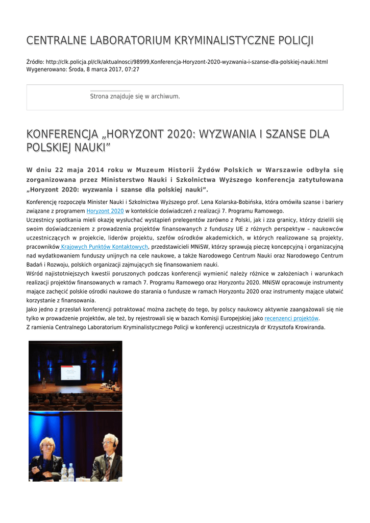 CENTRALNE LABORATORIUM KRYMINALISTYCZNE POLICJI Źródło: http://clk.policja.pl/clk/aktualnosci/98999,Konferencja-Horyzont-2020-wyzwania-i-szanse-dla-polskiej-nauki.html Wygenerowano: Środa, 8 marca 2017, 07:27 Strona znajduje się w archiwum. KONFERENCJA „HORYZONT 2020: WYZWANIA I SZANSE DLA POLSKIEJ NAUKI” W dniu 22 maja 2014 roku w Muzeum Historii Żydów Polskich w Warszawie odbyła się zorganizowana przez Ministerstwo Nauki i Szkolnictwa Wyższego konferencja zatytułowana „Horyzont 2020: wyzwania i szanse dla polskiej nauki”. Konferencję rozpoczęła Minister Nauki i Szkolnictwa Wyższego prof. Lena Kolarska-Bobińska, która omówiła szanse i bariery związane z programem Horyzont 2020 w kontekście doświadczeń z realizacji 7. Programu Ramowego. Uczestnicy spotkania mieli okazję wysłuchać wystąpień prelegentów zarówno z Polski, jak i zza granicy, którzy dzielili się swoim doświadczeniem z prowadzenia projektów finansowanych z funduszy UE z różnych perspektyw – naukowców uczestniczących w projekcie, liderów projektu, szefów ośrodków akademickich, w których realizowane są projekty, pracowników Krajowych Punktów Kontaktowych, przedstawicieli MNiSW, którzy sprawują pieczę koncepcyjną i organizacyjną nad wydatkowaniem funduszy unijnych na cele naukowe, a także Narodowego Centrum Nauki oraz Narodowego Centrum Badań i Rozwoju, polskich organizacji zajmujących się finansowaniem nauki. Wśród najistotniejszych kwestii poruszonych podczas konferencji wymienić należy różnice w założeniach i warunkach realizacji projektów finansowanych w ramach 7. Programu Ramowego oraz Horyzontu 2020. MNiSW opracowuje instrumenty mające zachęcić polskie ośrodki naukowe do starania o fundusze w ramach Horyzontu 2020 oraz instrumenty mające ułatwić korzystanie z finansowania. Jako jedno z przesłań konferencji potraktować można zachętę do tego, by polscy naukowcy aktywnie zaangażowali się nie tylko w prowadzenie projektów, ale też, by rejestrowali się w bazach Komisji Europejskiej jako recenzenci projektów. Z ramienia Centralnego Laboratorium Kryminalistycznego Policji w konferencji uczestniczyła dr Krzysztofa Krowiranda. Ocena: 0/5 (0) Tweetnij