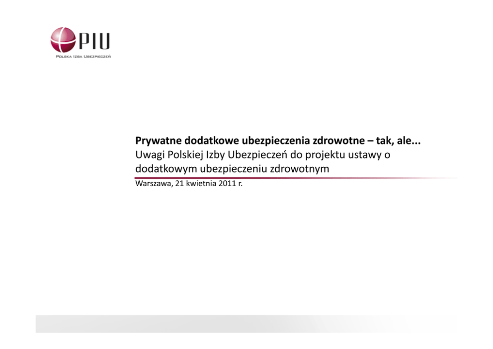 Prywatne dodatkowe ubezpieczenia zdrowotne – tak, ale... Uwagi Polskiej Izby Ubezpieczeń do projektu ustawy o dodatkowym ubezpieczeniu zdrowotnym Warszawa, 21 kwietnia 2011 r. Plan konferencji • Dlaczego zabieramy głos w tej sprawie? • Uzasadnienie do wprowadzenia ustawy a projekt • • • ustawy Założenia do ustawy a projekt ustawy Czy dobrowolne dodatkowe ubezpieczenie zdrowotne jest zgodne z Konstytucją RP? Czego należy oczekiwać od ustawy, która przyczyni się do upowszechnienia dodatkowych ubezpieczeń zdrowotnych w Polsce? – głos ekspertów Dlaczego zabieramy głos? • Zgodnie z ustawą o działalności ubezpieczeniowej, PIU ma ustawowy obowiązek brania czynnego udziału w konsultacjach wszystkich aktów prawnych, związanych z ubezpieczeniami. • Celem takiego działania jest współpraca z legislatorem, by tworzone prawo w możliwie najpełniejszy sposób służyło osobom korzystającym z ochrony ubezpieczeniowej. Dlaczego zabieramy głos? • Naszym celem jest taka zmiana zapisów ustawy, aby wpisując ją w system ochrony zdrowia w Polsce, przyczynić się do poprawy dostępności świadczeń opieki zdrowotnej dla pacjentów oraz zmniejszyć ich obciążenia finansowe w sytuacji choroby lub wypadku. • Nasze uwagi mają pomóc w poprawieniu projektu ustawy, który jest niezbędny dla realizacji celów reformy ochrony zdrowia. Udział ubezpieczeń w wydatkach na zdrowie jest marginalny Struktura wydatków na zdrowie w Polsce (w mld zł, dane 2009) Marginalny udział zryczałtowanych form płatności za usługi zdrowotne (ubezpieczeń) skutkuje utrudnieniem dostępu do opieki zdrowotnej osobom mniej zamożnym, które w sytuacji choroby i niewydolnego publicznego systemu ochrony zdrowia zmuszone są płacić za świadczenia w formie FFS kosztem ogromnych wyrzeczeń Uzasadnienie do wprowadzenia ustawy a projekt ustawy • Poprawa dostępności do świadczeń opieki zdrowotnej. • Stworzenie świadczeniodawcom, alternatywnych w stosunku • • • do kontraktów z NFZ, źródeł finansowania świadczeń opieki zdrowotnej. Stworzenie świadczeniodawcom możliwości racjonalnego zarządzania i wykorzystania wolnych zasobów. Zwiększenie poziomu finansowania świadczeń opieki zdrowotnej. Zwiększenie poziomu jakości realizowanych świadczeń. PIU zgadza się w pełni, że powyższe cele uzasadniają wprowadzenie ustawy o dodatkowym ubezpieczeniu zdrowotnym. Wg. nas zapisy przedstawionego projektu nie korespondują z tymi celami. Projekt ustawy o DUZ z 4 marca 2011 - konsultacje społeczne Założenia Projekt Definicja dodatkowego ubezpieczenia zdrowotnego Możliwość finansowania świadczeń medycyny pracy Możliwość finansowania z Zakładowych Funduszy Św. Socjalnych Doprecyzowanie zasad współpracy ubezpieczycieli z publicznymi świadczeniodawcami Zachęta dla osób fizycznych w postaci ulgi podatkowej Ochrona praw pacjentów leczonych wyłącznie w ramach środków publicznych Brak precyzyjnej definicji czym jest DUZ i nieprecyzyjne zapisy budzące wątpliwości czy DUZ mogą być oferowane w obu działach ubezpieczeń Dalsze, niezagrożone funkcjonowanie abonamentów medycznych De facto uniemożliwienie współpracy ze wszystkimi świadczeniodawcami, mającymi kontakty NFZ Nierealna z powodu sytuacji budżetowej i procedury nadmiernego deficytu Nadregulacja umożliwiająca NFZ nadzór nad rynkiem prywatnych ubezpieczeń zdrowotnych, zapisy niekorzystne dla świadczeniodawców i ubezpieczycieli Konsekwencje wprowadzenia obecnych zapisów 1. Brak precyzyjnej definicji DUZ 2. Nadmierna rola NFZ Wątpliwości ubezpieczycieli co do sensu inwestowania w obszar ochrony zdrowia De facto brak możliwości kontraktowania świadczeniodawców publicznych Brak pełnej możliwości rozwoju DUZ Pogłębiony podział na świadczeniodawców publicznych i prywatnych Brak możliwości „dorośnięcia” ubezpieczycieli do roli płatników zdolnych konkurować z NFZ Brak bodźców dla świadczeniodawców publicznych do konkurencji, zwiększania efektywności i jakości Brak możliwości przeprowadzenia efektywnej reformy! Brak możliwości „zintegrowania” całego systemu ochrony zdrowia oraz osiągnięcia efektu synergii Zgodność systemu dodatkowego ubezpieczenia zdrowotnego z Konstytucją RP „ … Konstytucja RP, w szczególności jej przepis art. 68 ust 2, nie stanowi bariery uniemożliwiającej tworzenie systemu dodatkowego ubezpieczenia zdrowotnego, który wraz z systemem świadczeń opieki zdrowotnej finansowanych ze środków publicznych mógłby stanowić gwarancję realizacji konstytucyjnego prawa do ochrony zdrowia”. Fragment opinii prawnej Kancelarii Prawniczej Domański Zakrzewski Palinka przygotowanej przez Profesora Michała Kuleszę Dr hab. Marcina Matczaka Warunki konstytucyjności systemu dodatkowego ubezpieczenia zdrowotnego Obowiązek zapewnienia równego dostępu do świadczeń opieki zdrowotnej, w tym w szczególności świadczeń finansowanych ze środków publicznych Obowiązek ustawowego określenia warunków i zakresu udzielanych świadczeń opieki zdrowotnej Obowiązek stworzenia jednoznacznej, precyzyjnej i funkcjonalnej konstrukcji systemu ochrony zdrowia Czego należy oczekiwać od ustawy, która przyczyni się do upowszechnienia dodatkowych ubezpieczeń zdrowotnych w Polsce? Skutki uchwalenia ustawy spełniającej założenia dla systemu ochrony zdrowia EFEKT SYNERGII - stopniowe mieszanie się środków publicznych i prywatnych Rynek leków Możliwość ubezpieczenia od kosztu zakupu lekarstw oraz dopłat do lekarstw refundowanych Odciążenie NFZ zarówno w segmencie ambulatoryjnym, jak i szpitalnym Ubezpieczyciele Przełamanie monopolu NFZ w kontraktowaniu publicznych świadczeniodawców Pracodaw cy Kontraktowanie przez ubezpieczycieli świadczeń medycyny pracy Świadczeniodawcy Pracodawcy Korzyści uchwalenia ustawy spełniającej założenia Dla systemu ochrony zdrowia Nowy zorganizowany strumień środków do systemu o w
