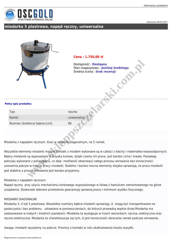 Informacje o produkcie Utworzono 08-03-2017 miodarka 5 plastrowa, napęd ręczny, uniwersalna Cena : 1.750,00 zł Pełny opis produktu: ręczna Ramki: uniwersalna Rozmiar (średnica) bębna [cm]: 80 ep ps zc ze Typ: la r sk i.c om .p l Dostępność : Dostępny Stan magazynowy : poniżej średniego Średnia ocena : brak recenzji kl Miodarka z napędem ręcznym. Kosz w układzie diagonalnym, na 5 ramek. Wszystkie elementy miodarki mające kontakt z miodem wykonane są w całości z blachy i materiałów kwasoodpornych. .s Bębny miodarek są wyposażone w łożyska kulowe, dzięki czemu ich praca jest bardzo cicha i trwała. Posiadają w pokrywy wykonane z poliwęglanu, co daje możliwość obserwacji całego procesu wirowania bez konieczności w w unoszenia pokryw w trakcie pracy miodarki. Stabilne i bardzo mocne elementy stojaka sprawiają, że praca miodarki jest stabilna a proces wirowania jest bardzo przyjemny. Miodarka z napędem ręcznym: Napęd ręczny przy użyciu mechanizmu korbowego wyposażonego w listwę z hamulcem zamontowanego na górze urządzenia. Doskonale dobrane przełożenia gwarantują sprawną pracę i minimum wysiłku fizycznego. MIODARKI DIAGONALNE Miodarka 3, 4 lub 5 plastrowa. Niewielkie rozmiary bębna miodarki sprawiają, iż mogą być transportowane na pasieczyska i bez problemu ustawiane w pomieszczeniach, do których prowadzą wąskie drzwi.Miodarka ma zastosowanie w małych i średnich pasiekach. Miodarka ta występuje w trzech wariantach: ręczna, elektryczna oraz ręczno-elektryczna. Miodarka ta charakteryzuje się tym, iż jest konieczność obracania ramek podczas wirowania. Uwaga: miodarki wysyłamy na palecie. Prosimy o kontakt w celu skalkulowania kosztu wysyłki. Wygenerowano w programie www.oscGold.com ep kl .s w w w i.c om .p l sk la r zc ze ps