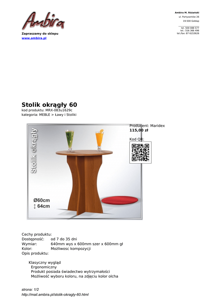 Ambira M. Różański ul. Partyzantów 26 19-500 Gołdap ___________________ tel. 500 088 577 tel.: 516 366 496 tel./fax: 87 6153626 Zapraszamy do sklepu www.ambira.pl Stolik okrągły 60 kod produktu: MRX-083u1629c kategoria: MEBLE > Ławy i Stoliki Producent: Maridex 115,00 zł Kod QR: Cechy produktu: Dostępność: od 7 do 35 dni Wymiar: 640mm wys x 600mm szer x 600mm gł Kolor: Możliwosc kompozycji Opis produktu: Klasyczny wygląd Ergonomiczny Produkt posiada świadectwo wytrzymałości Możliwość wyboru koloru, na zdjęciu kolor olcha strona: 1/2 http://mail.ambira.pl/stolik-okragly-60.html strona: 2/2 http://mail.ambira.pl/stolik-okragly-60.html