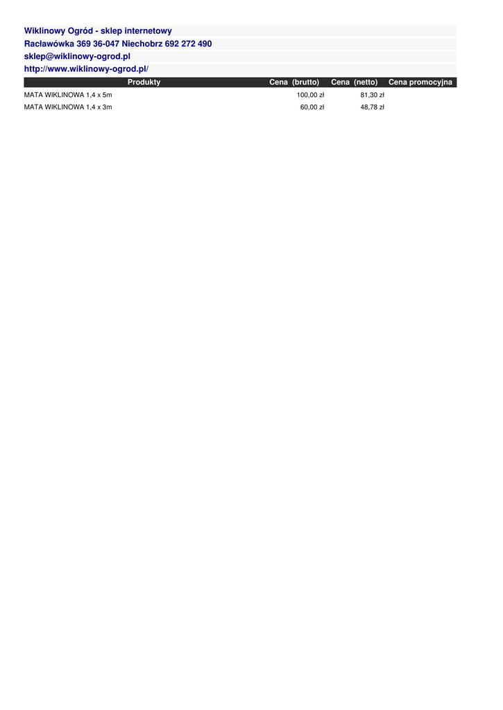 Wiklinowy Ogród - sklep internetowy Racławówka 369 36-047 Niechobrz 692 272 490 [email protected] http://www.wiklinowy-ogrod.pl/ Produkty Cena (brutto) Cena (netto) MATA WIKLINOWA 1,4 x 5m 100,00 zł 81,30 zł MATA WIKLINOWA 1,4 x 3m 60,00 zł 48,78 zł Cena promocyjna