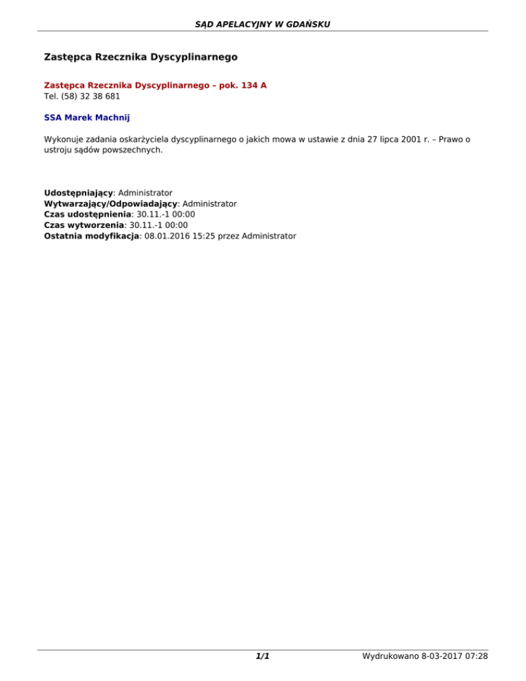 SĄD APELACYJNY W GDAŃSKU Zastępca Rzecznika Dyscyplinarnego Zastępca Rzecznika Dyscyplinarnego – pok. 134 A Tel. (58) 32 38 681 SSA Marek Machnij Wykonuje zadania oskarżyciela dyscyplinarnego o jakich mowa w ustawie z dnia 27 lipca 2001 r. – Prawo o ustroju sądów powszechnych. Udostępniający: Administrator Wytwarzający/Odpowiadający: Administrator Czas udostępnienia: 30.11.-1 00:00 Czas wytworzenia: 30.11.-1 00:00 Ostatnia modyfikacja: 08.01.2016 15:25 przez Administrator 1/1 Wydrukowano 8-03-2017 07:28