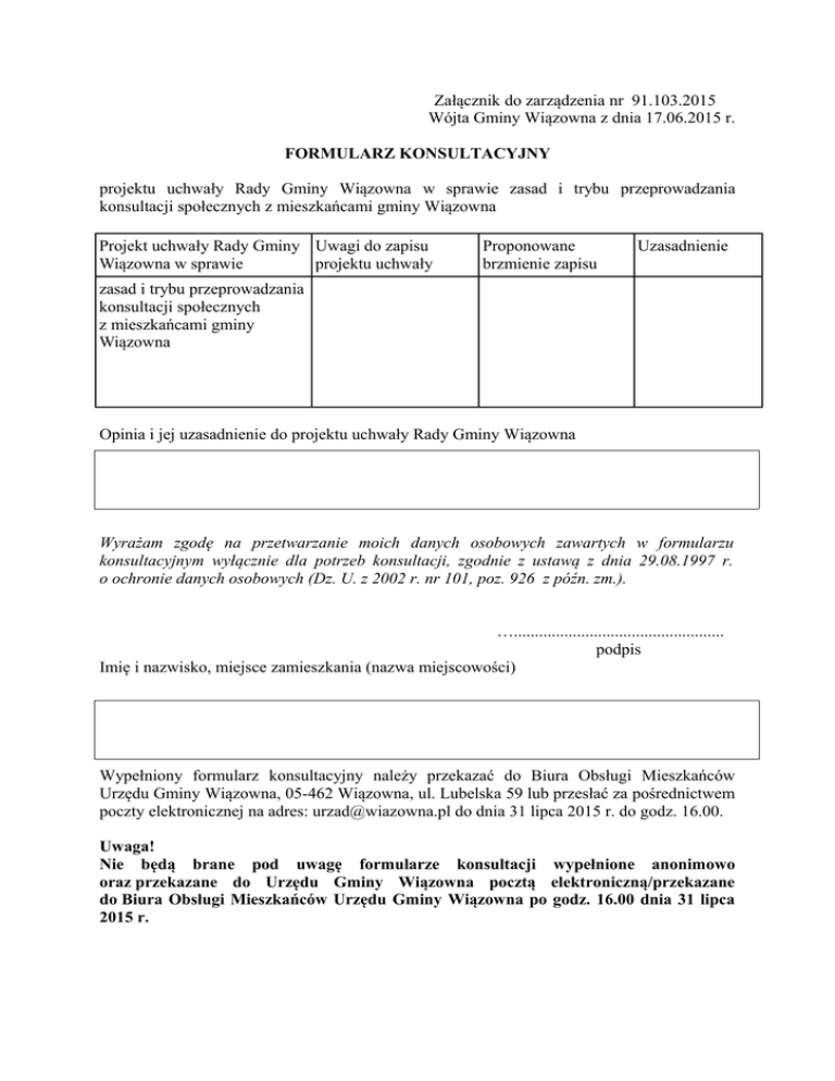 Załącznik do zarządzenia nr 91.103.2015 Wójta Gminy Wiązowna z dnia 17.06.2015 r. FORMULARZ KONSULTACYJNY projektu uchwały Rady Gminy Wiązowna w sprawie zasad i trybu przeprowadzania konsultacji społecznych z mieszkańcami gminy Wiązowna Projekt uchwały Rady Gminy Uwagi do zapisu Wiązowna w sprawie projektu uchwały Proponowane brzmienie zapisu Uzasadnienie zasad i trybu przeprowadzania konsultacji społecznych z mieszkańcami gminy Wiązowna Opinia i jej uzasadnienie do projektu uchwały Rady Gminy Wiązowna Wyrażam zgodę na przetwarzanie moich danych osobowych zawartych w formularzu konsultacyjnym wyłącznie dla potrzeb konsultacji, zgodnie z ustawą z dnia 29.08.1997 r. o ochronie danych osobowych (Dz. U. z 2002 r. nr 101, poz. 926 z późn. zm.). ….................................................. podpis Imię i nazwisko, miejsce zamieszkania (nazwa miejscowości) Wypełniony formularz konsultacyjny należy przekazać do Biura Obsługi Mieszkańców Urzędu Gminy Wiązowna, 05-462 Wiązowna, ul. Lubelska 59 lub przesłać za pośrednictwem poczty elektronicznej na adres: [email protected] do dnia 31 lipca 2015 r. do godz. 16.00. Uwaga! Nie będą brane pod uwagę formularze konsultacji wypełnione anonimowo oraz przekazane do Urzędu Gminy Wiązowna pocztą elektroniczną/przekazane do Biura Obsługi Mieszkańców Urzędu Gminy Wiązowna po godz. 16.00 dnia 31 lipca 2015 r.