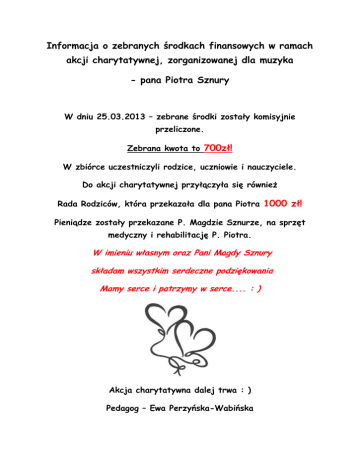 Informacja o zebranych środkach finansowych w ramach akcji charytatywnej, zorganizowanej dla muzyka - pana Piotra Sznury W dniu 25.03.2013 – zebrane środki zostały komisyjnie przeliczone. Zebrana kwota to 700zł! W zbiórce uczestniczyli rodzice, uczniowie i nauczyciele. Do akcji charytatywnej przyłączyła się również Rada Rodziców, która przekazała dla pana Piotra 1000 zł! Pieniądze zostały przekazane P. Magdzie Sznurze, na sprzęt medyczny i rehabilitację P. Piotra. W imieniu własnym oraz Pani Magdy Sznury składam wszystkim serdeczne podziękowania Mamy serce i patrzymy w serce.... : ) Akcja charytatywna dalej trwa : ) Pedagog – Ewa Perzyńska-Wabińska