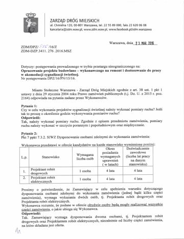ZARZAD DROG MIEJSKICH ul.⊂ hmielna 1 20,00‐ 801 Warszawal tel,225589000′ faks 22 620 06 08 kancelattac)zdm.Waw,pl,www.zdm.waw,pl,www.facebook.pν zdm,warszawa Warszawa, dnia_Jj_UAfi-2111[_ ADM:DPU _;se tr6tz ZDM-DZP .3 4I I . 27 6 .2OI 6.MSZ Dotyczy: postgpowania prowadzonego w trybie przetargu nieograniczonego na: Opracowanie projektu budowlano - wykonawczego na remont i dostosowanie do pracy w akomodacji sygnalizacji Swietlnej. Nr postgpowania DPZ/I 6/PN I | 5 I | 6. Miasto Stoleczne Warszawa - Zaruqd Dr6g Miejskich zgodnie z art.38 ust. I pkt 1 ustawy z dnia29 stycznia 2004 roku Prawo zam6wieri publicznych (tj. Dz. U. 22015 r. poz. 2164) odpowiada na pytania zadaneprzez Wykonawc6w. Pytanie 1: Czy w celu wykonania projekt6w sygnalizacji Swietlnej nalezy wykonai pomiary ruchu? JeSli tak to proszQ o okreSlenie godzin wykonywania pomiar6w ruchu? OdpowiedZ: Tak, nalezy wykonad pomiary ruchu. Zgodnie z opisem przedmiotu zam6wienia, pomiary ruchu nalely wykona6 w szczycie porannym i popoludniowym orazmigdzyczasie. Pytanie 2: Pkt 7 ppkt 7.3.2. SIWZ Dysponowanie osobami zdolnymi do wykonania zam6wienia: Wykonawca przedstawi w ofercie kandydat6w nakuzde L.p. 1 2. Stanowisko Projektant rob6t drogowych Projektant rob6t elektrvcznvch Wymagana liczba os6b s@ Okres posladanla wymaganych upra、 1層 1len `w latach) DoSwiadczenie zawodowe (liczba lat pracy na danym stanowisku) 1 osoba 4 1ata 4 1ata I 4 1ata 4 1ata osoba Prosimy o potwierdzenie, 2e Zalnawi可 甲y w Celu spelnienia warunku dotyczTego dysponowania osobalni zdolnymi do wykonania zalln6wienia cedna bボ 乏kilku czQ`ci zaln6wienia),wymaga wykazania dw6ch os6b,1。 Praektanta rob6t drogowych oraz Praektanta rob6t elektrycznych. Wykonawca rozumie,2e podane w ofercie obvdwie osobv bcda mOglv realizow“ czcSci zaln6wienia,ojakie ubiega siQ Wykonawca. wszvstkie Odpowiedi: Tak. ZanawiajqcY wymaga dysponowania dwoma osobami, tj. Projektantem rob6t zam6wienia, drogowych oraz Projektantem rob6i elektrycznych, niezaleZnie od liczby czg6ci na kt6re skladana jest oferta' Pytanie 3: Prosimy o doprecyzowanie sposobu wniesienia wadium. - Czy w przypadku skladania ofert na kilka czgSci zam6wienia, Wykonawca mohe wnie56 wadium w formie pieni4dza w wysoko6ci, bgd4cej sumq kwot wadi6w wymaganych na poszczeg6lnych czESciach zam6wienia, tj. jedno sumaryczne wadium? - Czy Zamawiajqcy dopuszcza wniesienia wadium w formie jednej gwarancji bankowej na sumaryczn4 kwotE wadi6w wymaganych we wszystkich czE6ciach zam6wienia, o kt6re ubiega sig Wykonawca? Odpowiedf: - W pr4npadku skladania oferty na kilka czg6ci zam6wienia, Wykonawca mohe wnieSd wadium w pieni4dzu, bgd4ce sumq kwot wadi6w, wymaganych nakald4czgfi(, zam6wienia, ze wskazaniem kwot wadium na poszczeg6lne czgsci zam6wienia, na jakie skladana jest oferta, i czESci zam6wienia, jakiej kahdaztych kwot dotyczy. - W przypadku skladania oferty na kilka czgsci zam6wienia, Wykonawca mo2e wnie56 wadium w formie jednej gwarancji bankowej na sumaryczn4 kwotg wadi6w wymaganych we wszystkich czgsciach zam6wienia, ze wskazaniem kwot wadium na poszczeg6lne czgSci zam6wienia, na jakie skladana jest oferta, i czgsci zam6wienia, jakiej kuzda z tych kwot dotyczy. Pytanie 4: Du1aliczbalokalizacji objqtych przetargiem dotyczy skrzyZowari funkcjonuj4cych na ci4gach lub w sieciach skoordynowanych, niekiedy pracuj4cych pod wysokim stopniem obciqpenia ruchem. Czy w zwiq,zku ztymZarnavmajqcy oczekuje wykorzystania w pracach projektowych symulacji mikroskopowych ruchu (np. w programie Simtraffic, Vissim, Aimsun itp.) w celu dokladniejszego zbadania przebiegu procesu ruchu drogowego (np. progresji pojazd6w wzdlu1 arterii skoordynowanych, badania pojemno5ci kr6tkich pas6w wydzielonych, wykrywani a ryzyka wzaj emne go blokowania bli sko polozonych skrzyZowan itp. ) ? Odpowiedi: Zaiawiajqcy nie oczekuje wykorzystania w pracach projektowych symulacji mikroskopowych w programach Simtraffic, Vissim lub Aimsun. Zanaviai4cy oczekuje dostarczenia projekt6w zatwierdzonych przez Biuro Drogownictwa i Komunikacji Inzyniera Ruchu m.st. Warszawy. W przypadku wqtpliwo6ci na etapie zatwierdzania projekt6w, Inzynier Ruchu m.st. Warszav,ry moae Zqda(, przedstawienia symulacji mikroskopowych. Pytanie 5: ir1 Zamavaajqcy oczekuje przetestowania poprawno6ci projektowanych algorytm6w steiowania akomodacyj nego w Srodowisku mikrosymulacyj nym (Vissim lub r6wnow uinym) czy wystarczaj4ce UEazielrzedstawienie algorytmu nieprzetestowanego przy wykorzystaniu wykonania symulacji mikroskopowych: -rtod komputero*ylnf * przypadku oczekiwania Czy nale1y przedsiawie porOwnanie miar jako5ci ruchu podczas pracY staloczasowej i akomodacyj"Lj (np. o ile skr6ci sig czas oczekiwania pojazd6w lub pieszych, itp')? OdpowiedZ: Zaiawiajqcy nie oczekuje przedstawienia poprawno6ci projektowanych algorytm6w sterowania akomodacyjtt.go * Srodowisku mikrosymulacyjnym (Vissim lub r6wnowaZnym). Zamawajqcy ott.[u;. dostarczenia algorytm6w zaakceptowanych przez Biuro m.st. Orogownictwa i Komunikacji InZyniera Ruchu m.st. Warszavry. Jednak InZynier Ruchu sterowania War'szawy na etapie zat*ierdzanra projekt6w mo1e 24da(, weryfikacji algorytm6w za pomoc4 narzgdzi symulacyjnych. Pytanie 6: Jak m巧 ■ by6 Wykrywani piesi w sterowaniu akomodacゴ nym?CZy wystarcz巧 甲ym rozwiattaniem bQdzie stosowanie przycisk6w, czy nale2y przewidzieC rozwiattania automatyczne,czy te2 stosowa6 oba warianty?Czy mo2na zrczygnowa6 z dctek● i piesztt na tych skrzy2owaniach, gdzie w prograrnie sygnalizacJi mo2na zlniegciC fazy piesze na wszystkich prz● SCiach,w cieniu obslugi grup kolowych(npo W trakcie faz koordynowanych)。 Odpowied壺 : , Do detektti pieszych nale2y zastosowa6 na prz可 `Ciach akomodowanych dla pieszych oraz naleη przeWidZieC automatyczna deteklQ(npo przez detcktoryprzyciski radarowe).Na prZttSCiach wzdlu2 kierunk6w g16wnych(koordynOwanych)nie stOS可 emy przycisk6w dla pieszych. Pytanie 7: Dot.czQ6ci 9:Opracowanie pr● ektu budowlano‐ wykonawczego na remonti dostOsowanie do p