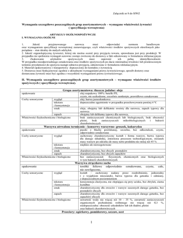 Załącznik nr 8 do SIWZ Wymagania szczegółowe poszczególnych grup asortymentowych – wymagane właściwości żywności ( specyfikacja wewnętrzna) ARTYKUŁY OGÓLNOSPOŻYWCZE I. WYMAGANIA OGÓLNE 1. Jakość przyjmowanego surowca musi odpowiadać normom handlowym oraz wymaganiom specyfikacji wewnętrznej zamawiającego, czyli właściwości środków spożywczych określonych jako pożądane – stan idealny do małych odchyleń. 2. Jakość organoleptyczną żywności, której nie można ocenić przy przyjęciu towaru, sprawdzana jest przy produkcji. W przypadku nie spełnienia wymagań surowiec zostaje zwrócony do dostawcy a fakt odnotowany w formularzu reklamacyjnym 3. Znakowanie artykułów spożywczych musi zapewnić ich pełną identyfikowalność. W przypadku nieodpowiedniego oznakowania oraz środków spożywczych po dacie minimalnej trwałości lub przekroczonym terminie przydatności do spożycia nastąpi odmowa przyjęcia, odnotowana w formularzu reklamacyjnym. 4. Materiał opakowaniowy i transportowy dopuszczony do kontaktu z żywnością 5. Dostawca musi funkcjonować zgodnie z aktualnymi wymaganiami prawa żywnościowego, sposób dostawy oraz dostarczana żywność musi być zgodna z wszystkimi wymaganiami prawa żywnościowego. II. Wymagania szczegółowe poszczególnych grup asortymentowych – wymagane właściwości środków spożywczych ( specyfikacja wewnętrzna). Grupa asortymentowa: tłuszcze jadalne: oleje opakowanie Cechy sensoryczne wygląd tekstura i konsystencja smak zapach Właściwości fizykochemiczne i biologiczne olej rzepakowy 100%: butelki PE, czyste, nie uszkodzone, szczelnie zamknięte, prawidłowo oznakowane olej: barwa jasnosłomkowa dopuszczalne zgęstnienie w przypadku przechowywania poniżej 4 ºC oleje, obojętny lub delikatnie swoisty dla surowca, zapach typowy dla surowca obojętny lub delikatny typowy dla surowca, brak zanieczyszczeń chemicznych lub biologicznych, brak obecności pleśni, brak zanieczyszczeń mikrobiologicznych i bakterii chorobotwórczych Warzywa utrwalone termicznie - konserwy warzywne- groszek, kukurydza opakowanie Cechy sensoryczne wygląd tekstura i konsystencja smak zapach Właściwości fizykochemiczne i biologiczne charakterystyczny, bez obcych posmaków charakterystyczny, bez obcych zapachów bez zanieczyszczeń fizycznych, chemicznych oraz biologicznych w tym bakterii chorobotwórczych Warzywa strączkowe suche torebki foliowe odpowiednio nie zawilgocone, opakowanie Cechy sensoryczne puszki z blachy powlekanej, szczelne, bez odkształceń, czyste, odpowiednio oznakowane zachowany charakterystyczny kształt i forma warzyw, barwa typowa dla danego składnika, zmieniona procesem technologicznym, stosunek masy warzyw po odcieku do masy netto produktu nie mniej niż 45 % miękkie ale nierozgotowane wygląd tekstura i konsystencja smak zapach Właściwości fizykochemiczne i biologiczne oznakowane, czyste, całe, kształt – zachowany nadany przez rozdrobnienie, jednorodny ( z wyjątkiem mieszanek), barwa typowa dla gatunku i odmiany, z dopuszczalnym pociemnieniem konsystencja elastyczna, nie zlepiająca się przy ucisku, bez zbryleń, ziarna kształtne charakterystyczny dla owoców i warzyw suszonych danego gatunku, bez posmaków obcych charakterystyczny dla owoców i warzyw suszonych danego gatunku, bez zapachów obcych zawartość wody nie więcej niż 10 – 35 %, zawartość zanieczyszczeń organicznych pochodzenia roślinnego nie więcej niż 0,3 %, niedopuszczalna obecność szkodników lub ich śladów, pleśni oraz bakterii chorobotwórczych Przeciery: ogórkowy, pomidorowy, szczaw, ocet 1 opakowanie Cechy sensoryczne wygląd tekstura i konsystencja smak zapach Właściwości fizykochemiczne i biologiczne szklane, bez wyszczerbień, nie uszkodzone, szczelne, właściwie oznakowane, czyste barwa właściwa dla danego gatunku, ocet bezbarwny jednorodna, przetarta masa, bez rozwarstwień, ocet płynna, klarowna charakterystyczny dla surowca, lekko kwaśny, bez posmaków obcych, ocet kwaśny charakterystyczny dla surowca, bez zapachów obcych, ocet ostry kwaśny zawartość zanieczyszczeń organicznych pochodzenia roślinnego nie więcej niż 0,05 %, Brak zanieczyszczeń chemicznych, brak oznak gnicia, zapleśnienia, sfermentowania, brak zanieczyszczeń mikrobiologicznych i bakterii chorobotwórczych, Mąki typ 550 opakowanie Cechy sensoryczne wygląd tekstura i konsystencja smak zapach Właściwości fizykochemiczne i biologiczne torebki kg, odpowiednio oznakowane, czyste, bez oznak zawilgocenia, zapleśnienia, obecności szkodników zbożowo – mącznych, całe barwa biała z odcieniem żółtawym, mąką żytnia ciemniejsza, gładka, śliska w dotyku, sypka, swoisty , lekko słodkawy, przyjemny, swoisty, charakterystyczny dla danej mąki, bez obcych zapachów, wilgotność do 15 %, brak obecności zanieczyszczeń fizycznych ( piasku) i biologicznych, obecności pleśni, szkodników, bakterii chorobotwórczych Kasze, ryż, koncentraty zbożowe: płatki, opakowanie Cechy sensoryczne wygląd tekstura i konsystencja smak zapach Właściwości fizykochemiczne i biologiczne torebki papierowe z folią wielowarstwową lub folia, odpowiednio oznakowane, czyste, bez oznak zawilgocenia, zapleśnienia, obecności szkodników zbożowo – mącznych, całe charakterystyczny dla danego gatunku, bez oznak zepsucia, uszkodzeń, prawidłowy kształt i barwa ziaren, bez zanieczyszczeń fizycznych charakterystyczna dla stopnia rozdrobnienia, sypka, suche, bez oznak lepkości i grudek, pieczywo chrupkie, 1 część wagowa kaszy suchej po ugotowaniu ma dawać 2,5 części wagowych kaszy gotowanej po ugotowaniu smak i zapach odpowiadający produktowi świeżemu, wykluczony posmak skwaśniały lub gorzki, charakterystyczny, bez obcych zapachów, stęchłych brak zanieczyszczeń fizycznych, oznak i pozostałości szkodników, brak zanieczyszczeń biologicznych, pleśni oraz bakterii chorobotwórczych Makarony- mąka makaronowa ,