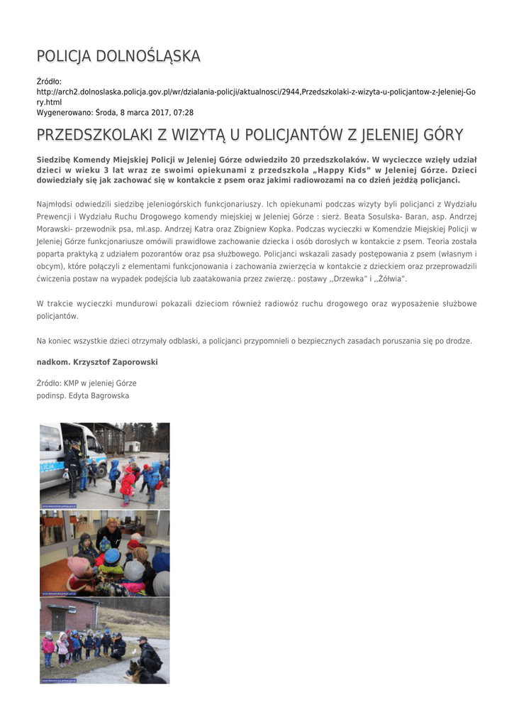 POLICJA DOLNOŚLĄSKA Źródło: http://arch2.dolnoslaska.policja.gov.pl/wr/dzialania-policji/aktualnosci/2944,Przedszkolaki-z-wizyta-u-policjantow-z-Jeleniej-Go ry.html Wygenerowano: Środa, 8 marca 2017, 07:28 PRZEDSZKOLAKI Z WIZYTĄ U POLICJANTÓW Z JELENIEJ GÓRY Siedzibę Komendy Miejskiej Policji w Jeleniej Górze odwiedziło 20 przedszkolaków. W wycieczce wzięły udział dzieci w wieku 3 lat wraz ze swoimi opiekunami z przedszkola „Happy Kids” w Jeleniej Górze. Dzieci dowiedziały się jak zachować się w kontakcie z psem oraz jakimi radiowozami na co dzień jeżdżą policjanci. Najmłodsi odwiedzili siedzibę jeleniogórskich funkcjonariuszy. Ich opiekunami podczas wizyty byli policjanci z Wydziału Prewencji i Wydziału Ruchu Drogowego komendy miejskiej w Jeleniej Górze : sierż. Beata Sosulska- Baran, asp. Andrzej Morawski- przewodnik psa, mł.asp. Andrzej Katra oraz Zbigniew Kopka. Podczas wycieczki w Komendzie Miejskiej Policji w Jeleniej Górze funkcjonariusze omówili prawidłowe zachowanie dziecka i osób dorosłych w kontakcie z psem. Teoria została poparta praktyką z udziałem pozorantów oraz psa służbowego. Policjanci wskazali zasady postępowania z psem (własnym i obcym), które połączyli z elementami funkcjonowania i zachowania zwierzęcia w kontakcie z dzieckiem oraz przeprowadzili ćwiczenia postaw na wypadek podejścia lub zaatakowania przez zwierzę.: postawy ,,Drzewka” i ,,Żółwia”. W trakcie wycieczki mundurowi pokazali dzieciom również radiowóz ruchu drogowego oraz wyposażenie służbowe policjantów. Na koniec wszystkie dzieci otrzymały odblaski, a policjanci przypomnieli o bezpiecznych zasadach poruszania się po drodze. nadkom. Krzysztof Zaporowski Źródło: KMP w jeleniej Górze podinsp. Edyta Bagrowska Ocena: 0/5 (0) Tweetnij