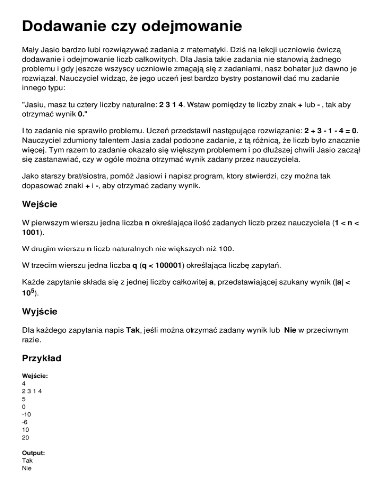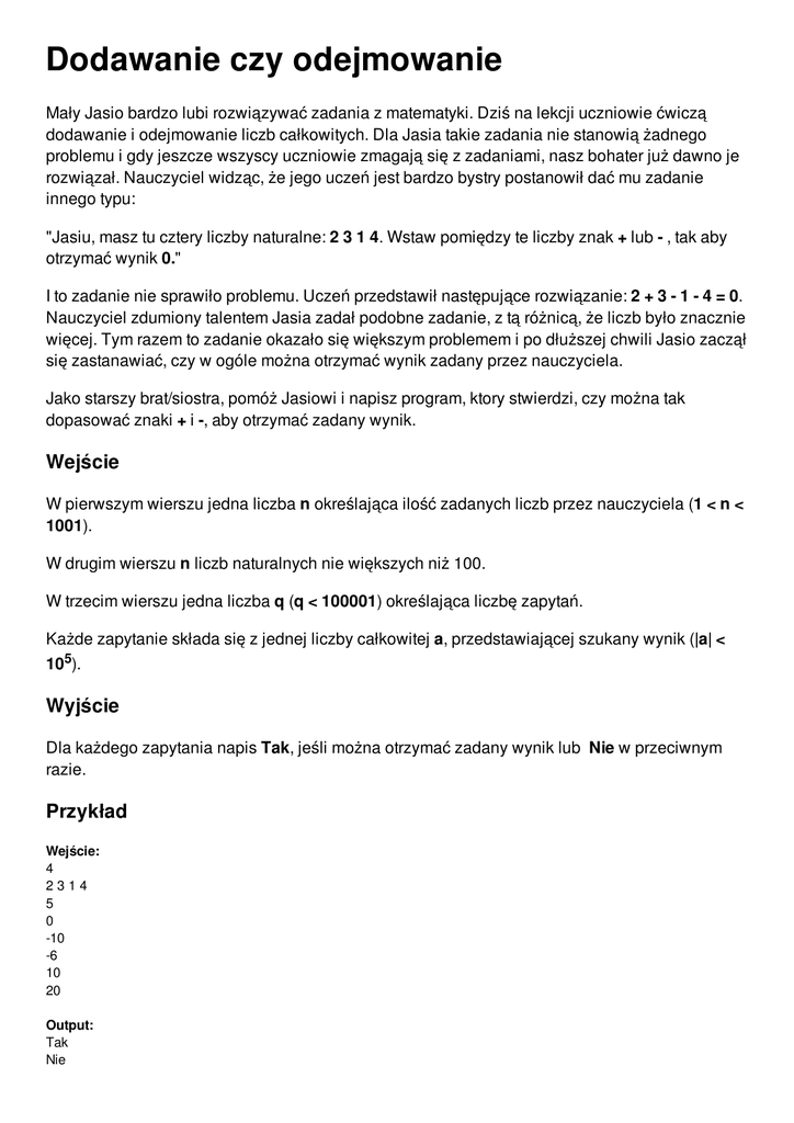 Dodawanie czy odejmowanie Mały Jasio bardzo lubi rozwiązywać zadania z matematyki. Dziś na lekcji uczniowie ćwiczą dodawanie i odejmowanie liczb całkowitych. Dla Jasia takie zadania nie stanowią żadnego problemu i gdy jeszcze wszyscy uczniowie zmagają się z zadaniami, nasz bohater już dawno je rozwiązał. Nauczyciel widząc, że jego uczeń jest bardzo bystry postanowił dać mu zadanie innego typu: "Jasiu, masz tu cztery liczby naturalne: 2 3 1 4. Wstaw pomiędzy te liczby znak + lub - , tak aby otrzymać wynik 0." I to zadanie nie sprawiło problemu. Uczeń przedstawił następujące rozwiązanie: 2 + 3 - 1 - 4 = 0. Nauczyciel zdumiony talentem Jasia zadał podobne zadanie, z tą różnicą, że liczb było znacznie więcej. Tym razem to zadanie okazało się większym problemem i po dłuższej chwili Jasio zaczął się zastanawiać, czy w ogóle można otrzymać wynik zadany przez nauczyciela. Jako starszy brat/siostra, pomóż Jasiowi i napisz program, ktory stwierdzi, czy można tak dopasować znaki + i -, aby otrzymać zadany wynik. Wejście W pierwszym wierszu jedna liczba n określająca ilość zadanych liczb przez nauczyciela (1 < n < 1001). W drugim wierszu n liczb naturalnych nie większych niż 100. W trzecim wierszu jedna liczba q (q < 100001) określająca liczbę zapytań. Każde zapytanie składa się z jednej liczby całkowitej a, przedstawiającej szukany wynik (|a| < 105). Wyjście Dla każdego zapytania napis Tak, jeśli można otrzymać zadany wynik lub Nie w przeciwnym razie. Przykład Wejście: 4 2314 5 0 -10 -6 10 20 Output: Tak Nie Tak Tak Nie