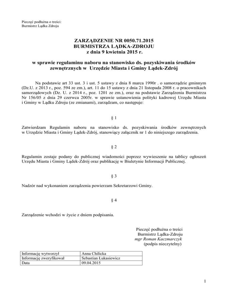 Pieczęć podłużna o treści: Burmistrz Lądka Zdroju ZARZĄDZENIE NR 0050.71.2015 BURMISTRZA LĄDKA-ZDROJU z dnia 9 kwietnia 2015 r. w sprawie regulaminu naboru na stanowisko ds. pozyskiwania środków zewnętrznych w Urzędzie Miasta i Gminy Lądek-Zdrój Na podstawie art 33 ust. 3 i ust. 5 ustawy z dnia 8 marca 1990r . o samorządzie gminnym (Dz.U. z 2013 r., poz. 594 ze zm.), art. 11 do 15 ustawy z dnia 21 listopada 2008 r. o pracownikach samorządowych (Dz. U. z 2014 r., poz. 1201 ze zm.), oraz na podstawie Zarządzenia Burmistrza Nr 156/05 z dnia 29 czerwca 2005r. w sprawie ustanowienia polityki kadrowej Urzędu Miasta i Gminy w Lądku Zdroju (ze zmianami), zarządzam, co następuje: §1 Zatwierdzam Regulamin naboru na stanowisko ds. pozyskiwania środków zewnętrznych w Urzędzie Miasta i Gminy Lądek-Zdrój, stanowiący załącznik nr 1 do niniejszego zarządzenia. §2 Regulamin zostaje podany do publicznej wiadomości poprzez wywieszenie na tablicy ogłoszeń Urzędu Miasta i Gminy Lądek-Zdrój oraz publikację w Biuletynie Informacji Publicznej. §3 Nadzór nad wykonaniem zarządzenia powierzam Sekretarzowi Gminy. §4 Zarządzenie wchodzi w życie z dniem podpisania. Pieczęć podłużna o treści Burmistrz Lądka-Zdroju mgr Roman Kaczmarczyk (podpis nieczytelny) Informację wytworzył Informację zweryfikował Data Anna Chilicka Sebastian Łukasiewicz 09.04.2015 1 Załącznik do Zarządzenia Nr 0050.71.2015 Burmistrza Lądka-Zdroju z dnia 9 kwietnia 2015 r. REGULAMIN NABORU NA STANOWISKO DS. POZYSKIWANIA ŚRODKÓW ZEWNĘTRZNYCH W URZĘDZIE MIASTA I GMINY LĄDEK-ZDRÓJ Postanowienia ogólne 1. Nabór odbywa się na podstawie ogłoszenia Burmistrza Lądka-Zdroju o naborze na stanowisko ds. pozyskiwania środków zewnętrznych w Urzędzie Miasta i Gminy LądekZdrój. Ogłoszenie o naborze podawane jest do publicznej wiadomości poprzez wywieszenie na tablicach ogłoszeń w Urzędzie oraz na stronie Biuletynu Informacji Publicznej. 2. Termin składania ofert, zgodnie z warunkami zawartymi w ogłoszeniu, upływa z dniem 21 kwietnia 2015 r. 3. Powołuje się Komisją Rekrutacyjną w składzie: 1) Przewodniczący Komisji – Anna Chilicka - Sekretarz Gminy; 2) Z-ca Przewodniczącego Komisji – Marta Pogorzelska – Zastępca Burmistrza; 3) Członek Komisji – Sebastian Łukasiewicz – Inspektor ds. obsługi prawnej; 4) Członek Komisji – Helena Kołodziej – Kierownik Wydziału Finansowo – Budżetowego, Główny Księgowy Urzędu; 5) Członek Komisji - Katarzyna Drozdowska – Inspektor ds. kadr, nadzoru BHP i administracji. 4. Komisyjne otwarcie ofert nastąpi w dniu 22 kwietnia 2015 r. Z otwarcia ofert sporządza się protokół. 5. Komisja obraduje w składzie minimum 3 członków, w tym Przewodniczącego lub Zastępcy Przewodniczącego Komisji 6. Oferty, które nie będą spełniały kryteriów formalnych zawartych w ogłoszeniu zostaną odrzucone. Nie dopuszcza się możliwości uzupełniania przez kandydatów złożonych dokumentów po otwarciu ofert. 7. Po otwarciu ofert Komisja wymieniona w ust. 3 ustala termin przeprowadzenia rozmowy kwalifikacyjnej. 8. Sekretarz Gminy niezwłocznie powiadamia na piśmie osoby nie spełniające kryteriów formalnych o odrzuceniu oferty z podaniem przyczyny i odesłaniem oryginałów dokumentów. Kopie dokumentów, list motywacyjny i CV nie podlegają zwrotowi i pozostają w dokumentacji przeprowadzonego naboru. 9. Sekretarz Gminy niezwłocznie powiadamia na piśmie lub telefonicznie kandydatów spełniających kryteria formalne, o terminie i miejscu przeprowadzenia rozmowy kwalifikacyjnej. Nie stawienie się przez kandydata na rozmowę kwalifikacyjną we wskazanym terminie, oznacza rezygnację z udziału w naborze. Nie będą wyznaczane dodatkowe terminy przeprowadzenia rekrutacji. Przebieg naboru 1. Nabór odbywa się w formie rozmowy kwalifikacyjnej. 2. Rozmowa kwalifikacyjna polegać będzie na udzieleniu przez kandydata odpowiedzi na pytania zadane przez poszczególnych członków komisji. Pytania z poszczególnych dziedzin są jednakowe dla wszystkich kandydatów. Poza tymi pytaniami każdy z członków komisji ma prawo zadać pytania uzupełniające. Rozmowy kwalifikacyjne odbywać się będą w kolejności alfabetycznej. 3. Z przebiegu naboru sporządza się protokół. W treści protokołu zawiera się: 2 skład Komisji rekrutacyjnej; określenie stanowiska, na które prowadzony jest nabór; liczbę kandydatów; imiona i nazwiska nie więcej niż pięciu kandydatów, którzy najlepiej spełniali wymogi naboru (w kolejności wg liczby uzyskanych punktów); - informację o zastosowanych metodach i technikach naboru; - uzasadnienie dokonanego wyboru. Załącznikami do protokołu są arkusze oceny kandydata i arkusze podsumowujące. Protokół i arkusze te są niejawne i nie podlegają publikacji. Protokół podlega zatwierdzeniu przez Burmistrza Lądka-Zdroju, który podejmuje ostateczną decyzję w sprawie zatrudnienia kandydata. Dokumentację wyłonionego w naborze kandydata przekazuje się Inspektorowi ds. kadr, nadzoru BHP i administracji. Po zatwierdzeniu protokołu Burmistrz nawiązuje stosunek pracy z wybranym kandydatem, bądź w przypadku nie wyłonienia żadnego kandydata, przystępuje się do ogłoszenia ponownego naboru. Niezwłocznie po zakończeniu postępowania naboru Sekretarz Gminy powiadamia na piśmie uczestników naboru o jego wyniku oraz odsyła oryginały dokumentów osobom, które nie zostały zakwalifikowane do zatrudnienia. - 4. 5. 6. 7. 8. 9. Zasady punktacji 1. Rozmowa kwalifikacyjna podlega odrębnej ocenie przez każdego z członków Komisji rekrutacyjnej. Oceny dokonuje się na Arkuszu Oceny Kandydata, którego wzór stanowi załącznik do niniejszego Regulaminu. Każdy z uczestników może przyznać maksymalnie 110 punktów poszczególnym kandydatom. 2. Na podstawie arkuszy oceny kandydata sporządza się arkusz podsumowujący, którego wzór stanowi załącznik do niniejszego regulaminu. 3. Pu