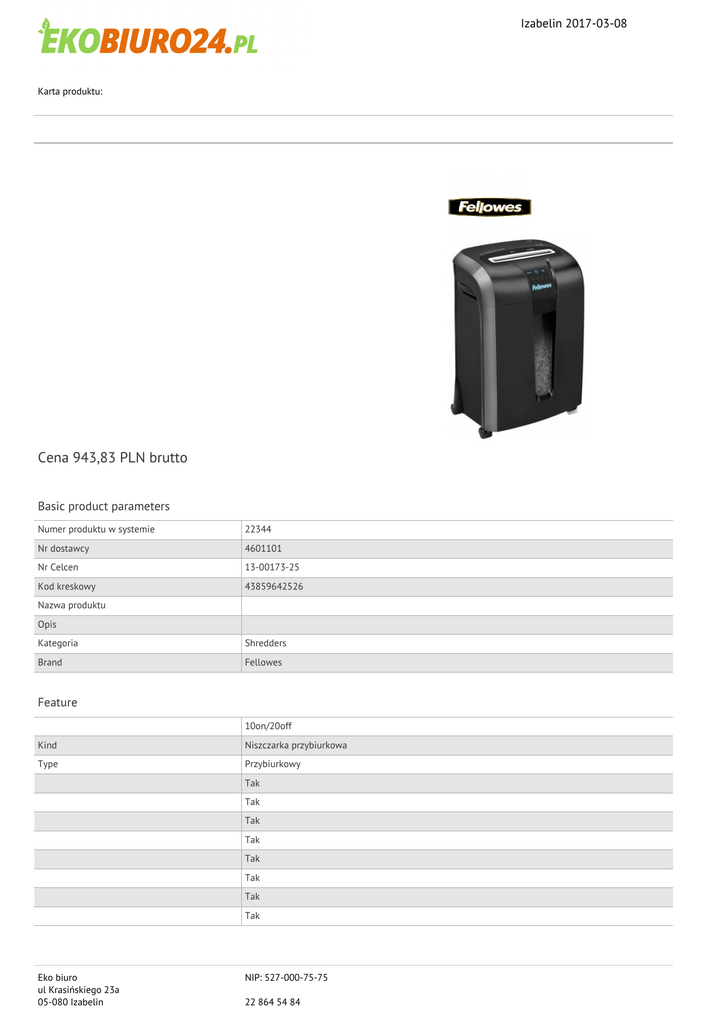 Izabelin 2017-03-08 Karta produktu: Cena 943,83 PLN brutto Basic product parameters Numer produktu w systemie 22344 Nr dostawcy 4601101 Nr Celcen 13-00173-25 Kod kreskowy 43859642526 Nazwa produktu Opis Kategoria Shredders Brand Fellowes Feature 10on/20off Kind Niszczarka przybiurkowa Type Przybiurkowy Tak Tak Tak Tak Tak Tak Tak Tak Eko biuro ul Krasińskiego 23a 05-080 Izabelin NIP: 527-000-75-75 22 864 54 84 Izabelin 2017-03-08 Karta katalogowa produktu cd. Nie 4x38 Ścinki Material Metal/tworzywo sztuczne Product Shredder Dimensions Dimensions (mm) 500x390x275 Procurement vocabulary CPV 30191400-8 Niszczarki Certifications Warranty 2 New product Standard Hit Standard Colour Colour N.a. Amount Number of sheets 12 Pozostałe zdjęcia produktu Serdecznie zapraszamy do współpracy Eko biuro zespół. Eko biuro ul Krasińskiego 23a 05-080 Izabelin NIP: 527-000-75-75 22 864 54 84