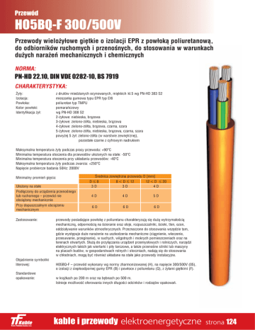 Przewód HO5BQ-F 300/500V Przewody wielożyłowe giętkie o izolacji EPR z powłoką poliuretanową, do odbiorników ruchomych i przenośnych, do stosowania w warunkach dużych narażeń mechanicznych i chemicznych NORMA: PN-HD 22.10, DIN VDE 0282-10, BS 7919 CHARAKTERYSTYKA: Żyły: Izolacja: Powłoka: Kolor powłoki: Identyfikacja żył: z drutów miedzianych ocynowanych, miękkich kl.5 wg PN-HD 383 S2 mieszanka gumowa typu EPR typ EI6 poliuretan typ TMPU pomarańczowy wg PN-HD 308 S2 2-żyłowe: niebieska, brązowa 3-żyłowe: zielono-żółta, niebieska, brązowa 4-żyłowe: zielono-żółta, brązowa, czarna, szara 5-żyłowe: zielono-żółta, niebieska, brązowa, czarna, szara powyżej 5 żył: zielono-żółta (w warstwie zewnętrznej), pozostałe czarne z cyfrowym nadrukiem Maksymalna temperatura żyły podczas pracy przewodu: +90°C Minimalna temperatura otoczenia dla przewodów ułożonych na stałe: -50°C Minimalna temperatura otoczenia przy układaniu przewodów: -40°C Maksymalna temperatura żyły podczas zwarcia: +250°C Napięcie probiercze badania 50Hz: 2000V Minimalny promieñ giêcia: Ułożony na stałe Podłączony do urządzenia przenośnego lub ruchomego – przewód nie obciążony mechanicznie Przy dopuszczalnym obciążeniu mechanicznym Zastosowanie: Objaśnienie symboliki literowej: Standardowe opakowanie: Œrednica zewnętrzna przewodu D [mm] D≤8 8 < D ≤ 12 12 < D ≤ 20 3D 3D 4D 4D 4D 5D 6D 6D 6D przewody posiadające powłokę z poliuretanu charakteryzują się dużą wytrzymałością mechaniczną, odpornością na ścieranie oraz oleje, rozpuszczalniki, ścieki, tlen, ozon, oddziaływanie warunków atmosferycznych. Przeznaczone do stosowania wszędzie tam, gdzie występuje duże narażenie na uszkodzenia mechaniczne (ciągnienie, wleczenie, przesuwanie, przeginanie), w suchych, wilgotnych i mokrych pomieszczeniach oraz na terenach otwartych. Służą do przyłączania urządzeń przemysłowych i rolniczych, narzędzi elektrycznych takich jak wiertarki i piły tarczowe, a także przenośne silniki lub maszyny na placach budów, w gospodarstwach rolnych i stoczniach, nadają się do stosowania w chłodniach, mogą być również układane na stałe jako przewody instalacyjne. H05BQ-F – przewód wykonany wg normy zharmonizowanej (H), na napięcie 300/500V (05), o izolacji z ciepłoodpornej gumy EPR (B) i powłoce z poliuretanu (Q), z żyłami giętkimi (F). w krążkach po 200 m oraz na bębnach po 500 m. Istnieje możliwość oferowania innych długości odcinków i rodzajów opakowań. kable i przewody elektroenergetyczne strona 124 HO5BQ-F 300/500V Liczba i przekrój znamionowy żył Maksymalna średnica pojedynczego drutu w żyle Znamionowa grubość izolacji Znamionowa grubość powłoki Przybliżony wymiar zewnętrzny przewodu Przybliżona waga przewodu Maksymalna rezystancja żyły w temp. 20°C n x mm2 mm mm mm mm kg/km /km 2 x 0,75 0,21 0,6 0,8 6,5 51 26,7 2x1 0,21 0,6 0,9 7,0 61 3 x 0,75 0,21 0,6 0,9 7,1 64 20,0 26,7 3x1 4 x 0,75 0,21 0,21 0,6 0,6 0,9 0,9 7,4 7,7 74 77 20,0 4x1 5 x 0,75 0,21 0,21 0,6 0,6 0,9 1,0 8,0 8,6 90 20,0 98 26,7 5x1 0,21 0,6 1,0 8,9 114 20,0 Liczba i przekrój znamionowy żył Maksymalna średnica pojedynczego drutu w żyle Znamionowa grubość izolacji Znamionowa grubość powłoki Przybliżony wymiar zewnętrzny przewodu Przybliżona waga przewodu Maksymalna rezystancja żyły w temp. 20°C n x mm2 mm mm mm mm kg/km /km 6 x 0,75 0,21 0,6 1,0 9,3 116 26,7 6x1 7 x 0,75 0,21 0,21 0,6 0,6 1,0 1,0 9,7 10,0 135 135 20,0 26,7 7x1 12 x 0,75 0,21 0,6 1,1 0,21 0,6 1,2 10,7 12,5 163 203 20,0 26,7 12 x 1 0,21 0,6 1,3 13,2 243 20,0 299 26,7 26,7 05BQ-F 300/500V* 18 x 0,75 0,21 0,6 1,4 14,8 18 x 1 0,21 0,6 1,5 15,7 358 24 x 0,75 0,21 0,6 1,6 17,6 392 20,0 26,7 24 x 1 0,21 0,6 1,8 18,8 475 20,0 *Przewody poza zakresem normy. Obciążalność prądowa wg PN-HD 516 S2 Przekrój żyły mm2 Obciążalność prądowa A Jednofazowe Trzyfazowe 0,75 6 6 1 10 10 Temperatura otoczenia: 30°C, maksymalna temperatura żyły: 90°C kable i przewody elektroenergetyczne strona 125