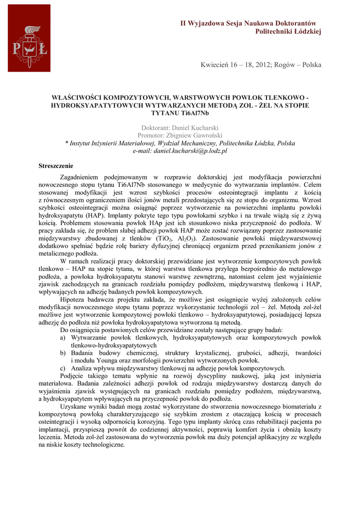 II Wyjazdowa Sesja Naukowa Doktorantów Politechniki Łódzkiej Kwiecień 16 – 18, 2012; Rogów – Polska WŁAŚCIWOŚCI KOMPOZYTOWYCH, WARSTWOWYCH POWŁOK TLENKOWO HYDROKSYAPATYTOWYCH WYTWARZANYCH METODĄ ZOL - ŻEL NA STOPIE TYTANU Ti6Al7Nb Doktorant: Daniel Kucharski Promotor: Zbigniew Gawroński * Instytut Inżynierii Materiałowej, Wydział Mechaniczny, Politechnika Łódzka, Polska e-mail: [email protected] Streszczenie Zagadnieniem podejmowanym w rozprawie doktorskiej jest modyfikacja powierzchni nowoczesnego stopu tytanu Ti6Al7Nb stosowanego w medycynie do wytwarzania implantów. Celem stosowanej modyfikacji jest wzrost szybkości procesów osteointegracji implantu z kością z równoczesnym ograniczeniem ilości jonów metali przedostających się ze stopu do organizmu. Wzrost szybkości osteointegracji można osiągnąć poprzez wytworzenie na powierzchni implantu powłoki hydroksyapatytu (HAP). Implanty pokryte tego typu powłokami szybko i na trwałe wiążą się z żywą kością. Problemem stosowania powłok HAp jest ich stosunkowo niska przyczepność do podłoża. W pracy zakłada się, że problem słabej adhezji powłok HAP może zostać rozwiązany poprzez zastosowanie międzywarstwy zbudowanej z tlenków (TiO2, Al2O3). Zastosowanie powłoki międzywarstwowej dodatkowo spełniać będzie rolę bariery dyfuzyjnej chroniącej organizm przed przenikaniem jonów z metalicznego podłoża. W ramach realizacji pracy doktorskiej przewidziane jest wytworzenie kompozytowych powłok tlenkowo – HAP na stopie tytanu, w której warstwa tlenkowa przylega bezpośrednio do metalowego podłoża, a powłoka hydroksyapatytu stanowi warstwę zewnętrzną, natomiast celem jest wyjaśnienie zjawisk zachodzących na granicach rozdziału pomiędzy podłożem, międzywarstwą tlenkową i HAP, wpływających na adhezję badanych powłok kompozytowych. Hipoteza badawcza projektu zakłada, że możliwe jest osiągnięcie wyżej założonych celów modyfikacji nowoczesnego stopu tytanu poprzez wykorzystanie technologii zol – żel. Metodą zol-żel możliwe jest wytworzenie kompozytowej powłoki tlenkowo – hydroksyapatytowej, posiadającej lepsza adhezję do podłoża niż powłoka hydroksyapatytowa wytworzona tą metodą. Do osiągnięcia postawionych celów przewidziane zostały następujące grupy badań: a) Wytwarzanie powłok tlenkowych, hydroksyapatytowych oraz kompozytowych powłok tlenkowo-hydroksyapatytowych b) Badania budowy chemicznej, struktury krystalicznej, grubości, adhezji, twardości i modułu Younga oraz morfologii powierzchni wytworzonych powłok. c) Analiza wpływu międzywarstwy tlenkowej na adhezję powłok kompozytowych. Podjęcie takiego tematu wpłynie na rozwój dyscypliny naukowej, jaką jest inżynieria materiałowa. Badania zależności adhezji powłok od rodzaju międzywarstwy dostarczą danych do wyjaśnienia zjawisk występujących na granicach rozdziału pomiędzy podłożem, międzywarstwą, a hydroksyapatytem wpływających na przyczepność powłok do podłoża. Uzyskane wyniki badań mogą zostać wykorzystane do stworzenia nowoczesnego biomateriału z kompozytową powłoką charakteryzującego się szybkim zrostem z otaczającą kością w procesach osteintegracji i wysoką odpornością korozyjną. Tego typu implanty skrócą czas rehabilitacji pacjenta po implantacji, przyspieszą powrót do codziennej aktywności, poprawią komfort życia i obniżą koszty leczenia. Metoda zol-żel zastosowana do wytworzenia powłok ma duży potencjał aplikacyjny ze względu na niskie koszty technologiczne. II Wyjazdowa Sesja Naukowa Doktorantów Politechniki Łódzkiej Kwiecień 16 – 18, 2012; Rogów – Polska PROPERTIES OF COMPOSITE MULTILAYER OXIDE - HYDROXYAPATITE COATINGS PRODUCED BY SOL -GEL METHOD ON THE TITANIUM ALLOY Ti6Al7Nb PhD Student: Daniel Kucharski Supervisor: Zbigniew Gawroński *Institute of Materials Science and Engineering, Faculty of Mechanical Engineering, Technical University of Lodz, Poland e-mail address: [email protected] Abstract: Problem in a PhD thesis undertaken to modify the surface of modern titanium alloy Ti6Al7Nb used in medicine for the manufacture of implants. The purpose of the modification is to increase rate osteointegration process of implant with bone and with simultaneous minimization of metal ions entering with alloy into the body. Growth rate of osteointegration can be achieved by creating on the surface implant a coating consist of hydroxyapatite (HAP). Implants coated with these coatings quickly and permanently associated with living bone. The problem of HAP coatings is their relatively low adhesion to the substrate. PhD thesis assumes that the problem of poor adhesion of HAP coatings can be solved by applying the interlayer built of titania and almunia. Application of the interlayer coating will also perform as diffusion barrier to protect of the organism against penetration of ions from the metal substrate. The aim of this thesis is to produce a composite coatings oxide - HAP on titanium alloy, in which the oxide layer directly adjacent to the metal substrate and the coating of hydroxyapatite is the outer layer, and an explanation of the phenomena occurring at interphase boundary, between the substrate, an interlayer oxide and HAP, influencing on the adhesion strength of composite coatings. The hypothesis of the research assumes that it is possible to achieve above goals of modification a modern titanium alloy use by technology of sol - gel. Sol-gel method is possible to produce multilayer coatings of oxide - hydroxyapatite, having better adhesion to the substrate than single coating of hydroxyapatite produced by this method. To achieve the objectives provided the following research groups: a) Preparation of oxide and HAP single coatings and composite coatings consist of oxide layer and hydroxyapatite layer. b) Research of the chemical structure, crystalline structure, thickness, adhesion, hardness and Young's mod