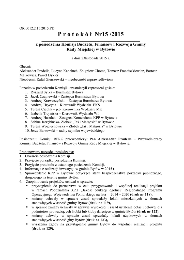 OR.0012.2.15.2015.PD P r o t o k ó ł Nr15 /2015 _____________________________________________________ z posiedzenia Komisji Budżetu, Finansów i Rozwoju Gminy Rady Miejskiej w Bytowie z dnia 23listopada 2015 r. Obecni: Aleksander Pradella, Lucyna Kapeluch, Zbigniew Choma, Tomasz Franciszkiewicz, Bartosz Majkowicz, Paweł Dykier Nieobecni: Rafał Gierszewski – nieobecność usprawiedliwiona Ponadto w posiedzeniu Komisji uczestniczyli zaproszeni goście: 1. Ryszard Sylka – Burmistrz Bytowa 2. Jacek Czapiewski – Zastępca Burmistrza Bytowa 3. Andrzej Kraweczyński - Zastępca Burmistrza Bytowa 4. Andrzej Hrycyna – Kierownik Wydziału EKS 5. Teresa Cieplik – p.o. Kierownika Wydziału MK 6. Izabella Trojańska – Kierownik Wydziału WI 7. Andrzej Hasulak – Zastępca Komendanta KPP w Bytowie 8. Sabina Jarzębińska- Żłobek „Jaś i Małgosia” w Bytowie 9. Teresa Wojciechowska – Żłobek „Jaś i Małgosia” w Bytowie 10. Jerzy Barzowski – radny sejmiku wojewódzkiego Posiedzeniu Komisji BFRG przewodniczył Pan Aleksander Pradella – Przewodniczący Komisji Budżetu, Finansów i Rozwoju Gminy Rady Miejskiej w Bytowie. Proponowany porządek posiedzenia: 1. Otwarcie posiedzenia Komisji. 2. Przyjęcie porządku posiedzenia Komisji. 3. Przyjęcie protokołu z ostatniego posiedzenia Komisji. 4. Informacja z realizacji inwestycji w gminie Bytów w 2015 r. 5. Sprawozdanie KPP w Bytowie dotyczące stanu bezpieczeństwa porządku publicznego, drogowego na terenie gminy Bytów. 6. Zaopiniowanie projektów uchwał w sprawie: przystąpienia do partnerstwa w celu przygotowania i wspólnej realizacji projektu w ramach Poddziałania 3.2.1 „Jakość edukacji ogólnej” Regionalnego Programu Operacyjnego Województwa Pomorskiego na lata 2014 – 2020 (druk nr 118), zmiany uchwały w sprawie zasad sprzedaży lokali mieszkalnych w domach stanowiących własność gminy Bytów (druk nr 119), w sprawie zmiany uchwały w sprawie wysokości i zasad ustalenia dotacji celowej dla podmiotów prowadzących żłobki lub kluby dziecięce w gminie Bytów (druk nr 122), zmiany uchwały w sprawie zasad sprzedaży lokali użytkowych w domach stanowiących własność giny Bytów (druk nr 123), wyrażenia zgody na przystąpienie gminy Bytów do wspólnej realizacji projektu (druk nr 129), wyrażenia zgody na odstąpienie od obowiązku przetargowego trybu zawarcia umowy dzierżawy (druk nr 130), zmiany uchwały w sprawie trybu udzielania i rozliczania dotacji dla niepublicznych przedszkoli i innych form wychowania przedszkolnego prowadzonych na terenie gminy Bytów oraz trybu i zakresu kontroli prawidłowości ich wykorzystywania (druk nr 131). 7. Zapoznanie się z pozostałymi projektami uchwał w sprawie: rozpatrzenia skargi na działalność burmistrza Bytowa (druk nr 124), rozpatrzenia skargi na działalność burmistrza Bytowa (druk nr 125), rozpatrzenia skargi na działalność burmistrza Bytowa (druk nr 126). 8. Sprawy bieżące: rozpatrzenie wniosku Szkoły Podstawowej w Niezabyszewie z dnia 18.09.2015 r. w sprawie dokończenia rozbudowy szkoły w Niezabyszewie – zagospodarowanie terenu: m.in. budowa ogrodzenia, boiska i urządzeń sportowych, rozpatrzenie wniosku Rady Rodziców SP nr 1 w Bytowie w sprawie budowy boiska wielofunkcyjnego i placu zabaw dla dzieci. 9. Zamknięcie posiedzenia Komisji. Ad. 1 Posiedzenie Komisji BFRG Rady Miejskiej w Bytowie otworzył Pan Aleksander Pradella Przewodniczący Komisji. Ad. 2 Przyjęcie porządku posiedzenia Komisji. Głosowanie: (6-za, 0-p, 0-w). Ad. 3 Przyjęcie protokołu z ostatniego posiedzenia Komisji. Komisja skierowała protokół nr 13/2015 z 26.10.2015 r . do uzupełnienia Ad. 4 Informacja z realizacji inwestycji w gminie Bytów w 2015 r. Informacji udzieliła pani Izabella Trojańska – Kierownik Wydziału WI – Szczegóły znajdują się w załączniku nr 2. Radny Bartosz Majkowicz zapytał, czy wszystkie zakończone inwestycje zostały oddane w terminie. Pani Izabella Trojańska odpowiedziała, że wszystkie z inwestycji zakończyły się zgodnie z planowanym terminem. Radny Tomasz Franciszkiewicz zapytał, czy przy przebudowie ul. Kościuszki ujęto też posesję przy ul. Kościuszki 42 oraz jakie inwestycje zostaną przeniesione na przyszły rok. 2 Pani I. Trojańska, potwierdziła, iż dojazd do posesji przy ul. Kościuszki 42 objęty jest planem przebudowy, ale w granicach gruntów gminnych. A inwestycje, które przejdą na przyszły rok, to projekt remizy w Niezabyszewie oraz prawdopodobnie projekt kanalizacji przy ul. Zakładowej. Ad. 5 Sprawozdanie KPP w Bytowie dotyczące stanu bezpieczeństwa porządku publicznego, drogowego na terenie gminy Bytów. Sprawozdanie przedstawił Pan Andrzej Hasulak, zastępca komendanta KPP w Bytowie . Treść sprawozdania w załączniku do protokołu. Radny Tomasz Franciszkiewicz zapytał, co oznacza sformułowanie zawarte z przedstawianej nam analizie: „Pojazdy firm ochrony i karetki pogotowia – 8 „ Pan Andrzej Hasulak, odpowiedział, że 8, to liczba dni poświęcona w przedstawianym okresie na przeprowadzenie kontroli, sprawdzania stanu technicznego pojazdów wymienionych w danym punkcie. Radny Tomasz Franciszkiewicz poprosił pana Andrzeja Hasulak o komentarz, co sądzi na temat monitoringu na terenie miasta oraz wyrażenia zdania, jakie ma na temat bezdomnych śpiących na ławkach w centrum miasta. Pan Andrzej Hasulak, stwierdził, że monitoring jest bardzo potrzebny, gdyż poprawia bezpieczeństwo nie tylko na rynku ale także w okolicach zamku, szczególnie w weekendy, gdy w klubie na terenie zamku odbywają się dyskoteki. W sprawie bezdomnych p. Hasulak przytoczył Art. 58 kodeksu wykroczeń. Powiedział, że policjanci mogą karać za spanie na ławce, spożywanie alkoholu, ale nie mogą karać za brak schludności ubioru. Ludzie przesiadujący na ławkach w centrum miasta, to są ludzie chorzy, alkoholicy i należy skupić się na ich leczeniu, a nie karaniu, gdyż są to cz