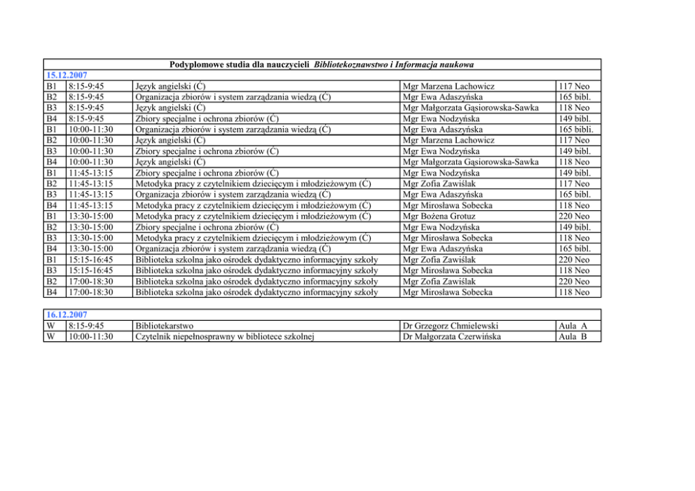 Podyplomowe studia dla nauczycieli Bibliotekoznawstwo i Informacja naukowa 15.12.2007 B1 8:15-9:45 B2 8:15-9:45 B3 8:15-9:45 B4 8:15-9:45 B1 10:00-11:30 B2 10:00-11:30 B3 10:00-11:30 B4 10:00-11:30 B1 11:45-13:15 B2 11:45-13:15 B3 11:45-13:15 B4 11:45-13:15 B1 13:30-15:00 B2 13:30-15:00 B3 13:30-15:00 B4 13:30-15:00 B1 15:15-16:45 B3 15:15-16:45 B2 17:00-18:30 B4 17:00-18:30 Język angielski (Ć) Organizacja zbiorów i system zarządzania wiedzą (Ć) Język angielski (Ć) Zbiory specjalne i ochrona zbiorów (Ć) Organizacja zbiorów i system zarządzania wiedzą (Ć) Język angielski (Ć) Zbiory specjalne i ochrona zbiorów (Ć) Język angielski (Ć) Zbiory specjalne i ochrona zbiorów (Ć) Metodyka pracy z czytelnikiem dziecięcym i młodzieżowym (Ć) Organizacja zbiorów i system zarządzania wiedzą (Ć) Metodyka pracy z czytelnikiem dziecięcym i młodzieżowym (Ć) Metodyka pracy z czytelnikiem dziecięcym i młodzieżowym (Ć) Zbiory specjalne i ochrona zbiorów (Ć) Metodyka pracy z czytelnikiem dziecięcym i młodzieżowym (Ć) Organizacja zbiorów i system zarządzania wiedzą (Ć) Biblioteka szkolna jako ośrodek dydaktyczno informacyjny szkoły Biblioteka szkolna jako ośrodek dydaktyczno informacyjny szkoły Biblioteka szkolna jako ośrodek dydaktyczno informacyjny szkoły Biblioteka szkolna jako ośrodek dydaktyczno informacyjny szkoły Mgr Marzena Lachowicz Mgr Ewa Adaszyńska Mgr Małgorzata Gąsiorowska-Sawka Mgr Ewa Nodzyńska Mgr Ewa Adaszyńska Mgr Marzena Lachowicz Mgr Ewa Nodzyńska Mgr Małgorzata Gąsiorowska-Sawka Mgr Ewa Nodzyńska Mgr Zofia Zawiślak Mgr Ewa Adaszyńska Mgr Mirosława Sobecka Mgr Bożena Grotuz Mgr Ewa Nodzyńska Mgr Mirosława Sobecka Mgr Ewa Adaszyńska Mgr Zofia Zawiślak Mgr Mirosława Sobecka Mgr Zofia Zawiślak Mgr Mirosława Sobecka 117 Neo 165 bibl. 118 Neo 149 bibl. 165 bibli. 117 Neo 149 bibl. 118 Neo 149 bibl. 117 Neo 165 bibl. 118 Neo 220 Neo 149 bibl. 118 Neo 165 bibl. 220 Neo 118 Neo 220 Neo 118 Neo 16.12.2007 W 8:15-9:45 W 10:00-11:30 Bibliotekarstwo Czytelnik niepełnosprawny w bibliotece szkolnej Dr Grzegorz Chmielewski Dr Małgorzata Czerwińska Aula A Aula B