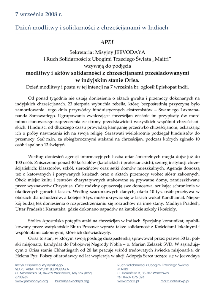 7 września 2008 r. Dzień modlitwy i solidarności z chrześcijanami w Indiach APEL Sekretariat Misyjny JEEVODAYA i Ruch Solidarności z Ubogimi Trzeciego Świata „Maitri” wzywają do podjęcia modlitwy i aktów solidarności z chrześcijanami prześladowanymi w indyjskim stanie Orisa. Dzień modlitwy i postu w tej intencji na 7 września br. ogłosił Episkopat Indii. Od ponad tygodnia nie ustają doniesienia o aktach gwałtu i przemocy dokonanych na indyjskich chrześcijanach. 23 sierpnia wybuchła rebelia, której bezpośrednią przyczyną było zamordowanie tego dnia przywódcy hinduistycznych ekstremistów – Swamiego Laxmanananda Saraswatiego. Ugrupowania zwalczające chrześcijan właśnie im przypisały ów mord mimo stanowczego zaprzeczenia ze strony przedstawicieli wszystkich wspólnot chrześcijańskich. Hinduiści od dłuższego czasu prowadzą kampanię przeciwko chrześcijanom, oskarżając ich o próby nawracania ich na swoja religię. Saraswati wielokrotnie podżegał hinduistów do przemocy. Stał m.in. za ubiegłorocznymi atakami na chrześcijan, podczas których zginęło 10 osób i spalono 13 świątyń. Według doniesień agencji informacyjnych liczba ofiar śmiertelnych mogła dojść już do 100 osób. Zniszczono ponad 40 kościołów (katolickich i protestanckich), szereg instytucji chrześcijańskich: klasztorów, szkół, sierocińców oraz setki domów mieszkalnych. Agencje donoszą też o katowanych i porywanych księżach oraz o aktach przemocy wobec sióstr zakonnych. Obok miejsc kultu i centrów charytatywnych atakowane są prywatne domy, zamieszkiwane przez wyznawców Chrystusa. Całe rodziny opuszczają swe domostwa, szukając schronienia w okolicznych górach i lasach. Według szacunkowych danych, około 10 tys. osób przebywa w obozach dla uchodźców, a kolejne 5 tys. może ukrywać się w lasach wokół Kandhamal. Niepokój budzą też doniesienia o rozprzestrzenianiu się rozruchów na inne stany: Madhya Pradesh, Uttar Pradesh i Karnataka, gdzie dokonano napadów na katolickie szkoły i kościoły. Stolica Apostolska potępiła ataki na chrześcijan w Indiach. Specjalny komunikat, opublikowany przez watykańskie Biuro Prasowe wyraża także solidarność z Kościołami lokalnymi i wspólnotami zakonnymi, które ich doświadczyły. Orisa to stan, w którym swoją posługę duszpasterską sprawował przez prawie 50 lat polski misjonarz, kandydat do Pokojowej Nagrody Nobla – o. Marian Żelazek SVD. W sąsiadującym z Orisą stanie Chhattisgarh od 20 lat pracuje wśród trędowatych świecka misjonarka, dr Helena Pyz. Polscy ofiarodawcy od lat wspierają w akcji Adopcja Serca uczące się w Jeevodaya Instytut Prymasa Wyszyńskiego SEKRETARIAT MISYJNY JEEVODAYA ul. Młodnicka 34, 04-239 Warszawa, Tel/ fax (022) 6730265 www.jeevodaya.org [email protected] Ruch Solidarności z Ubogimi Trzeciego Świata MAITRI ul. Floriańska 3, 03-707 Warszawa tel. 0-607 075 323 www.maitri.pl [email protected] dzieci z rodzin dotkniętych trądem, niezależnie od ich wyznania. Są wśród nich przede wszystkim hinduiści, a pracownikami Ośrodka są głównie katolicy – Indusi z różnych stanów, także z Orisy. Wielu Polaków wspiera też szkołę i kolonię dla trędowatych, nad którymi sprawował opiekę o. Marian Żelazek w Puri. Jak zapewnia o. Kurian – jego następca, zamieszki dotąd ominęły to miasto. Na południu Indii w stanie Karnataka pracują wśród niewidomych polskie siostry Franciszkanki Służebnice Krzyża. W ich zgromadzeniu wiele nowicjuszek i postulantek pochodzi właśnie z Orisy. Siostry lękają się o swoich najbliższych, z których wielu musiało się schronić w lasach. Włączając w naszych modlitwach męczeństwo współczesnych chrześcijan w Mękę Chrystusa, zjednoczmy się razem na wspólnej modlitwie. W Warszawie będzie sprawowana w tej intencji Eucharystia w Katedrze Diecezji Warszawsko – Praskiej p.w. św. Floriana 6 września o godz. 18.00 Mszy św. będzie przewodniczył Jego Ekscelencja Abp Henryk Hoser. Po nabożeństwie spotkanie w sali katedralnej. Za Sekretariat Misyjny Jeevodaya Za Warszawsko-Praską Wspólnotę MAITRI Anna Sułkowska Wojciech Góral Ofiary na rzecz poszkodowanych chrześcijan i ich rodzin można składać na konto: Instytut Prymasa Wyszyńskiego Sekretariat Misyjny Jeevodaya PKOBP nr 16 1020 1097 0000 7102 0004 8736 z dopiskiem: ORISA. ____________________________________________________________________________________________ _______________________ Instytut Prymasa Wyszyńskiego SEKRETARIAT MISYJNY JEEVODAYA ul. Młodnicka 34, 04-239 Warszawa, Tel/ fax (022) 6730265 www.jeevodaya.org [email protected] Ruch Solidarności z Ubogimi Trzeciego Świata MAITRI ul. Floriańska 3, 03-707 Warszawa tel. 0-607 075 323 www.maitri.pl [email protected]