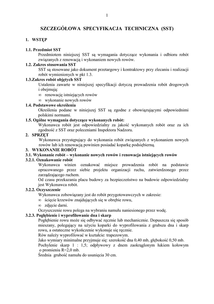 1 SZCZEGÓŁOWA SPECYFIKACJA TECHNICZNA (SST) 1. WSTĘP 1.1. Przedmiot SST Przedmiotem niniejszej SST są wymagania dotyczące wykonania i odbioru robót związanych z renowacją i wykonaniem nowych rowów. 1.2. Zakres stosowania SST SST są stosowane jako dokument przetargowy i kontraktowy przy zlecaniu i realizacji robót wymienionych w pkt 1.3. 1.3.Zakres robót objętych SST Ustalenia zawarte w niniejszej specyfikacji dotyczą prowadzenia robót drogowych i obejmują: • renowację istniejących rowów • wykonanie nowych rowów 1.4. Podstawowe określenia Określenia podane w niniejszej SST są zgodne z obowiązującymi odpowiednimi polskimi normami. 1.5. Ogólne wymagania dotyczące wykonanych robót: Wykonawca robót jest odpowiedzialny za jakość wykonanych robót oraz za ich zgodność z SST oraz poleceniami Inspektora Nadzoru. 2. SPRZĘT Wykonawca przystępujący do wykonania robót związanych z wykonaniem nowych rowów lub ich renowacją powinien posiadać koparkę podsiębierną. 3. WYKONANIE ROBÓT 3.1. Wykonanie robót – wykonanie nowych rowów i renowacja istniejących rowów 3.2.1. Oznakowanie robót Wykonawca winien oznakować miejsce prowadzenia robót na podstawie opracowanego przez siebie projektu organizacji ruchu, zatwierdzonego przez zarządzającego ruchem. Od czasu przekazania placu budowy za bezpieczeństwo na budowie odpowiedzialny jest Wykonawca robót. 3.2.2. Oczyszczenie Wykonawca zobowiązany jest do robót przygotowawczych w zakresie: • ścięcie krzewów znajdujących się w obrębie rowu, • zdjęcie darni. Oczyszczenie rowu polega na wybraniu namułu naniesionego przez wodę. 3.2.3. Pogłębienie i wyprofilowanie dna i skarp Pogłębienie rowu moŜe się odbywać ręcznie lub mechanicznie. Dopuszcza się sposób mieszany, polegający na uŜyciu koparki do wyprofilowania z grubsza dna i skarp rowu, a ostateczne wykończenie wykonuje się ręcznie. Rów naleŜy wyprofilować w kształcie: trapezowym. Jako wymiary minimalne przyjmuje się: szerokość dna 0,40 mb, głębokość 0,50 mb. Pochylenie skarp 1 : 1,5; odpływowy z dnem zaokrąglonym łukiem kołowym o promieniu R=2,0 mb. Średnia grubość namułu do usunięcia 30 cm. 2 3.2.4. Spadki podłuŜne rowów Najmniejszy dopuszczalny spadek podłuŜny rowu wynosi 0,2 %, w wyjątkowych przypadkach dopuszcza się na odcinkach o długości nie przekraczającej 200 mb spadek mniejszy, nie mniejszy jednak niŜ 0,1 %. 3.2.5. Odwiezienie urobku i rozplantowanie Namuł i nadmiar gruntu naleŜy wywieźć poza obręb drogi, tak aby nie mógł się ponownie przedostać do oczyszczonego i naprawionego rowu. Plantowanie powinno się odbywać równocześnie z przewoŜeniem mas ziemi. Masy ziemi naleŜy wyrównać i rozgarniać bezpośrednio po ich wyładowaniu na miejscu przez siebie wybranym i uzgodnionym z właścicielem terenu 4. KONTROLA JAKOŚCI Przy odbiorze sprawdza się: A) pochylenie podłuŜne rowu Dopuszczalne odchyłki -+ 0,5 % z tym, Ŝe woda nie powinna stać w rowie. B) szerokość i głębokość rowu naleŜy sprawdzić jeden raz na kaŜdy hektometr – dopuszczalne odchyłki -+ 5 cm C) powierzchnię skarp naleŜy sprawdzić co najmniej raz na kaŜdy hektometr. Prześwit pomiędzy skarpą a szablonem nie powinien przekroczyć 3 cm. 5. OBMIAR ROBÓT Jednostką obmiarową jest metr (mb) rowu przy renowacji rowów oraz metr sześcienny (m3) przy wykonaniu nowych rowów – na podstawie pomiarów w terenie. 6. ODBIÓR ROBÓT Odbioru robót związanych z wykonaniem nowych rowów i renowacji istniejących rowów dokonuje Inspektor Nadzoru, po zgłoszeniu robót przez Wykonawcę. Odbiór robót będzie przeprowadzony w czasie umoŜliwiającym wykonanie ewentualnych poprawek bez hamowania postępu robót. Roboty poprawkowe Wykonawca wykona na własny koszt w terminie ustalonym przez Inspektora Nadzoru. 7. PODSTAWY PRAWNE I WARUNKI TECHNICZNE WYKONANIA ROBÓT ZWIĄZANYCH Z: 7.1. – renowacją rowów a) PN-68/B-06050 Roboty ziemne budowlane. Wymagania w zakresie wykonania i badania przy odbiorze b) BN-72/8932-01 Budowle drogowe i kolejowe. Roboty ziemne. c) BN-67/8936-01 Odprowadzenie wód opadowych z drogi. Warunki techniczne wykonania i odbioru