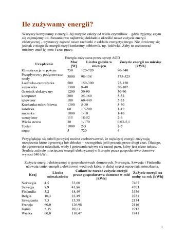 Ile zużywamy energii? Wszyscy korzystamy z energii. Jej zużycie zależy od wielu czynników – gdzie żyjemy, czym się zajmujemy itd. Stosunkowo najłatwiej dokładnie określić nasze zużycie energii elektrycznej - wystarczy zajrzeć nasze rachunki z zakładu energetycznego. Nie dowiemy się jednak z niego ile energii zużył konkretny odbiornik, np. lodówka. Żeby to oszacować musimy znać jej moc i czas pracy. Urządzenie Klimatyzacja w pokoju Przepływowy podgrzewacz wody Lodówko-zamrażarka zmywarka Grzejnik elektryczny komputer telewizor Kuchenka mikrofalowa żarówka suszarka wentylator Wieża stereo Toster zegar Energia zużywana przez sprzęt AGD Moc Liczba godzin w Zużycie energii na miesiąc [W] miesiącu [kWh] 750 120-720 90-540 3800 98-138 375-525 500 1300 1200 200 180 1300 60 1000 115 30 1000 5 150-300 8-40 30-90 25-160 60-440 5-30 17-200 1-10 18-52 1-170 2-5 720 75-150 20-102 30-90 5-32 5-35 5-30 1-12 1-10 2-6 0,03-5,1 2-5 4 Przyglądając się tabeli powyżej można zaobserwować, że najwięcej energii zużywają urządzenia które ogrzewają lub chłodzą – szczególnie jeśli pracują przez długi czas. Dlatego, do ogrzewania mieszkań, wody i gotowania używa się raczej gazu, który jest nieco tańszy. Średnie zużycie miesięczne energii elektrycznej w Europie przez gospodarstwo domowe wynosi 340 kWh. Zużycie energii elektrycznej w gospodarstwach domowych. Norwegia, Szwecja i Finlandia używają taniej energii z elektrowni wodnych którą w dużej części ogrzewają mieszkania. Całkowite roczne zużycie energii Liczba Zużycie energii na Kraj przez gospodarstwa domowe w mld mieszkańców osobę na rok [kWh] [kWh] Norwegia 4,5 33,60 7467 Szwecja 8,9 41,86 4703 Finlandia 5,2 18,49 3556 Belgia 10,3 23,49 2281 Szwajcaria 7,3 15,58 2134 Francja 60,0 126,98 2116 Dania 5,35 10,23 1912 Wielka 60,0 110,47 1841 1 Brytania Irlandia Luksemburg Austria Niemcy Czechy Holandia Bułgaria Grecja Słowenia Hiszpania Słowacja Włochy Węgry Portugalia Polska Rumunia 3,85 0,44 8,15 83,0 10,2 16,0 7,7 10,6 2,0 40,0 5,4 57,5 10,0 10,1 38,7 22,4 6,51 0,70 12,91 131,28 14,07 21,40 10,12 13,49 2,38 45,47 5,70 60,70 9,88 9,53 20,81 7,88 1691 1591 1584 1582 1379 1338 1314 1273 1190 1137 1056 1056 988 944 538 352 Powyższe zestawienia dotyczą tylko energii elektrycznej, która jest produktem wytworzonym w elektrowniach. Aby te elektrownie mogły działać potrzebują paliwa: gazu, ropy, węgla, uranu, wiatru słońca – nośników tzw. energii pierwotnej. W przypadku elektrowni, zużywających paliwa kopalne (zdecydowana większość) nośniki energii pierwotnej są spalane aby wytworzyć parę (przemiana energii chemiczne w cieplną) napędzającą turbinę (przemiana energii cieplnej w mechaniczną) która z kolei napędza prądnicę (przemiana energii mechanicznej w elektryczną). Wszystkie te przemiany wiążą się ze stratami – ostatecznie tylko część energii pierwotnej zostaje zamieniona w energię elektryczną (średnio ok. 33 %). Oznacza to, że aby wyprodukować 1 MJ energii elektrycznej (0,27 kWh) potrzebujemy 3 MJ energii pierwotnej (zawartej w paliwie). Paliwa są też konsumowane przez inne dziedziny gospodarki – np. transport. Aby umożliwić porównywanie całkowitej ilości energii konsumowanej w poszczególnych krajach (energii pierwotnej) można użyć specjalnej jednostki: tony ekwiwalentu ropy (tonne of oil equivalent [toe]), zwanej też jednostką paliwa umownego. 1 toe jest to ilość energii, która zostanie uwolniona podczas spalenia 1 tony ropy naftowej. Przyjmuje się, że 1 toe = 41.868 GJ = 11.630 MWh. Całkowite zużycie energii w jednostkach paliwa umownego w różnych regionach świata. Liczba Całkowite zużycie energii Zużycie energii pierwotnej na Kraj mieszkańców pierwotnej [mln toe] mieszkańca na rok [toe] Europa 519 1746 3,4 (OECD) USA 273 2270 8,3 Brazylia 168 179,7 1,07 Chiny 1254 1088,3 0,87 Indie 997 480,4 0,48 Afryka 775 490 0,63 Świat 5921 9774 1,65 2 3