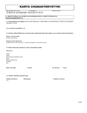 KARTA CHARAKTERYSTYKI Nr wewnętrzny: Data aktualizacji: 2011-10-21 Zastępuje wersję z: TURTLE EXTREME TEXTILTVÄTT 1. IDENTYFIKACJA SUBSTANCJI/MIESZANINY I IDENTYFIKACJA PRZEDSIĘBIORSTWA 1.1 Identyfikator produktu: PŁYN DO PRANIA TAPICERKI TKANINOWEJ TURTLE EXTREME TEXTILTVÄTT Nr wewnętrzny produktu: 246 1.2 Istotne zidentyfikowane zastosowania substancji lub mieszaniny oraz zastosowania odradzane: Zakres zastosowania: Środek czyszczący Zastosowania odradzane: Produktu nie wolno stosować w sposób niezgodny z przeznaczeniem. 1.3 Dane dotyczące dostawcy karty charakterystyki: Dostawca: Firma Adres Kod pocztowy/Miejscowość Kraj Strona internetowa Telefon Fax Imię i nazwisko E-mail Tel. (praca) Kraj 1.4 Numer telefonu alarmowego Telefon alarmowy 112 Informacja Godziny otwarcia 1 (12) KARTA CHARAKTERYSTYKI Data aktualizacji: 2011-10-21 Nr wewnętrzny: Zastępuje wersję z: TURTLE EXTREME TEXTILTVÄTT 2. IDENTYFIKACJA ZAGROŻEŃ 2.1 Klasyfikacja substancji lub mieszaniny F+, R12 Informacje ogólne Pojemnik pod ciśnieniem: Chronić przed światłem słonecznym. Nie wystawiać na działanie temperatury przekraczającej 50°C. Nie przekłuwać i nie palić - nawet po zużyciu. Zagrożenie dla zdrowia Brak znanych zagrożeń. Ryzyko pożaru i wybuchu. Produkt skrajnie łatwopalny. Pojemnik pod ciśnieniem może wybuchnąć w przypadku pożaru. Zagrożenie dla środowiska Brak znanych zagrożeń. 2.2 Elementy oznakowania Produkt skrajnie łatwopalny Zwroty R Nr R12 Treść zwrotu R Produkt skrajnie łatwopalny. Zwroty S S51 Stosować wyłącznie w dobrze wentylowanych pomieszczeniach. S23 Nie wdychać rozpylonej cieczy. 2.3 Inne zagrożenia Pojemnik pod ciśnieniem. Chronić przed światłem słonecznym. Nie wystawiać na działanie temperatury przekraczającej 50°C. Nie przekłuwać i nie palić. Dotyczy nawet pustego pojemnika. Nie rozpylać nad otwartym płomieniem lub żarzącym się materiałem. Nie przechowywać w pobliżu źródeł zapłonu – nie palić tytoniu. Chronić przed dziećmi. Zawiera >5 <15 % węglowodorów alifatycznych, < 5 % tenzydów anionowych, nipaginy (methylparabenu), perfum i Limonenu. 2 (12) KARTA CHARAKTERYSTYKI Data aktualizacji: 2011-10-21 Nr wewnętrzny: Zastępuje wersję z: TURTLE EXTREME TEXTILTVÄTT 3. SKŁAD/INFORMACJA O SKŁADNIKACH 3.2 Mieszaniny: Nr Nazwa substancji Nr indeksowy Nr WE Nr CAS Stężenie Klasyfikacja Klasyfikacja zgodnie z Dyrektywą zgodnie z Rady 67/458/EWG. rozporządzeniem Parlamentu Europejskiego i Rady z dnia 16 grudnia 2008r nr 1278/2008 (CLP). Substancja nie podlega klasyfikacji, jednak posiada graniczne wartości higieniczne F+, R12 Flam. Gas 1, Press. Gas 1 H220, H280 1 etylodiglikol 203-919-7 111-90-0 5-10 % 2 butan (zawierający < 0,1% butadienu 203450-8)) propan 203-448-7 106-97-8 5-10 % 200-827-9 74-98-6 1-5 % % roztwór amoniaku... % lauroilosarkozynian sodu metanol 215-647-6 1336-21-6 < 1 % 205-281-5 137-16-6 < 0,1 % C, N, R34 - R50 Xi, R41 200-659-6 67-56-1 T, F, R23/24/25 R39/23/24/25 - R11 3 4 5 6 < 0,1 % F+, R12 Flam. Gas 1, Press. Gas 1 H220, H280 Komentarze do składu Pełne brzmienie zwrotów R wymienionych w punkcie 3 znajduje się w punkcie 16. 4. ŚRODKI PIERWSZEJ POMOCY 4.1 Opis środków pierwszej pomocy Informacje ogólne Jeśli objawy utrzymują się, skontaktować się z lekarzem. Jeśli to możliwe, pokazać tę ulotkę. Wdychanie Poszkodowanego przenieść na świeże powietrze i zapewnić spokój. Zanieczyszczenie skóry Zanieczyszczoną skórę natychmiast przemyć dużą ilością wody z mydłem. Zanieczyszczenie oczu Zanieczyszczone oczy przemyć natychmiast dużą ilością wody aż do momentu ustąpienia podrażnienia. Połknięcie Wypić kilka szklanek wody lub mleka. Nie wywoływać wymiotów. 3 (12) KARTA CHARAKTERYSTYKI Data aktualizacji: 2011-10-21 Nr wewnętrzny: Zastępuje wersję z: TURTLE EXTREME TEXTILTVÄTT 4.2 Najważniejsze ostre i opóźnione objawy oraz skutki narażenia Wdychanie Wysokie stężenie może wywołać: Podrażnienia nosa, krtani i dróg oddechowych. Może wywołać ból głowy, zawroty głowy, poczucie zmęczenia i nudności. Zanieczyszczenie skóry Działa lekko drażniąco na skórę. Długotrwały lub powtarzający się kontakt ze skórą może powodować suchość i pęknięcia skóry. Zanieczyszczenie oczu Powoduje podrażnienia oczu i błon śluzowych. Połknięcie Połknięcie może wywołać: Pieczenie w jamie ustnej i przełyku. Bóle brzucha. Nudności i wymioty. 4.3 Wskazania dotyczące wszelkiej natychmiastowej pomocy lekarskiej i szczególnego postępowania z poszkodowanym Należy postępować zgodnie ze wskazaniami opisanymi w punkcie 4.1. 5. POSTĘPOWANIE W PRZYPADKU POŻARU 5.1 Środki gaśnicze: Pożar można ugasić proszkiem, pianą lub dwutlenkiem węgla. 5.2 Szczególne zagrożenia związane z substancją lub mieszaniną Ryzyko pożaru i wybuchu Nie narażać pojemnika pod ciśnieniem na temperaturę powyżej 50°C. Pojemnik pod ciśnieniem może wybuchnąć w przypadku pożaru. 5.3 Informacje dla straży pożarnej Środki ochrony indywidualnej na wypadek pożaru Podczas pożaru mogą utworzyć się szkodliwe dla zdrowia gazy. Nie wdychać gazów spalinowych. Strażacy powinni nosić aparaty oddechowe z niezależnym źródłem powietrza oraz kompletną odzież ochronną. Informacja Pojemniki zagrożone pożarem niezwłocznie usunąć z miejsca zagrożenia lub schłodzić wodą. Nie dopuszczać do przedostawania się zużytych środków gaśniczych do kanalizacji. 6. POSTĘPOWANIE W PRZYPADKU NIEZAMIERZONEGO UWOLNIENIA DO ŚRODOWISKA 6.1 Indywidualne środki ostrożności, wyposażenie ochronne i procedury w sytuacjach awaryjnych Stosować wyłącznie w dobrze wentylowanych pomieszczeniach Używać odpowiednich środków ochrony indywidualnej. Należy stosować środki ochrony indywidualnej wyszczególnione w punkcie 8. 4 (12) KARTA CHARAKTERYSTYKI Nr wewnętrzny: Data aktualizacji: 2011-10-21 Zastępuje wersję z: TURTLE EXTREME TEXTILTV