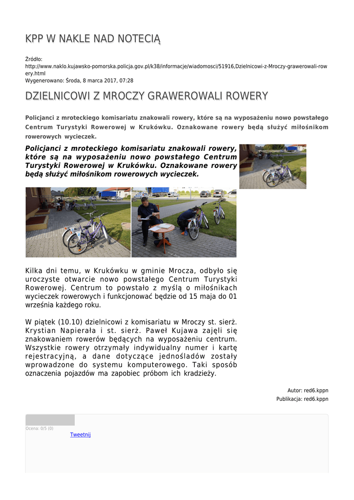 KPP W NAKLE NAD NOTECIĄ Źródło: http://www.naklo.kujawsko-pomorska.policja.gov.pl/k38/informacje/wiadomosci/51916,Dzielnicowi-z-Mroczy-grawerowali-row ery.html Wygenerowano: Środa, 8 marca 2017, 07:28 DZIELNICOWI Z MROCZY GRAWEROWALI ROWERY Policjanci z mroteckiego komisariatu znakowali rowery, które są na wyposażeniu nowo powstałego Centrum Turystyki Rowerowej w Krukówku. Oznakowane rowery będą służyć miłośnikom rowerowych wycieczek. Policjanci z mroteckiego komisariatu znakowali rowery, które są na wyposażeniu nowo powstałego Centrum Turystyki Rowerowej w Krukówku. Oznakowane rowery będą służyć miłośnikom rowerowych wycieczek. Kilka dni temu, w Krukówku w gminie Mrocza, odbyło się uroczyste otwarcie nowo powstałego Centrum Turystyki Rowerowej. Centrum to powstało z myślą o miłośnikach wycieczek rowerowych i funkcjonować będzie od 15 maja do 01 września każdego roku. W piątek (10.10) dzielnicowi z komisariatu w Mroczy st. sierż. Krystian Napierała i st. sierż. Paweł Kujawa zajęli się znakowaniem rowerów będących na wyposażeniu centrum. Wszystkie rowery otrzymały indywidualny numer i kartę rejestracyjną, a dane dotyczące jednośladów zostały wprowadzone do systemu komputerowego. Taki sposób oznaczenia pojazdów ma zapobiec próbom ich kradzieży. Autor: red6.kppn Publikacja: red6.kppn Ocena: 0/5 (0) Tweetnij
