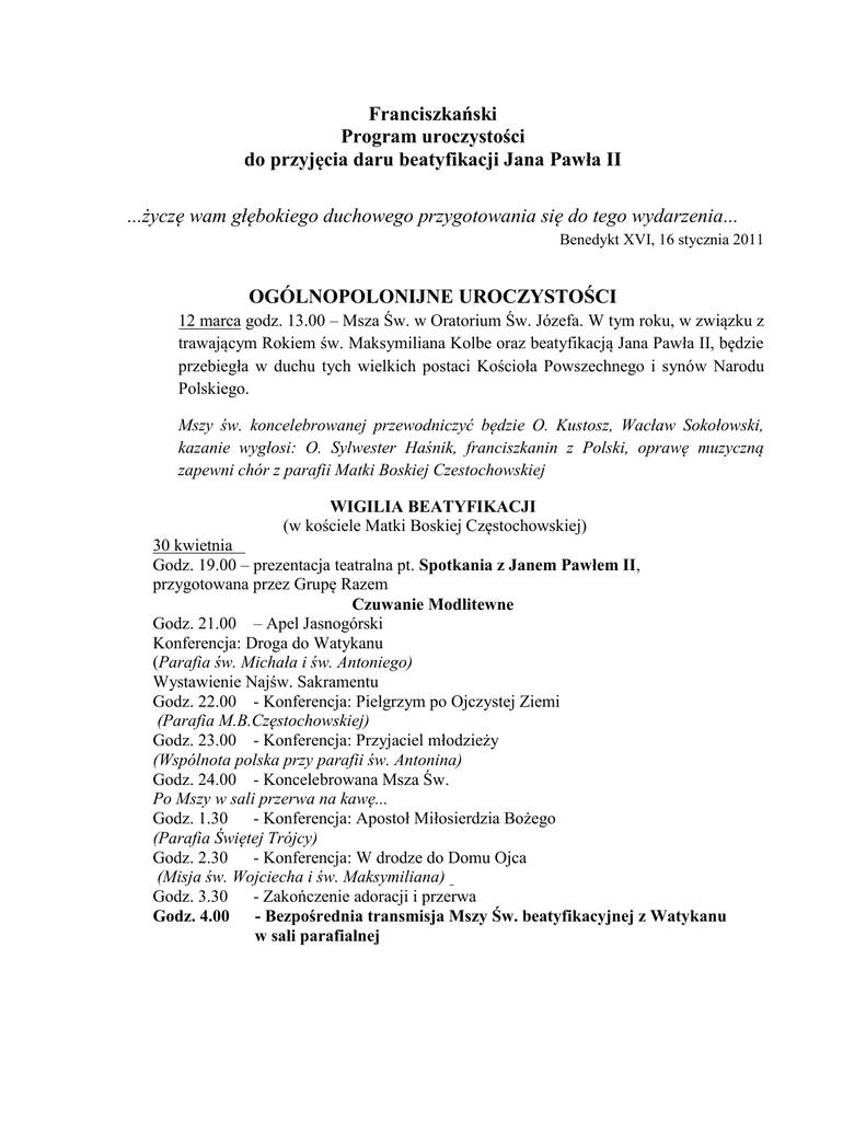 Franciszkański Program uroczystości do przyjęcia daru beatyfikacji Jana Pawła II ...życzę wam głębokiego duchowego przygotowania się do tego wydarzenia... Benedykt XVI, 16 stycznia 2011 OGÓLNOPOLONIJNE UROCZYSTOŚCI 12 marca godz. 13.00 – Msza Św. w Oratorium Św. Józefa. W tym roku, w związku z trawającym Rokiem św. Maksymiliana Kolbe oraz beatyfikacją Jana Pawła II, będzie przebiegła w duchu tych wielkich postaci Kościoła Powszechnego i synów Narodu Polskiego. Mszy św. koncelebrowanej przewodniczyć będzie O. Kustosz, Wacław Sokołowski, kazanie wygłosi: O. Sylwester Haśnik, franciszkanin z Polski, oprawę muzyczną zapewni chór z parafii Matki Boskiej Czestochowskiej WIGILIA BEATYFIKACJI (w kościele Matki Boskiej Częstochowskiej) 30 kwietnia Godz. 19.00 – prezentacja teatralna pt. Spotkania z Janem Pawłem II, przygotowana przez Grupę Razem Czuwanie Modlitewne Godz. 21.00 – Apel Jasnogórski Konferencja: Droga do Watykanu (Parafia św. Michała i św. Antoniego) Wystawienie Najśw. Sakramentu Godz. 22.00 - Konferencja: Pielgrzym po Ojczystej Ziemi (Parafia M.B.Częstochowskiej) Godz. 23.00 - Konferencja: Przyjaciel młodzieży (Wspólnota polska przy parafii św. Antonina) Godz. 24.00 - Koncelebrowana Msza Św. Po Mszy w sali przerwa na kawę... Godz. 1.30 - Konferencja: Apostoł Miłosierdzia Bożego (Parafia Świętej Trójcy) Godz. 2.30 - Konferencja: W drodze do Domu Ojca (Misja św. Wojciecha i św. Maksymiliana) Godz. 3.30 - Zakończenie adoracji i przerwa Godz. 4.00 - Bezpośrednia transmisja Mszy Św. beatyfikacyjnej z Watykanu w sali parafialnej DIECEZJALNA MSZA ŚW. DZIĘKCZYNNA 1 maja godz. 17.00 w katedrze Matki Bożej Królowej Świata pod przewodnictwem księdza kardynała Jean-Claude Turcotte z udziałem m.in. młodzieżowego zespołu muzycznego Soli Deo z parafii Matki Boskiej Częstochowskiej POLONIJNA MSZA ŚW. DZIĘKCZYNNA 22 maja godz. 17.00 w bazylice Oratorium Św. Józefa pod przewodnictwem księdza biskupa Andre Gazaille PRZYGOTOWANIA W OŚRODKACH DUSZPASTERSKICH Parafia Matki Boskiej Częstochowskiej W każdą ostatnią niedzielę miesiąca, bezpośrednio po Mszy Św. o godz. 11.30 wystawienie Najśw. Sakramentu i czuwanie modlitwne do godz. 16.00: 27 lutego, 27 marca, 30 kwietnia 2 kwietnia – w 6 rocznicę śmierci Ojca Świętego Jana Pawła II: Godz. 21.00 – Uroczysty Apel Jasnogórski pod pomnikiem Jana Pawła II z udziałem chóru parafialnego w programie Ojcu Świętemu śpiewajmy Parafia św. Michała i św. Antoniego W trzecie piątki miesiąca: Msza Św. o godz. 19.00 w połączeniu z nabożeństwem do Miłosierdzia Bożego z konferecją: Papież – Apostoł Miłosierdzia Bożego: 18 luty – 18 marca- 15 kwietnia-19 maja Misja św. Wojciecha i św. Maksymiliana: 3 kwietnia - 6 rocznica śmierci Jana Pawła II i 25 lecie szkoły im. Jana Pawła II Msza Święta oraz spektakl poświęcony Janowi Pawłowi II w wykonaniu uczniów. 1 maja Dzień Beatyfikacji - Niedziela Miłosierdzia - W czasie Mszy Świętej o godz. 11:45 uroczyste umieszczenie obrazu bł. Jana Pawła II. Po Mszy Świętej - Nabożeństwo Miłosierdzia Bożego z okolicznościowym, z audiowizualnym programem muzycznym w wykonaniu Chóru "Cantate Deo". 8 maja Ogólnopolonijne uroczystości 3 majowe i przypomnienie słów Jana Pawła II o wolności skierowane do Polaków. 19 maja Kino "WojMax" zaprasza na film o Janie Pawle II ze znanym aktorem Johnem Voight'em. Sala pod kościołem, godzina 19:00. Film w języku polskim. Wspólnota polska przy parafii św. Antonina W każdą pierwszą niedzielę miesiąca o godz. 12.30, są wspominane najważniejsze wydarzenie z pielgrzymki Jana Pawła II do Montrealu we wrześniu 1984 roku: 6 marca - spotkanie z młodzieżą na Stadionie Olimpijskim 3 kwietnia - Msza Św. w parku Jarry 1 maja – dzień beatyfikacji 5 czerwca – spotkanie z dziećmi w bazylice Notre-Dame