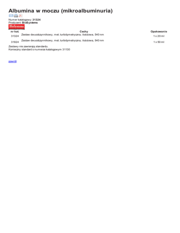 Albumina w moczu (mikroalbuminuria) Numer katalogowy: 31324 Producent: BioSystems nr kat. 31324 31924 Cechy Zestaw dwuodczynnikowy, met. turbidymetryczna, ilościowa, 540 nm Zestaw dwuodczynnikowy, met. turbidymetryczna, ilościowa, 540 nm Zestawy nie zawierają standardu. Konieczny standard o numerze katalogowym 31130 powrót Opakowanie 1 x 20 ml 1 x 50 ml