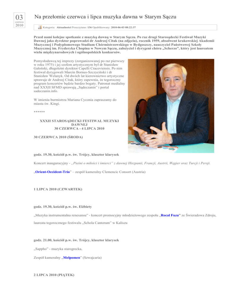 03 Na przełomie czerwca i lipca muzyka dawna w Starym Sączu czerwca 2010 Kategoria: Aktualności Przeczytano: 136 Opublikowany: 2010-06-03 08:22:37 Przed nami kolejne spotkanie z muzyką dawną w Starym Sączu. Po raz drugi Starosądecki Festiwal Muzyki Dawnej jako dyrektor poprowadzi dr Andrzej Citak (na zdjęciu), rocznik 1959, absolwent krakowskiej Akademii Muzycznej i Podyplomowego Studium Chórmistrzowskiego w Bydgoszczy, nauczyciel Państwowej Szkoły Muzycznej im. Fryderyka Chopina w Nowym Sączu, załoŜyciel i dyrygent chóru „Scherzo”, który jest laureatem wielu międzynarodowych i ogólnopolskich konkursów. Pomysłodawcą tej imprezy (zorganizowanej po raz pierwszy w roku 1975) i jej szefem artystycznym był dr Stanisław Gałoński, długoletni dyrektor Capelli Cracoviensis. Po nim festiwal dyrygowali Marcin Bornus-Szczyciński i dr Stanisław Welanyk. Od dwóch lat kierownictwo artystyczne sprawuje dr Andrzej Citak, który zapewnia, Ŝe tegoroczny program koncertów będzie bardzo bogaty. Patronat medialny nad XXXII SFMD sprawują „Sądeczanin” i portal sadeczanin.info. W imieniu burmistrza Mariana Cyconia zapraszamy do miasta św. Kingi. ****** XXXII STAROSĄDECKI FESTIWAL MUZYKI DAWNEJ 30 CZERWCA - 4 LIPCA 2010 30 CZERWCA 2010 (ŚRODA) godz. 19.30, kościół p.w. św. Trójcy, klasztor klarysek Koncert inauguracyjny - „Pieśni o miłości i śmierci” z dawnej Hiszpanii, Francji, Austrii, Węgier oraz Turcji i Persji. „Orient-Occident-Trio” – zespół kameralny Clemencic Consort (Austria) 1 LIPCA 2010 (CZWARTEK) godz. 19.30, kościół p.w. św. ElŜbiety „Muzyka instrumentalna renesansu” - koncert promocyjny młodzieŜowego zespołu „Rocal Fuza” ze Świeradowa Zdroju, laureata tegorocznego festiwalu „Schola Cantorum” w Kaliszu godz. 21.00, kościół p.w. św. Trójcy, klasztor klarysek „Sappho” - muzyka starogrecka, Zespół kameralny „Melpomen” (Szwajcaria) 2 LIPCA 2010 (PIĄTEK) godz. 19.00, sala widowiskowa MCK SOKÓŁ w Nowym Sączu spektakl taneczno-pantomimiczny „Taneczny świat Chopina”, Balet Dworski „Cracovia Danza”, godz. 21.00, kościół p.w. św. Trójcy, klasztor klarysek „Muzyka katedr i wiejskich chat” – fragmenty mszalne Johannesa Ockeghema oraz ludowe hymny Estonii, zespół wokalny „Heinavanker” (Estonia) 3 LIPCA 2010 (SOBOTA) godz. 19.30, kościół p.w. św. ElŜbiety Muzyka wokalno-instrumentalna baroku, zespół muzyki dawnej „Musica Maxima” (Poznań) godz. 21.00, kościół p.w. św. Trójcy, klasztor klarysek „Filia praeclara“ – muzyka klasztorów klarysek, zespół wokalny „Peregrina” (Szwajcaria) 4 LIPCA 2010 (NIEDZIELA) godz. 21.00, sala widowiskowa kina „Sokół” w Starym Sączu Koncert finałowy - „Tańce i zabawy renesansu i baroku”, widowisko muzyczne dziecięcego zespołu muzyki dawnej „Scholares Minores pro Musica Antiqua” z Poniatowej Koncerty towarzyszące 2 LIPCA 2010 (PIĄTEK) godz. 19.00, kościół parafialny w Barcicach „Muzyka instrumentalna renesansu”, MłodzieŜowy zespół „Rocal Fuza” ze Świeradowa Zdroju 4 LIPCA 2010 (NIEDZIELA) godz. 16.00, sala koncertowa Pijalni Głównej w Krynicy „Tańce i zabawy renesansu i baroku” - widowisko muzyczne dziecięcego zespołu muzyki dawnej „Scholares Minores pro Musica Antiqua” z Poniatowej godz. 19.00, kościół p.w. Apostołów Piotra i Pawła w Krakowie „Muzyka katedr i wiejskich chat” - zespół wokalny „Heinavanker” (Estonia) Wstęp na wszystkie koncerty jest wolny! Organizator: Centrum Kultury i Sztuki im. Ady Sari w Starym Sączu (dyrektor Marta Radziejewska). (PG) Fot. PG, JEC