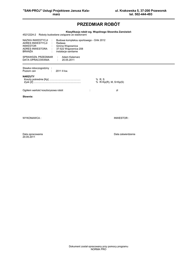 "SAN-PROJ" Usługi Projektowe Janusz Kalamarz ul. Krakowska 5, 37-200 Przeworsk tel. 502-444-493 PRZEDMIAR ROBÓT 45212224-2 Klasyfikacja robót wg. Wspólnego Słownika Zamówień Roboty budowlane związane ze stadionami NAZWA INWESTYCJI ADRES INWESTYCJI INWESTOR ADRES INWESTORA BRANŻA : : : : : SPRAWDZIŁ PRZEDMIAR DATA OPRACOWANIA Stawka roboczogodziny : Poziom cen : Budowa kompleksu sportowego - Orlik 2012 Radawa Gmina Wiązownica 37-522 Wiązownica 208 instalacje sanitarne : : Adam Kalamarz 20.05.2011 2011 II kw. NARZUTY Koszty pośrednie [Kp] ............................................ Zysk [Z] .................................................................. Ogółem wartość kosztorysowa robót % R, S % R+Kp(R), M, S+Kp(S) : zł Słownie: WYKONAWCA : INWESTOR : Data opracowania 20.05.2011 Data zatwierdzenia Dokument został opracowany przy pomocy programu NORMA PRO Instalacje sanitarne Lp. Instalacje sanitarne 1 Przyłącz kanalizacji sanitarnej 2 Kanalizacja deszczowa i drenaż 3 Przyłącz wodociągowy 4 Instalacja wodociagowa 5 Instalacja kanalizacyjna 6 Ogrzewanie i wentylacja DZIAŁY KOSZTORYSU Nazwa działu Od 1.1 2.1 3.1 4.1 5.1 6.1 -2- Norma PRO Wersja 4.26 Licencja: 20474 dla Zakład Usług Projektowych Grzegorz Kalamarz Przeworsk Do 1.7 2.12 3.7 4.17 5.17 6.7 Instalacje sanitarne Lp. Podstawa Instalacje sanitarne 1 1.1 KNR-W 2-01 0212-06 1.2 KNR-W 2-01 0306-01 1.3 KNR-W 2-01 0215-04 1.4 KNR-W 2-01 0222-01 1.5 KNR-W 2-01 0312-01 1.6 KNR-W 2-18 0408-02 1.7 KNR-W 2-18 0516-05 analogia 2 2.1 KNR-W 2-01 0212-06 2.2 KNR-W 2-01 0306-01 2.3 2.4 2.5 2.6 2.7 2.8 2.9 2.10 2.11 2.12 3 3.1 3.2 3.3 3.4 3.5 3.6 3.7 4 4.1 4.2 4.3 4.4 PRZEDMIAR Opis Jedn.obm. Przyłącz kanalizacji sanitarnej Wykopy oraz przekopy wykonywane koparkami podsiębiernymi 0.40 m3 na odkład w gruncie kat.III Ręczne wykopy wąskoprzestrzenne lub jamiste ze skarpami o szerokości dna do 1.5 m i głębokości do 1.5 m ze złożeniem urobku na odkład (kat.gr.I-II) Wykopy jamiste wykonywane koparkami podsiębiernymi 0.25 m3 na odkład w gruncie kat. III Zasypywanie wykopów spycharkami z przemieszczeniem gruntu na odl. do 10 m w gruncie kat. I-III Zasypywanie wykopów liniowych o ścianach pionowych głębokości do 1.5 m i szer. 0.8-1.5 m; kat. gr. I-II Kanały z rur PVC łączonych na wcisk o śr. zewn. 160 mm Zbiornik bezodpływowy żelbetowy 10 m3 Kanalizacja deszczowa i drenaż Wykopy oraz przekopy wykonywane koparkami podsiębiernymi 0.40 m3 na odkład w gruncie kat.III Ręczne wykopy wąskoprzestrzenne lub jamiste ze skarpami o szerokości dna do 1.5 m i głębokości do 1.5 m ze złożeniem urobku na odkład (kat.gr.I-II) Zasypywanie wykopów spycharkami z przemieszczeKNR-W 2-01 niem gruntu na odl. do 10 m w gruncie kat. I-III 0222-01 Zasypywanie wykopów liniowych o ścianach pionowych KNR-W 2-01 głębokości do 1.5 m i szer. 0.8-1.5 m; kat. gr. I-II 0312-01 KNR 2-31 0601- Sączki podłużne PVC fi 75 mm wraz z obsypaniem żwirem i pospółką 07 Kanały z rur PVC łączonych na wcisk o śr. zewn. 160 KNR-W 2-18 mm 0408-02 Kanały z rur PVC łączonych na wcisk o śr. zewn. 200 KNR-W 2-18 mm 0408-03 Studzienki kanalizacyjne systemowe o śr 425 mm - zaKNR-W 2-18 mknięcie rurą teleskopową i włazem żeliwnym 0517-02 Trójnik PVC o śr. 200/75 mm analiza indywidualna Studzienki ściekowe uliczne betonowe o śr.500 mm z KNR-W 2-18 osadnikiem bez syfonu 0524-02 KNR 2-11 1601- Wyloty drenarskie W-1 o śr. 20 cm (skarpy umocnione korytkami betonowymi) 03 Umocnienie skarp i dna kanałów płytami prefabrykowaKNR-W 2-01 nymi ażurowymi "Jomb" - płyty z odzysku 0520-01 Przyłącz wodociągowy Ręczne wykopy wąskoprzestrzenne lub jamiste ze skarKNR-W 2-01 pami o szerokości dna do 1.5 m i głębokości do 1.5 m 0306-01 ze złożeniem urobku na odkład (kat.gr.I-II) Zasypywanie wykopów liniowych o ścianach pionowych KNR-W 2-01 głębokości do 1.5 m i szer. 0.8-1.5 m; kat. gr. I-II 0312-01 Wbudowanie do rurociagu - trójnik kielichowo-kołnierzoKNR-W 2-18 wy MMA nr 8525 o śr.zewn. 63/50 mm 0123-02 Zasuwy typu"E" kielichowo-kołnierzowe nr 4041E2 z KNR-W 2-18 obudową i skrzynką o śr.50 mm 0211-01 KNR 2-28 0314- Przyłącza wodociągowe z rur ciśnieniowych PE o śr. zewn. 63 mm 04 KNR 2-28 0316- Próba szczelności sieci wodociągowych z rur z tworzyw sztucznych o śr. zewn. do 110 mm 01 KNR 2-28 0408- Studnia wodomierzowa mrozoodporna o śr. 400 mm i wysokości 1.5 m, kompletnym uzbrojeniem, zaworem 01 antyskażeniowym EA i wodomierzem DN 20 kalk. własna Instalacja wodociagowa Rurociągi stalowe ocynkowane o śr.nominalnej 15 mm o KNR-W 2-15 połączeniach gwintowanych, na ścianach w budynkach 0106-01 niemieszkalnych Rurociągi stalowe ocynkowane o śr.nominalnej 20 mm o KNR-W 2-15 połączeniach gwintowanych, na ścianach w budynkach 0106-02 niemieszkalnych Rurociągi stalowe ocynkowane o śr.nominalnej 25 mm o KNR-W 2-15 połączeniach gwintowanych, na ścianach w budynkach 0106-03 niemieszkalnych KNR 2-28 0302- Rury PE ciśnieniowe o śr. zewn. 32 mm w gruncie 01 -3- Norma PRO Wersja 4.26 Licencja: 20474 dla Zakład Usług Projektowych Grzegorz Kalamarz Przeworsk Ilość m3 5.60 m3 1.40 m3 27.00 m3 22.60 m3 1.40 m 6.00 stud. 1.00 m3 320.00 m3 80.00 m3 320.00 m3 80.00 m 662.00 m 57.00 m 117.00 szt 8.00 szt 18.00 szt. 1.00 wylot. 1.00 m2 12.00 m3 131.40 m3 131.40 szt. 1.00 kpl. 1.00 m 147.00 prób. 1.00 szt. 1.00 m 24.00 m 17.00 m 29.00 m 5.50 Cena jedn. Wartość Instalacje sanitarne PRZEDMIAR Lp. Podstawa 4.5 KNR-W 2-15 0115-01 4.6 4.7 4.8 4.9 4.10 4.11 4.12 4.13 4.14 4.15 4.16 4.17 5 5.1 5.2 5.3 5.4 5.5 5.6 5.7 5.8 5.9 5.10 5.11 5.12 5.13 5.14 5.15 5.16 5.17 6 6.1 Opis Dodatki za podejścia dopływowe w rurociągach stalowych do zaworów czerpalnych, baterii, mieszaczy, hydrantów itp. o połączeniu sztywnym o śr. nominalnej 15 mm Dodatki za podejścia dopływowe w rurociągach staloKNR-W 2-15 wych do płuczek ustępowych o połączeniu sztywnym o 0115-07 śr. nominalnej 15 mm Próba szczeln