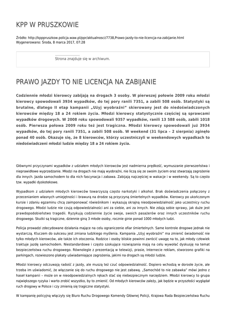 KPP W PRUSZKOWIE Źródło: http://kpppruszkow.policja.waw.pl/ppr/aktualnosci/7738,Prawo-jazdy-to-nie-licencja-na-zabijanie.html Wygenerowano: Środa, 8 marca 2017, 07:28 Strona znajduje się w archiwum. PRAWO JAZDY TO NIE LICENCJA NA ZABIJANIE Codziennie młodzi kierowcy zabijają na drogach 3 osoby. W pierwszej połowie 2009 roku młodzi kierowcy spowodowali 3934 wypadków, do tej pory ranili 7351, a zabili 508 osób. Statystyki są brutalne, dlatego II etap kampanii „Użyj wyobraźni” skierowany jest do niedoświadczonych kierowców między 18 a 24 rokiem życia. Młodzi kierowcy statystycznie częściej są sprawcami wypadków drogowych. W 2008 roku spowodowali 9357 wypadków, ranili 13 588 osób, zabili 1018 osób. Pierwsza połowa 2009 roku też jest tragiczna. Młodzi kierowcy spowodowali już 3934 wypadków, do tej pory ranili 7351, a zabili 508 osób. W weekend (31 lipca – 2 sierpnia) zginęło ponad 40 osób. Okazuje się, że 8 kierowców, którzy uczestniczyli w weekendowych wypadkach to niedoświadczeni młodzi ludzie między 18 a 24 rokiem życia. Głównymi przyczynami wypadków z udziałem młodych kierowców jest nadmierna prędkość, wymuszanie pierwszeństwa i nieprawidłowe wyprzedzanie. Młodzi na drogach nie mają wyobraźni, nie liczą się ze swoim życiem oraz stwarzają zagrożenie dla innych. Jazda samochodem to dla nich fascynacja i zabawa. Zabijają najczęściej w wakacje i w weekendy. Są to często tzw. wypadki dyskotekowe. Wypadkom z udziałem młodych kierowców towarzyszą często narkotyki i alkohol. Brak doświadczenia połączony z przecenianiem własnych umiejętności i brawurą na drodze są przyczyną śmiertelnych wypadków. Kierowcy po ukończonym kursie i zdaniu egzaminu chcą zaimponować rówieśnikom i wykazują skrajną nieodpowiedzialność jako uczestnicy ruchu drogowego. Młodzi ludzie nie czują odpowiedzialności ani za siebie, ani za innych. Nie zdają sobie sprawy, jak duże jest prawdopodobieństwo tragedii. Ryzykują codziennie życie swoje, swoich pasażerów oraz innych uczestników ruchu drogowego. Skutki są tragiczne, dziennie giną 3 młode osoby, rocznie ginie ponad 1000 młodych ludzi. Policja prowadzi zdecydowane działania mające na celu ograniczenie ofiar śmiertelnych. Same kontrole drogowe jednak nie wystarczą. Kluczem do sukcesu jest zmiana ludzkiego myślenia. Kampania „Użyj wyobraźni” ma zmienić świadomość nie tylko młodych kierowców, ale także ich otoczenia. Rodzice i osoby bliskie powinni zwrócić uwagę na to, jak młody człowiek traktuje jazdę samochodem. Niestandardowe i często szokujące rozwiązania mają na celu wywołać dyskusję na temat bezpieczeństwa ruchu drogowego. Równolegle z prezentacją w telewizji, prasie, Internecie reklam, stworzono grafiki na parkingach, rozwieszono plakaty uświadamiające zagrożenia, jakimi na drogach są młodzi ludzie. Młodzi kierowcy odczuwają radość z jazdy, ale muszą też czuć odpowiedzialność. Dopiero wchodzą w dorosłe życie, ale trzeba im uświadomić, że włączanie się do ruchu drogowego nie jest zabawą. „Samochód to nie zabawka” mówi jedno z haseł kampanii – może on w nieodpowiedzialnych rękach stać się niebezpiecznym narzędziem. Młodzi kierowcy to grupa największego ryzyka i warto zrobić wszystko, by to zmienić. Od młodych kierowców zależy, jak będzie w przyszłości wyglądał ruch drogowy w Polsce i czy zmienią się tragiczne statystyki. W kampanię policyjną włączyły się Biuro Ruchu Drogowego Komendy Głównej Policji, Krajowa Rada Bezpieczeństwa Ruchu Drogowego i PZU. dn/kgp Ocena: 0/5 (0) Tweetnij