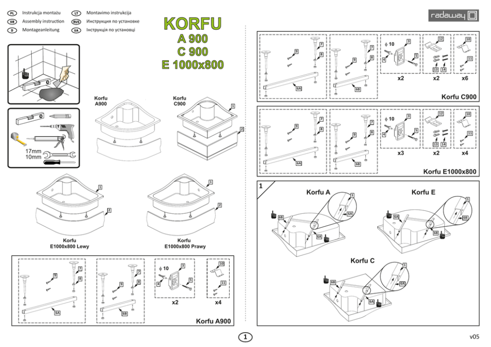 Instrukcja montażu Montavimo instrukcija Assembly instruction Инструкция по установке Montageanleitung Інструкція по установці KORFU A 900 C 900 E 1000x800 9 12 3 7 7 8 8 9 5 4 11 13 x2 6A Korfu A900 10 14 x2 x6 6B Korfu C900 Korfu C900 1 9 2 12 3 7 10 7 8 8 9 5 4 11 13 17mm 10mm x3 6A x2 14 x4 6B Korfu E1000x800 1 1 1 Korfu A 2 9 6B 6B Korfu C 10 1 7 8 8 9 1 5 4 x2 6A 6A 6A Korfu E1000x800 Prawy 7 1 6A 6B 3 1 1 2 Korfu E1000x800 Lewy Korfu E 1 6B 11 x4 6A 6A 6B Korfu A900 1 v05 2 3 1 5 7 9 8 8 6B 6A Korfu E 3 3 x3 x3 7 3 8 6B 6 17mm 4 x 1 7 6 Korfu A, E Korfu A 3 3 x x 11 x8 x x 2 x x 4 5 6 x 50 x 5 5 Korfu A 10mm Korfu C 8 x12 10 x6 3 x2 x4 11 Korfu C 3 10 1 x2 Korfu E 2 11 x8 3 3 x2 3 3 x x2 3 x x x 2 x4 10 9 Korfu A 9 1 Korfu C 1 1 1 10 24h 10 10 10 2 SILIKON 24h 2 SI 2 SILIKON LIK ON 13 1 SI LIK ON 2 35-45mm 9 Korfu E 1 1 10 10 24h 2 SILIKON 12 2 13 SI 14 LIK ON 1 2 35-45mm RADAWAY Sp. z o. o. Jasin, ul. Rabowicka 59, 62-020 Swarzędz, Polska tel. +48 61 835 75 10, fax +48 61 835 75 17, e-mail: offi[email protected], www.radaway.pl 12 2 14