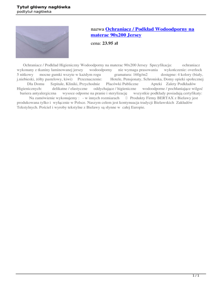 Tytuł główny nagłówka podtytuł nagłówka nazwa Ochraniacz / Podkład Wodoodporny na materac 90x200 Jersey cena: 23.95 zł Ochraniacz / Podkład Higieniczny Wodoodporny na materac 90x200 Jersey Specyfikacja: ochraniacz wykonany z tkaniny laminowanej jersey wodoodporny nie wymaga prasowania wykończenie: overlock 5 nitkowy mocne gumki wszyte w każdym rogu gramatura: 160g/m2 dostępne: 4 kolory (biały, j.niebieski, żółty pastelowy, kiwi) Przeznaczenie: Hotele, Pensjonaty, Schroniska, Domy opieki społecznej Dla Domu Szpitale, Kliniki, Przychodnie Placówki Publiczne Apteki Zalety Podkładów Higienicznych: delikatne / elastyczne oddychające / higieniczne wodoodporne / pochłaniające wilgoć bariera antyalergiczna wysoce odporne na pranie i sterylizację wszystkie podkłady posiadają certyfikaty: Na zamówienie wykonujemy : - w innych rozmiarach Produkty Firmy BERTAX z Bielawy jest produkowana tylko i wyłącznie w Polsce. Naszym celem jest kontynuacja tradycji Bielawskich Zakładów Tekstylnych. Pościel i wyroby tekstylne z Bielawy są słynne w całej Europie. 1/1