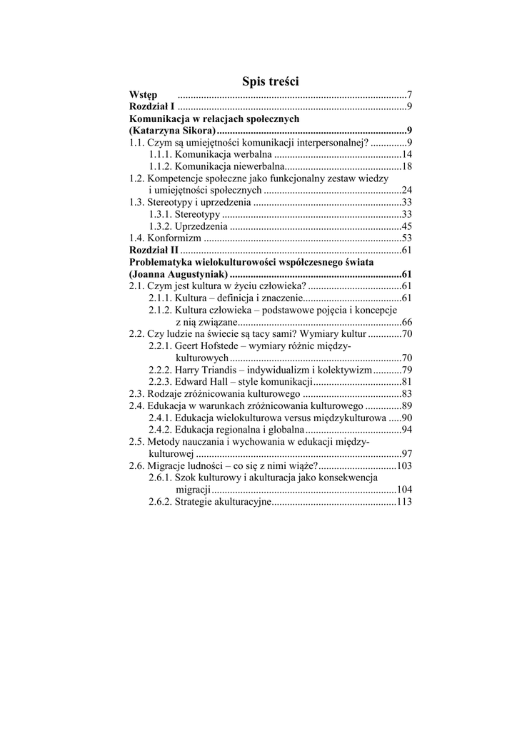 Spis treści Wstęp ........................................................................................7 Rozdział I ........................................................................................9 Komunikacja w relacjach społecznych (Katarzyna Sikora) .........................................................................9 1.1. Czym są umiejętności komunikacji interpersonalnej? ..............9 1.1.1. Komunikacja werbalna .................................................14 1.1.2. Komunikacja niewerbalna.............................................18 1.2. Kompetencje społeczne jako funkcjonalny zestaw wiedzy i umiejętności społecznych .....................................................24 1.3. Stereotypy i uprzedzenia .........................................................33 1.3.1. Stereotypy .....................................................................33 1.3.2. Uprzedzenia ..................................................................45 1.4. Konformizm ............................................................................53 Rozdział II .....................................................................................61 Problematyka wielokulturowości współczesnego świata (Joanna Augustyniak) ..................................................................61 2.1. Czym jest kultura w życiu człowieka? ....................................61 2.1.1. Kultura – definicja i znaczenie......................................61 2.1.2. Kultura człowieka – podstawowe pojęcia i koncepcje z nią związane...............................................................66 2.2. Czy ludzie na świecie są tacy sami? Wymiary kultur .............70 2.2.1. Geert Hofstede – wymiary różnic międzykulturowych ..................................................................70 2.2.2. Harry Triandis – indywidualizm i kolektywizm ...........79 2.2.3. Edward Hall – style komunikacji ..................................81 2.3. Rodzaje zróżnicowania kulturowego ......................................83 2.4. Edukacja w warunkach zróżnicowania kulturowego ..............89 2.4.1. Edukacja wielokulturowa versus międzykulturowa .....90 2.4.2. Edukacja regionalna i globalna .....................................94 2.5. Metody nauczania i wychowania w edukacji międzykulturowej ...............................................................................97 2.6. Migracje ludności – co się z nimi wiąże? ..............................103 2.6.1. Szok kulturowy i akulturacja jako konsekwencja migracji .......................................................................104 2.6.2. Strategie akulturacyjne................................................113 2.7. Migracje zagraniczne Polaków ............................................. 115 2.7.1. Migracje zagraniczne z Polski – rys historyczny ....... 115 2.7.2. Migracje ludności polskiej po akcesji w 2004 roku ... 118 2.7.3. Typologia współczesnego polskiego emigranta ......... 119 2.8. Psychologiczne i psychospołeczne konsekwencje uchodźstwa ....................................................................................... 121 2.8.1. Uchodźstwo – ujęcie definicyjnie i podstawy prawne ........................................................................ 121 2.8.2. Psychologiczne aspekty uchodźstwa .......................... 123 Literatura .................................................................................... 127 Spis tabel i wykresów ................................................................. 137 Słownik pojęć .............................................................................. 139